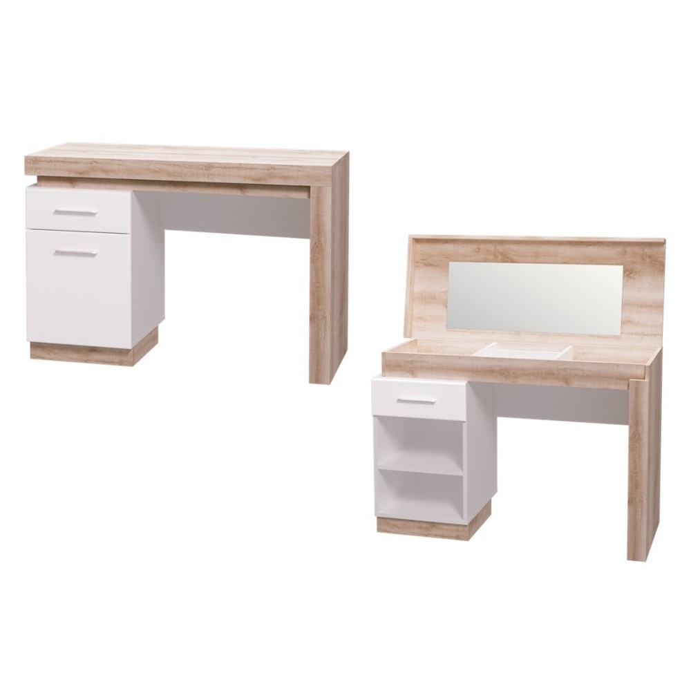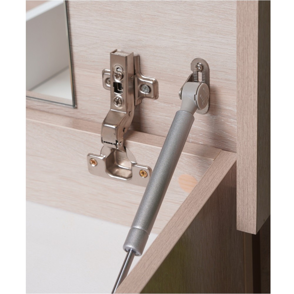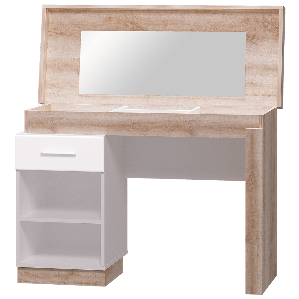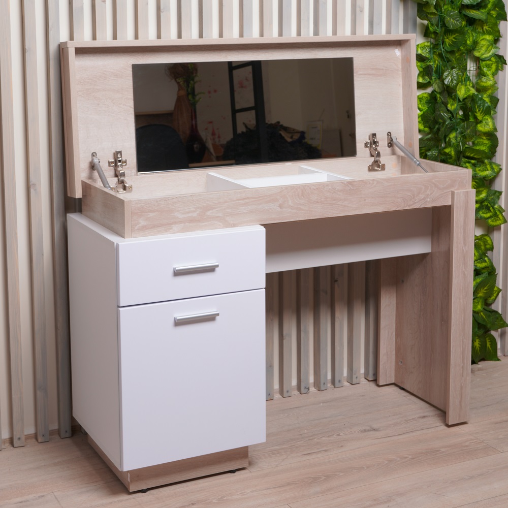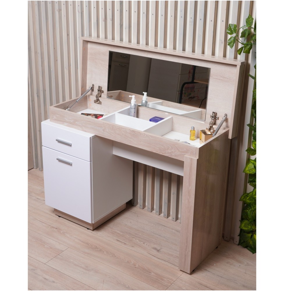 Туалетный столик Люмен с откидной столешницей, за которой вы найдете зеркало и отсеки для хранения украшений и кремов. Коллекция представлена в следующем цветовом решении: