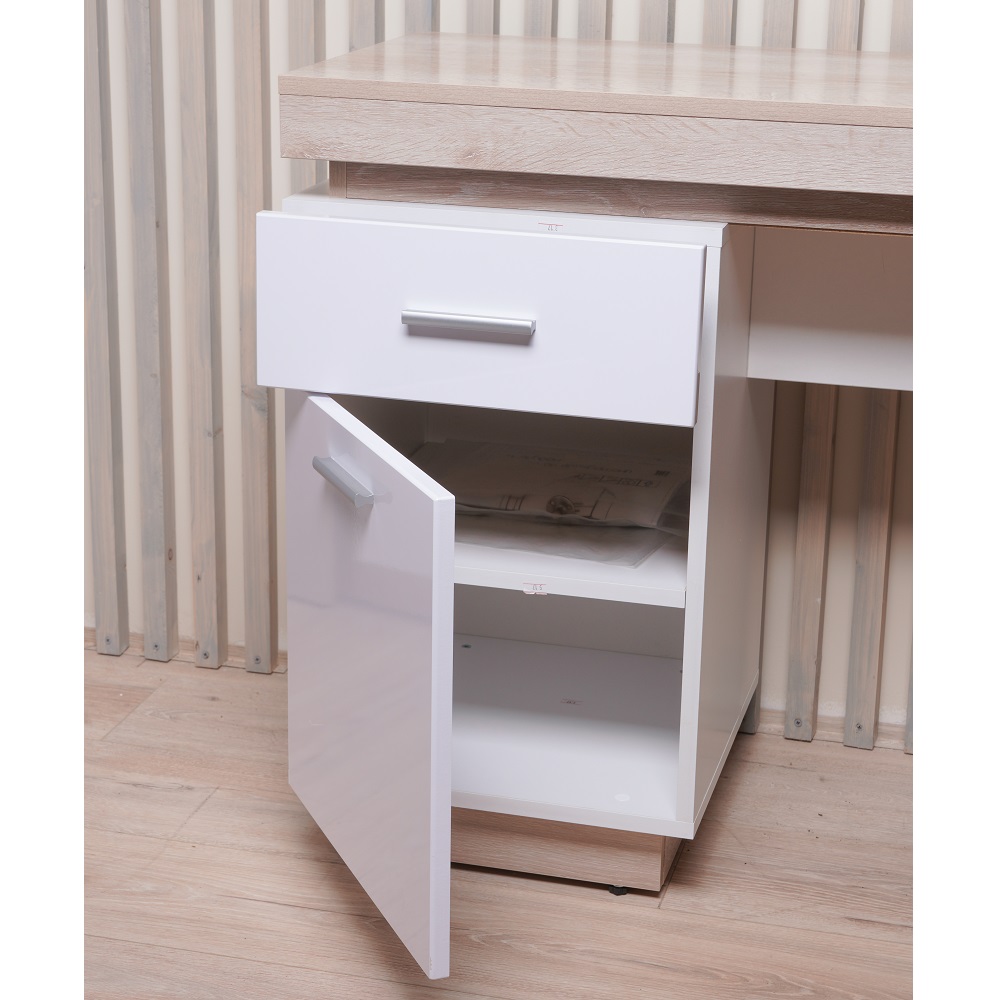 - Корпус ЛДСП 16 мм в декоре «Дуб Сакраменто» и фасад МДФ 16 мм в декоре «Белый снег»