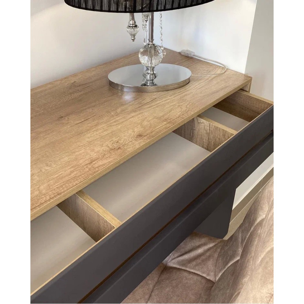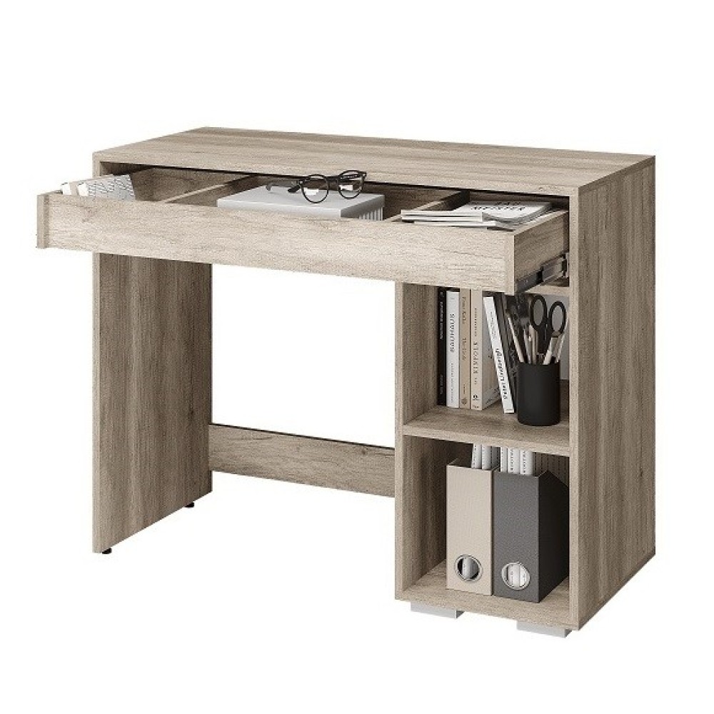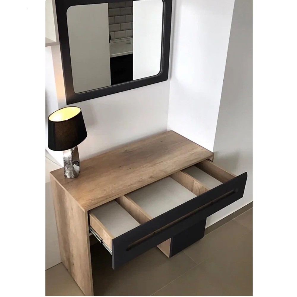 Туалетный стол с широким ящиком и двумя закрытыми нишами. Благодаря универсальной конструкции может использоваться не только в процессе нанесения макияжа, но и для работы или учебы, как письменный стол.