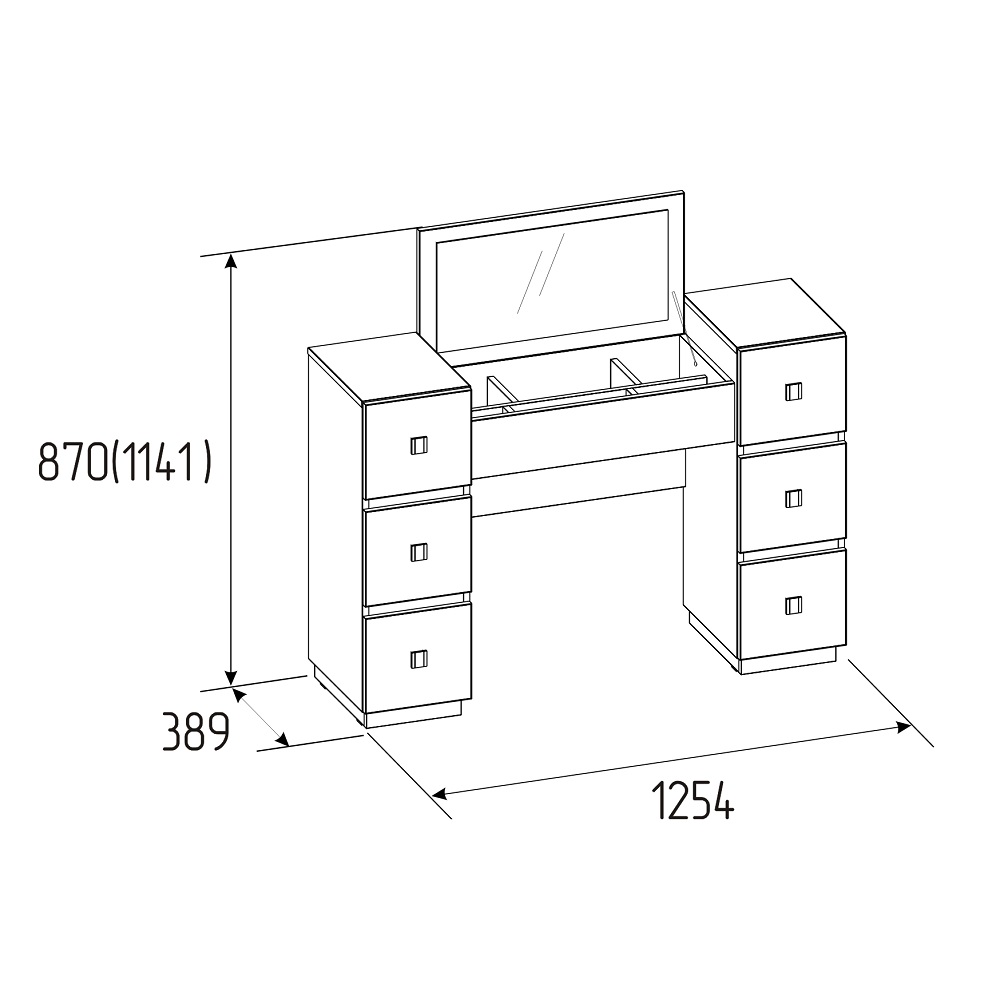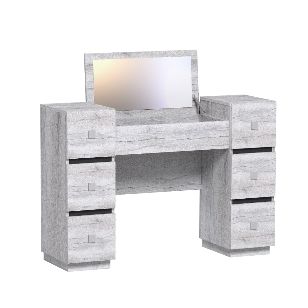 Идеальный туалетный столик для ежедневного ухода за собой. Модуль оснащен 6-ью ящиками (ШхГхВ каждого 20х30х15 см) и откидной крышкой с зеркалом, под которой расположена скрытая ниша.