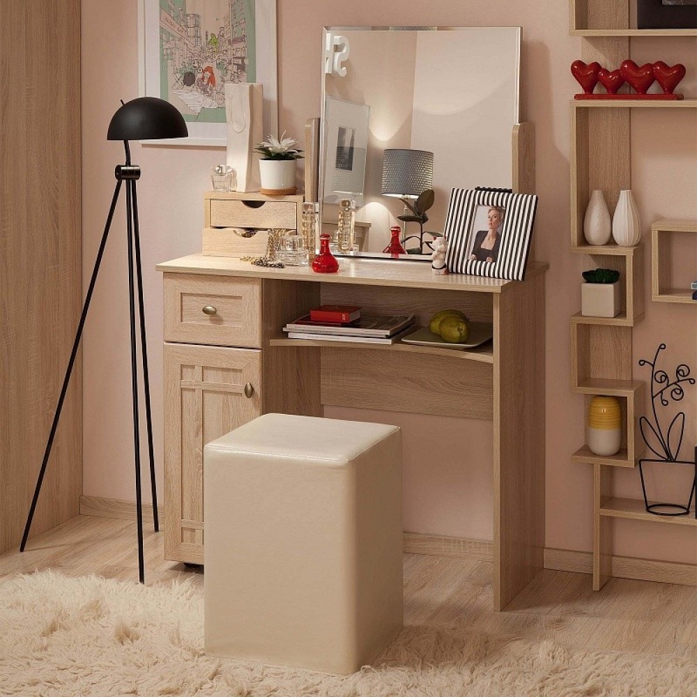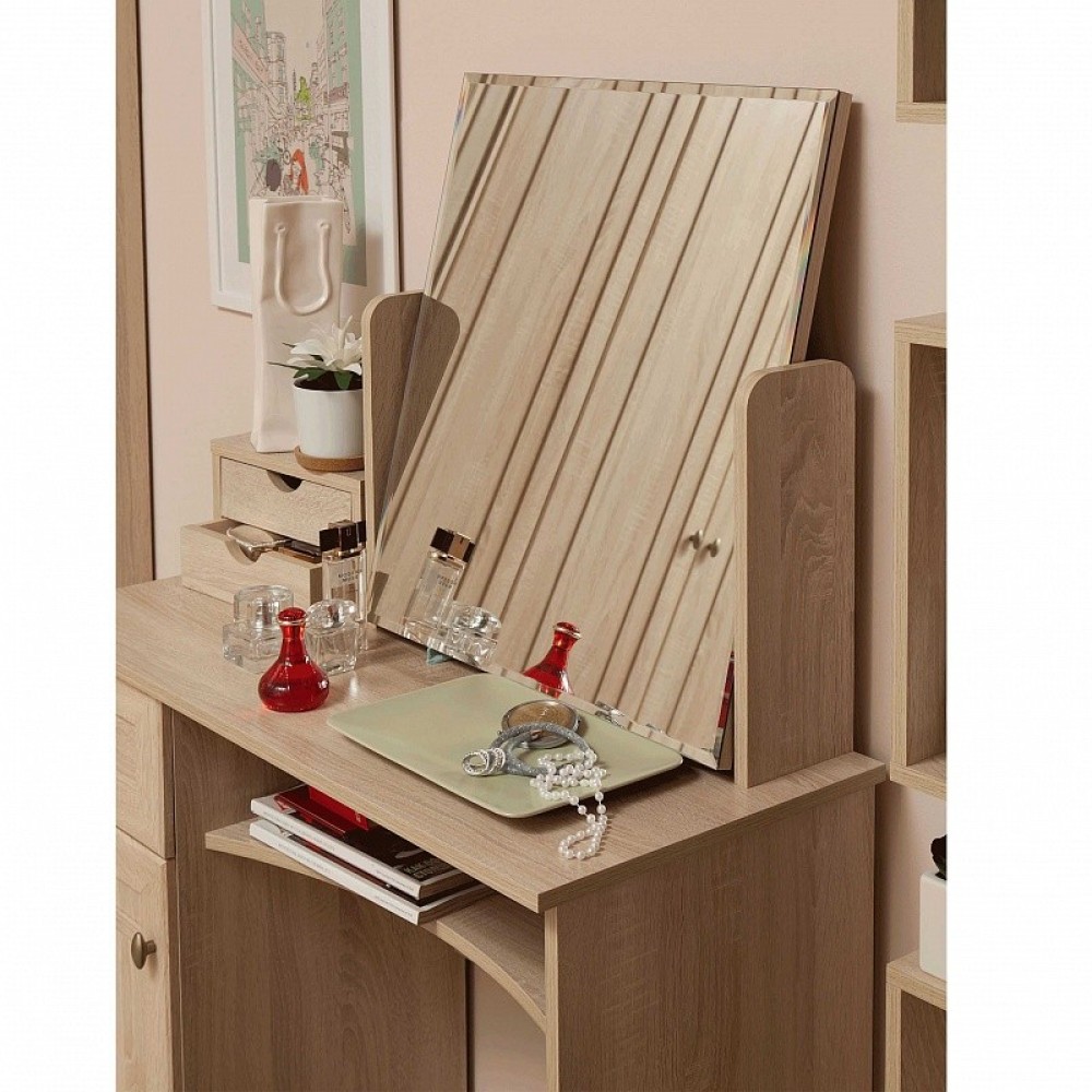 В поисках компактного туалетного столика обратите внимание на классическую модель Sherlock 53. Стол оснащен выдвижным ящиком и встроенной тумбой для хранения вещей. Шариковые направляющие на ящике обеспечивают его полное, плавное и бесшумное выдвижение. За рамочным фасадом из МДФ расположена вместительная ниша с полкой, регулируемой по высоте. Модель может использоваться как центральный элемент женского уголка, и как письменный стол для ежедневной работы за ноутбуком и документами.