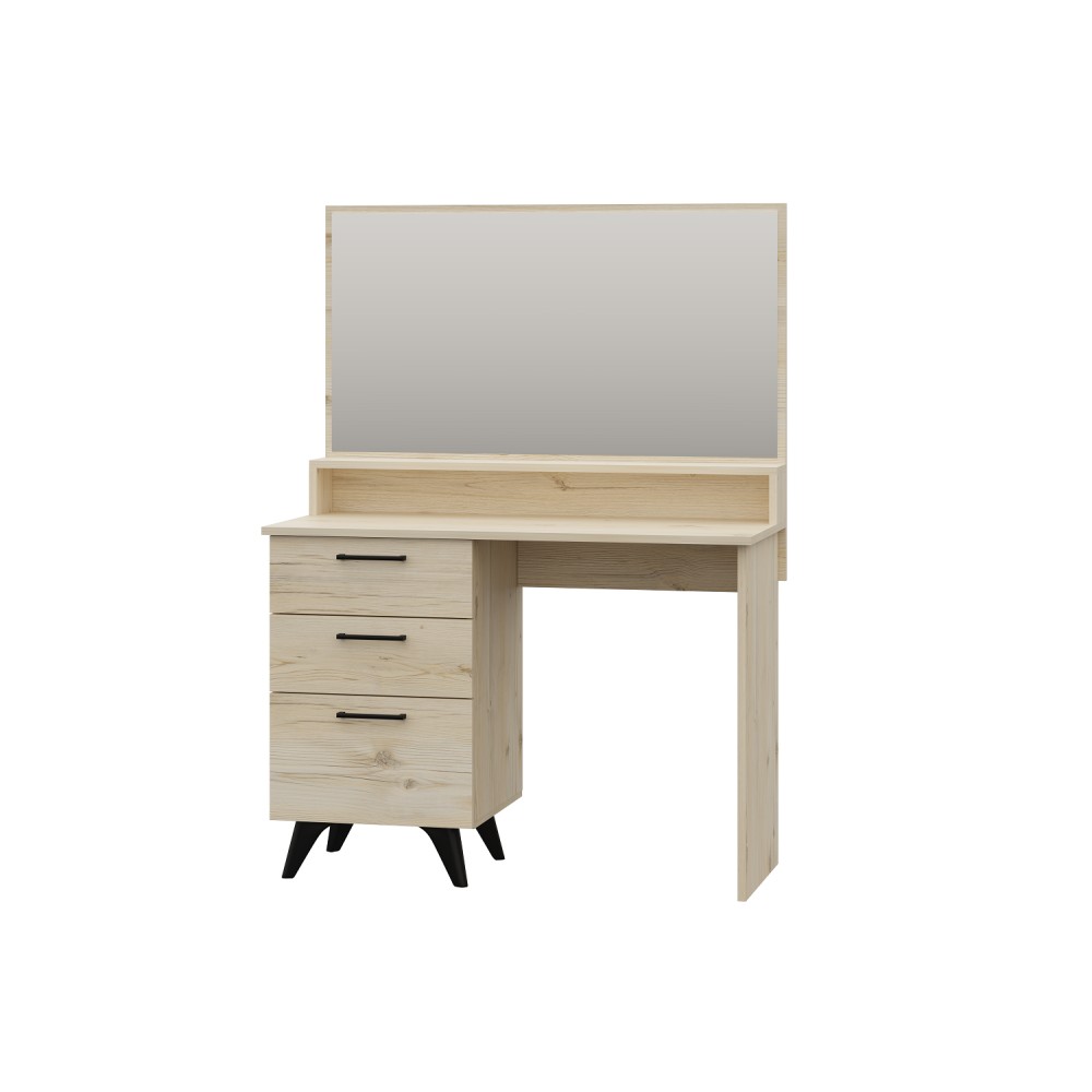 Туалетный столик с зеркалом из модульной коллекции Sofia прекрасно впишется в современный интерьер Вашей спальни и позволит держать свой внешний вид под контролем. Модель оснащена тремя выкатными ящиками на шариковых направляющих полного, плавного и бесшумного выдвижения, просторной столешницей, открытой широкой полкой и зеркалом. Черные опоры гармонично дополняют модуль и визуально приподнимают его над полом, что облегчает процесс уборки.