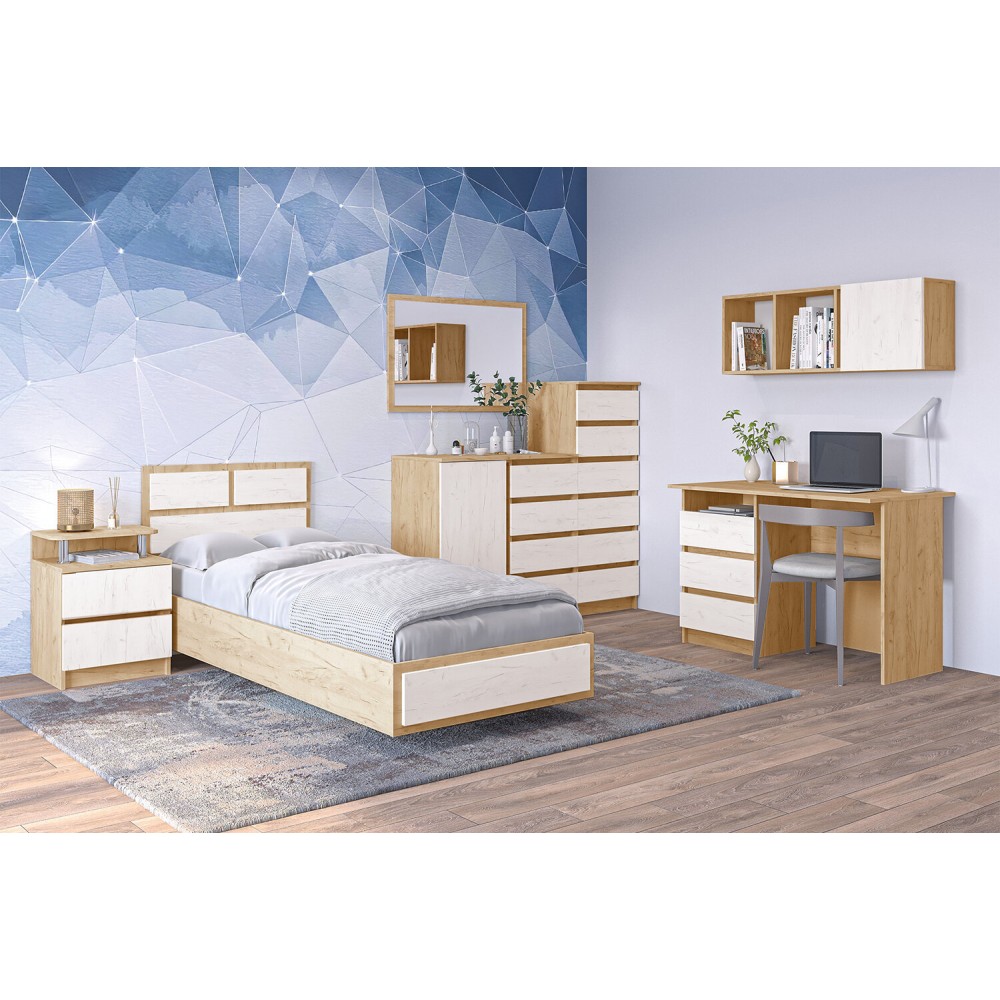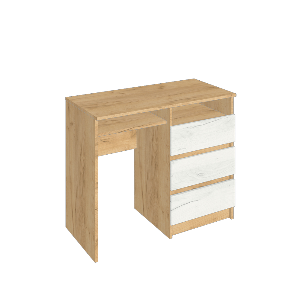 Туалетный столик из модульной коллекции Зара в отделке дуб золотой крафт/крафт белый прекрасно впишется в современный интерьер Вашей квартиры. Модель оснащена тремя выкатными ящиками, просторной столешницей и открытой нишей.