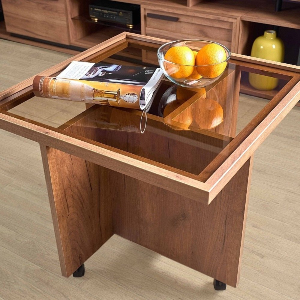 Мобильный столик на колесных опорах можносвободно передвигать по гостиной. Опорные боковые стенки образуют геометричный рисунок, который четко