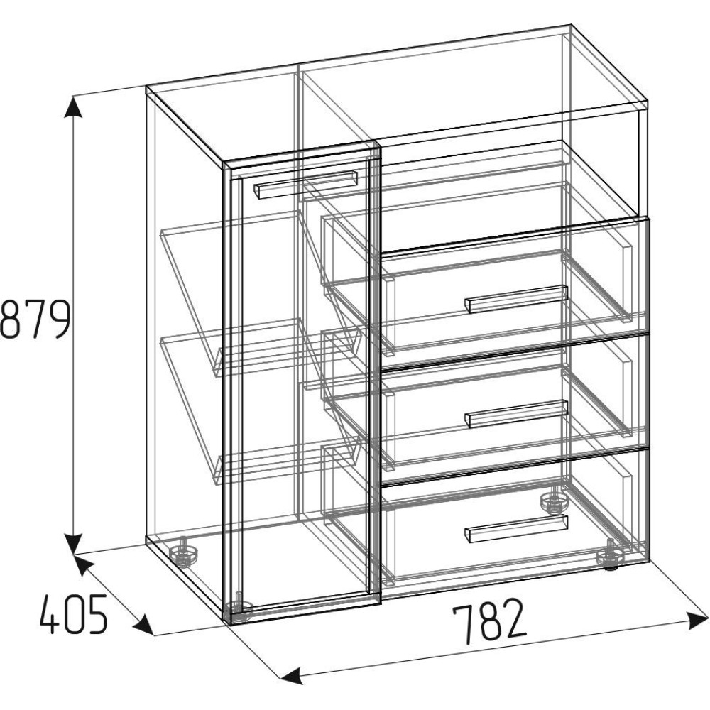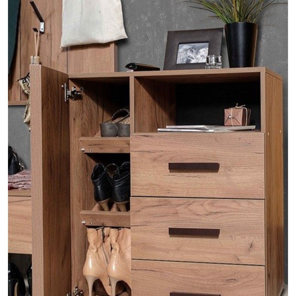 Комбинированная тумба для обуви Nature 89 - удобная и продуманная система хранения обуви для всей семьи. Тумба состоит из трех выдвижных ящиков и отделением за распашной дверцей. За распашным фасадом Контур находятся две полки для хранения обуви, которые находятся наискосок. Полки регулируются по высоте, для этого полкодержатели необходимо установить в подготовленные отверстия. Модуль можно собирать как на левую, так и правую сторону.