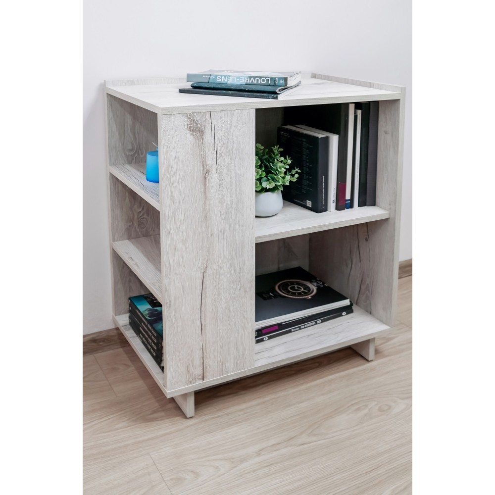 Тумба с торцевым стеллажом ФЛЕКС 23 в светлом цвете Дуб Шавиниган выполнена из ЛДСП класса эмиссии Е1 толщиной 16 мм. Напольная тумба с открытыми нишами и боковым отделением с полками, дополнит систему хранения в любой комнате: в гостиной, спальне, молодежной и прихожей. Бортики по краям столешницы предотвратят падение предметов. Предусмотрена только базовая сборка тумбы (доступ к торцевому стеллажу слева).