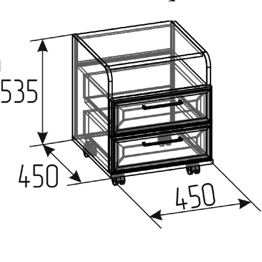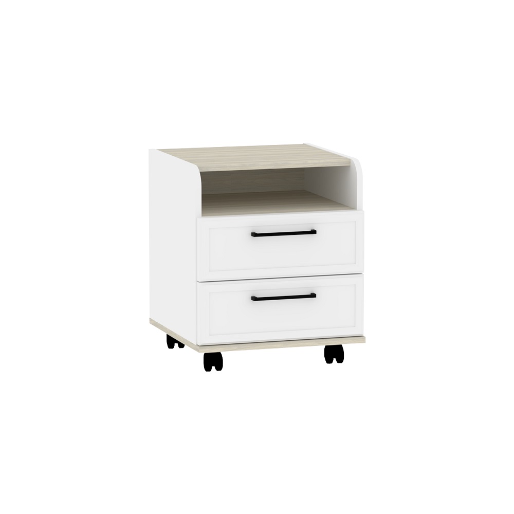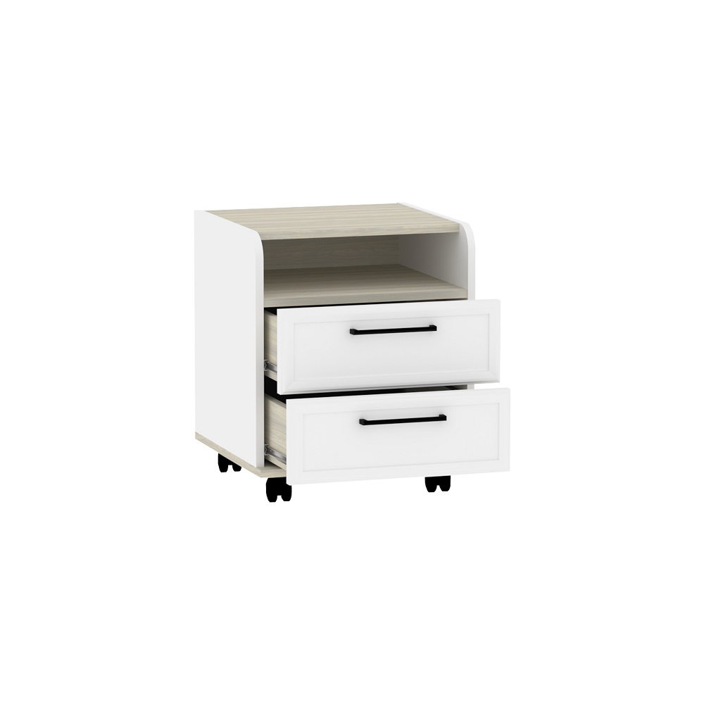 коробу для хранения. Шариковые направляющие обеспечивают выдвижным ящикам лёгкое бесшумное открывание. Чёрные ручки из литого металла подчеркивают эстетику коллекции. Кромка ПВХ толщиной 2 мм.