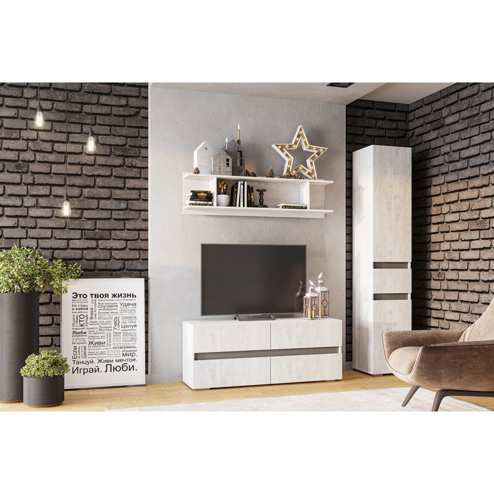 Современная компактная гостиная Мрия выполнена в трендовом цвете Бетон пайн светлый. Серия состоит из самого необходимого: тумба под ТВ, вместительные пеналы и открытая навесная полка, и позволит не загромождать комнату мебелью, а эффективно использовать пространство.