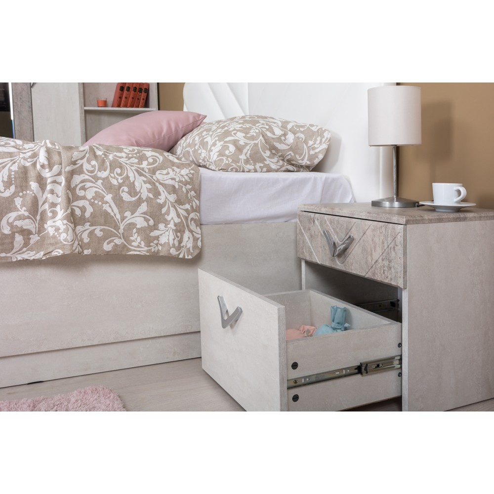 Прикроватная тумба «Амели» с фасадами «шёлковый камень» и корпусом «бетон Чикаго беж» сочетает в себе элегантность и практичность. Изготовлена из высококачественных материалов: ЛДСП и МДФ. Глянцевые фасады без фотопечати обеспечивают стильный вид, а наличие двух ящиков с шариковыми направляющими и удобными ручками делает тумбу функциональной.