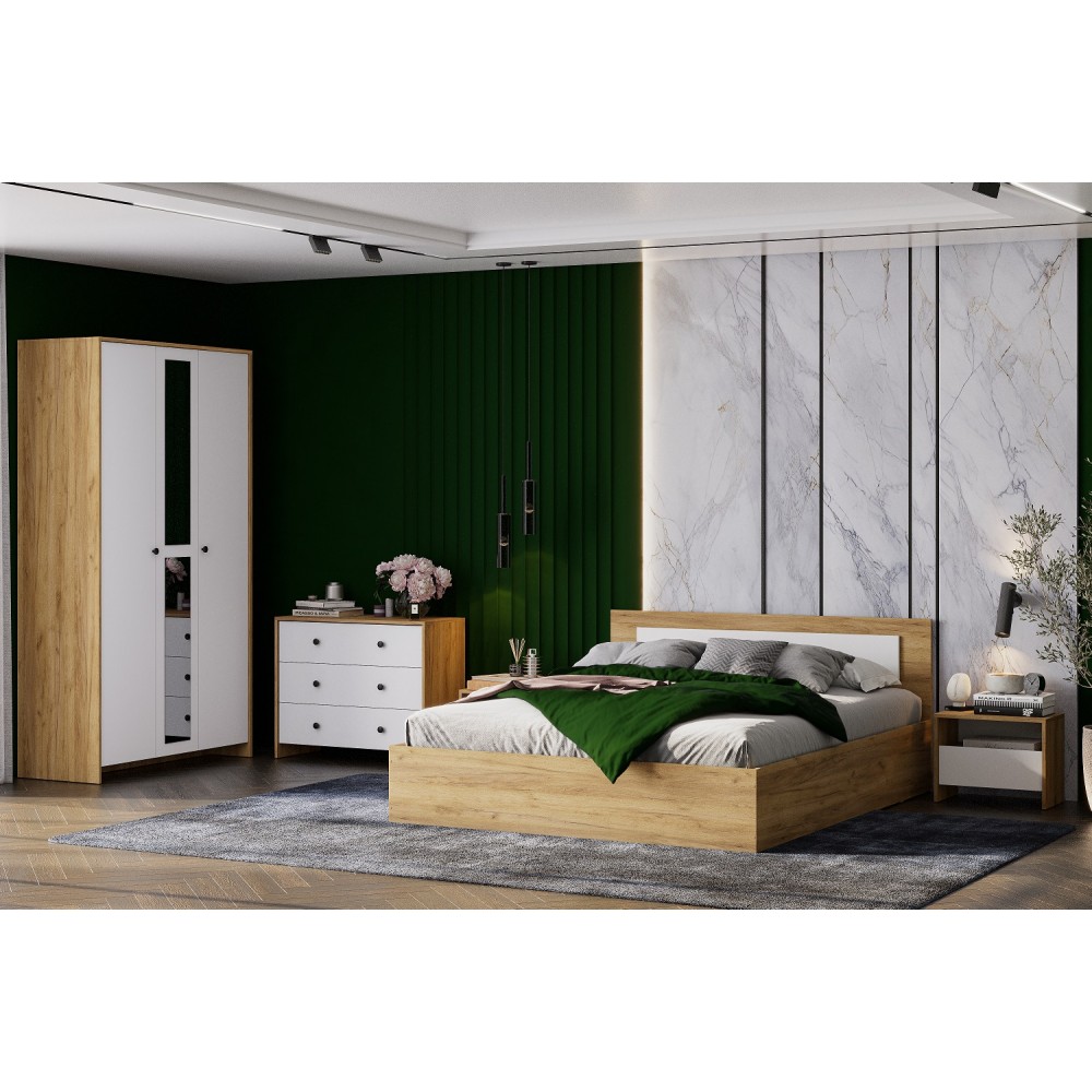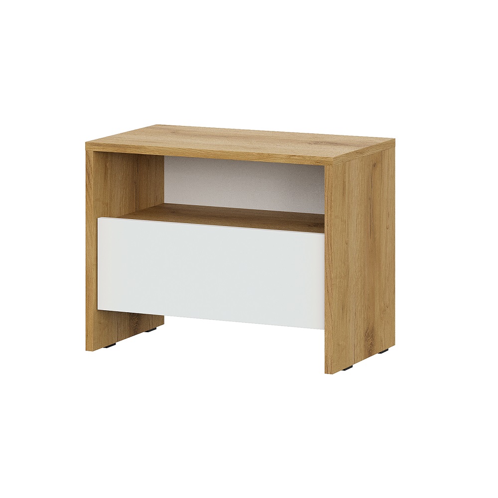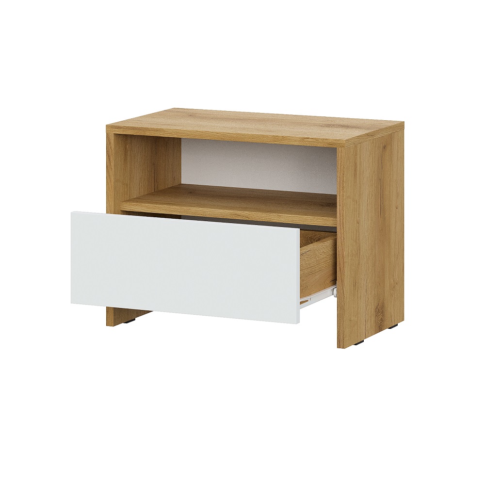 Прикроватная тумба «Дольче» в цвете «дуб золотой» с белыми элементами выполнена в современном стиле. Она имеет выдвижной ящик и открытую нишу для мелочей.