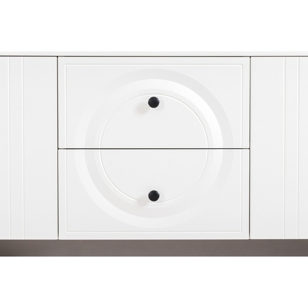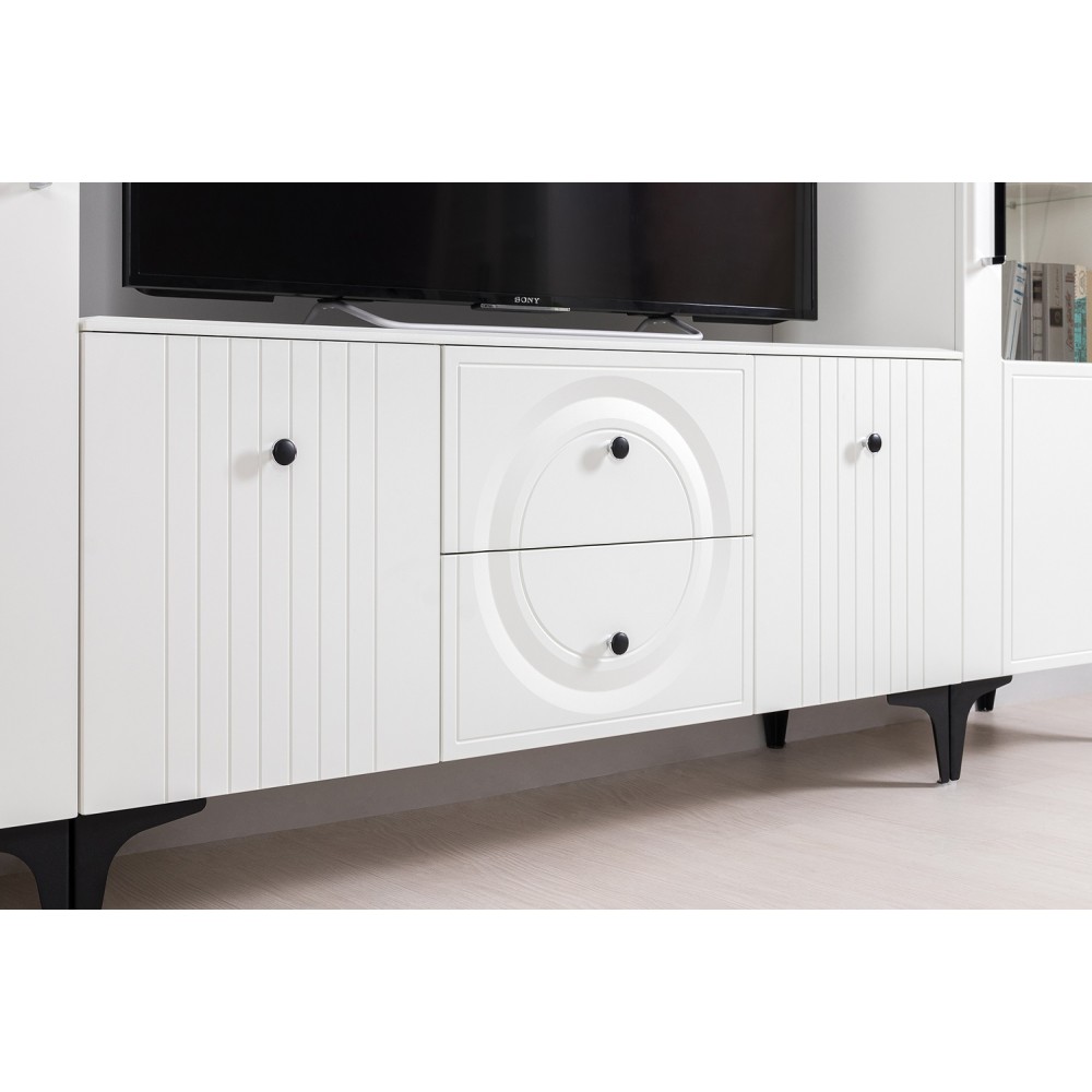 Тумба ТВ Валенсия — стильный и функциональный элемент интерьера. Она выполнена в современном стиле и обладает рядом преимуществ: фасады и корпус белого цвета, наличие доводчиков обеспечивает плавное закрытие ящиков, а направляющие скрытого монтажа гарантируют удобство использования.