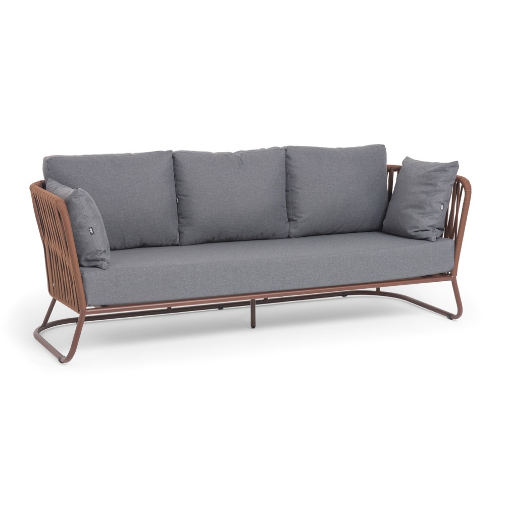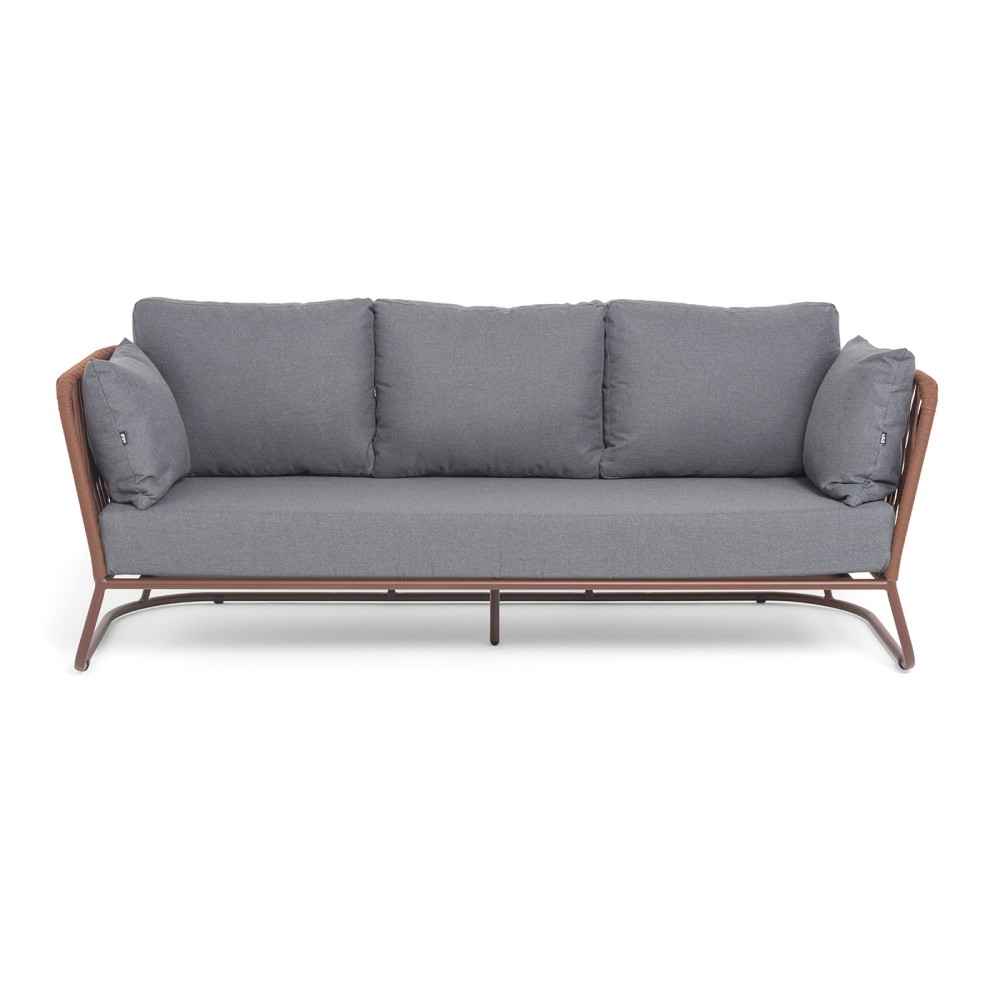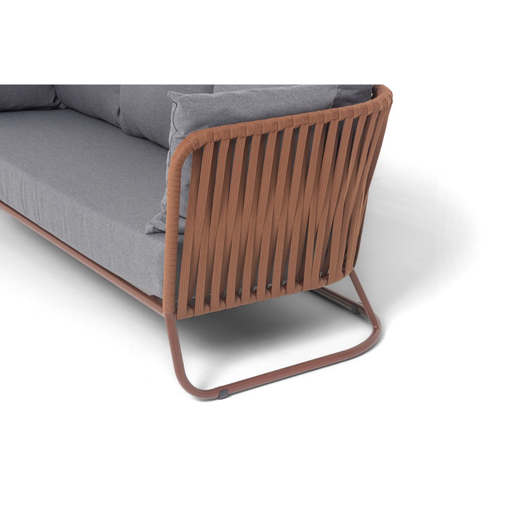 Диван имеет алюминиевый каркас, окрашенный порошковой краской в коричневый (RAL8016) цвет. Боковины каркаса вручную оплетены роупом - эластичными синтетическими лентами, изготовленными из высокопрочных полиэфирных волокон. Оплетка - 23 мм, цвет коричневый.
