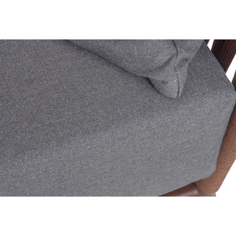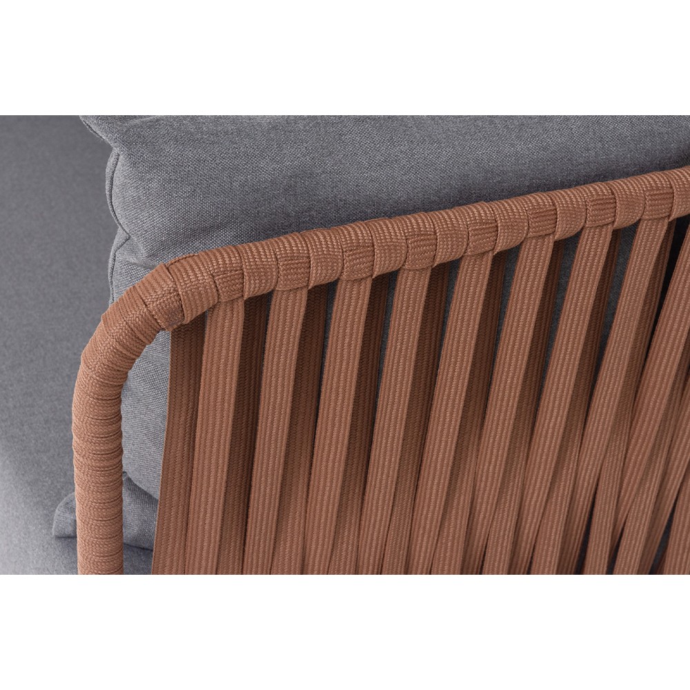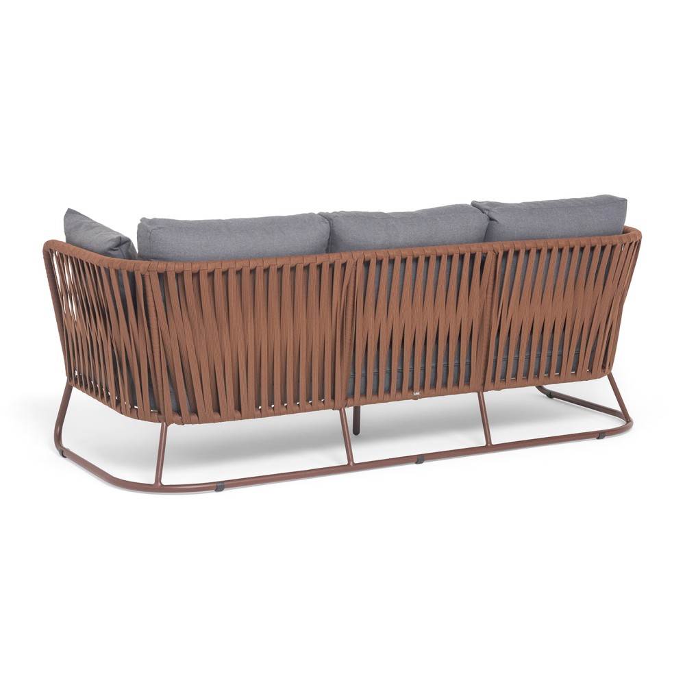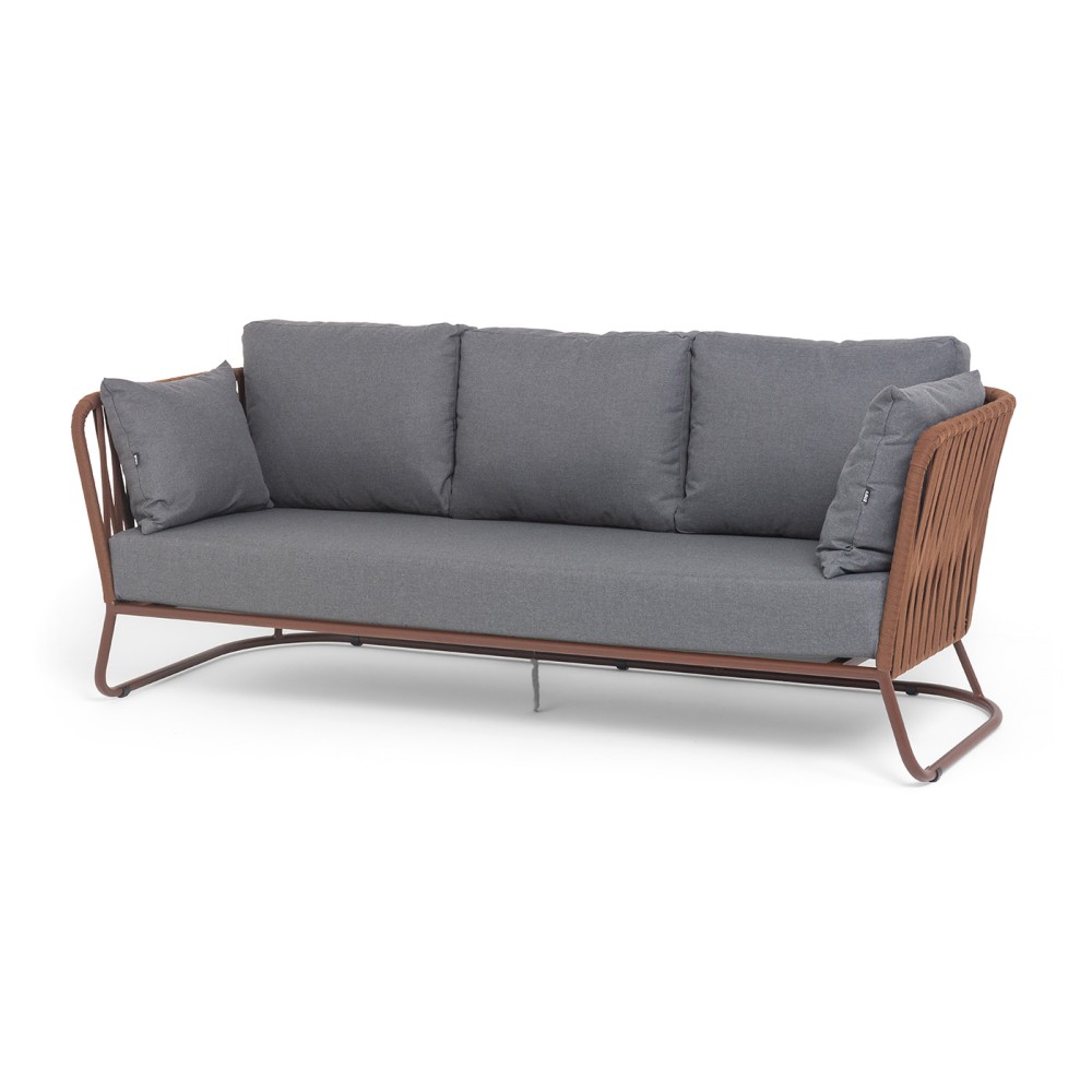 Диван имеет алюминиевый каркас, окрашенный порошковой краской в коричневый (RAL8016) цвет. Боковины каркаса вручную оплетены роупом - эластичными синтетическими лентами, изготовленными из высокопрочных полиэфирных волокон. Оплетка - 23 мм, цвет коричневый.