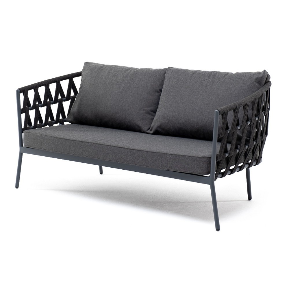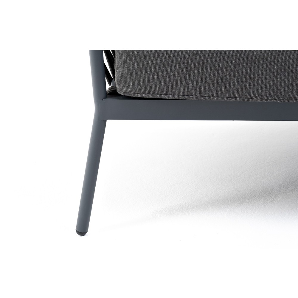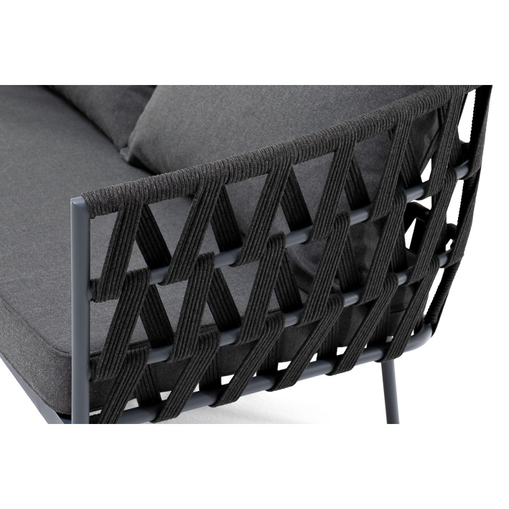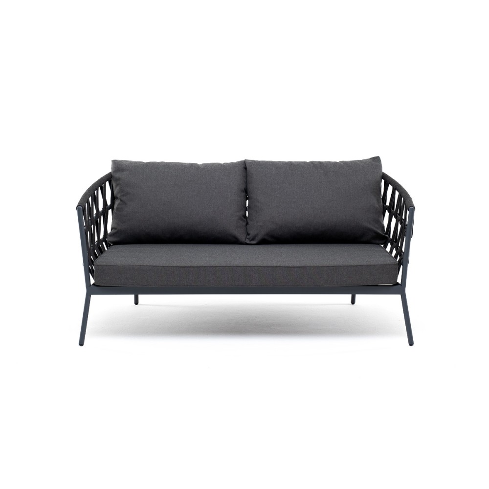 Диван имеет алюминиевый каркас, окрашенный порошковой краской в темно-серый (RAL7024) цвет. Боковины каркаса и спинка вручную оплетены роупом - эластичными синтетическими лентами, изготовленными из высокопрочных полиэфирных волокон. Цвет оплетки - темно-серый.