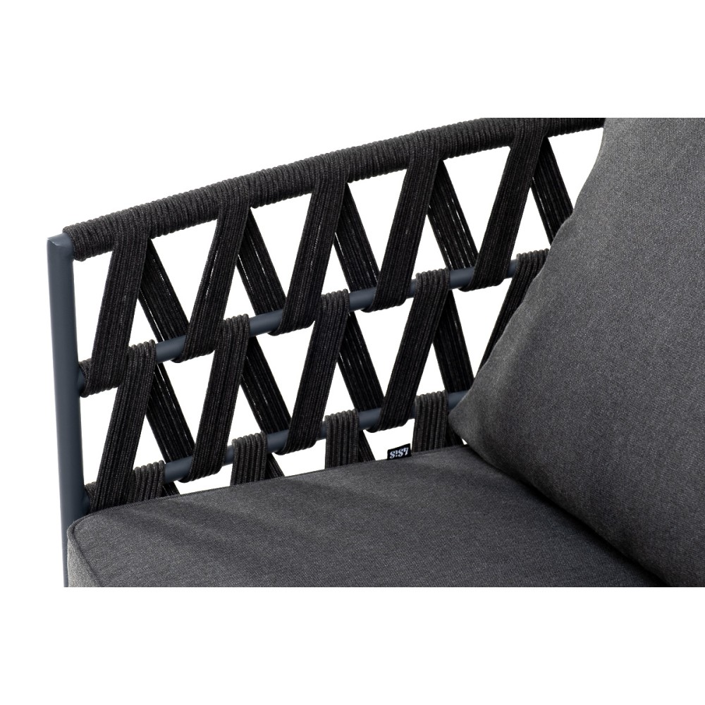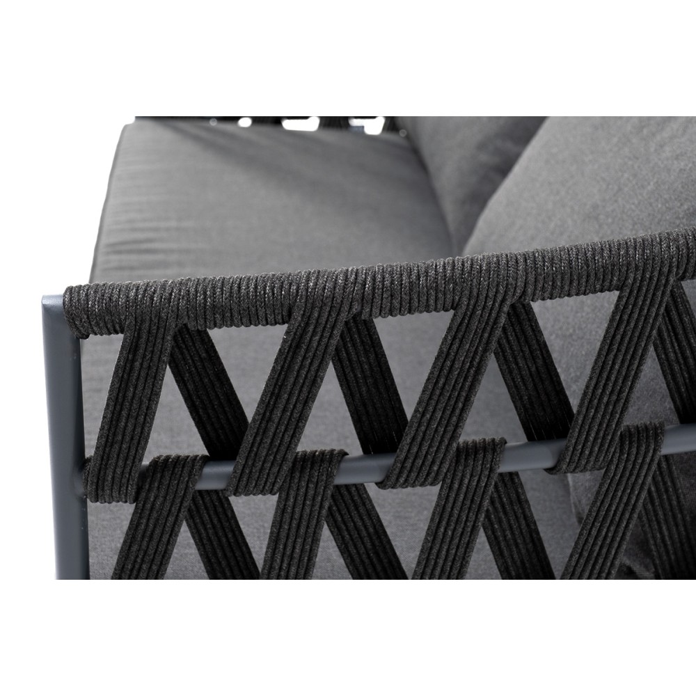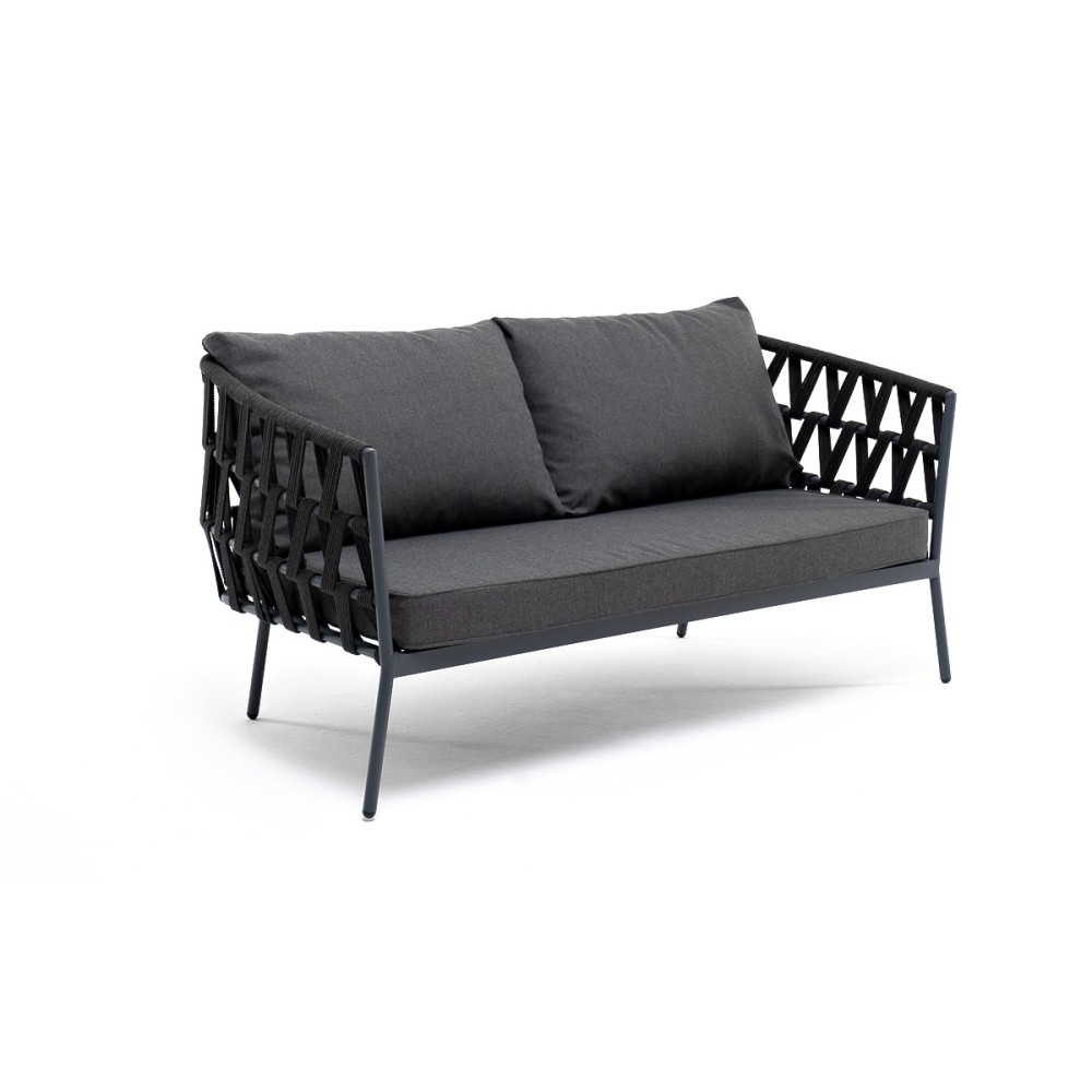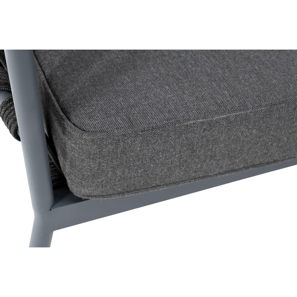Диван имеет алюминиевый каркас, окрашенный порошковой краской в темно-серый (RAL7024) цвет. Боковины каркаса и спинка вручную оплетены роупом - эластичными синтетическими лентами, изготовленными из высокопрочных полиэфирных волокон. Цвет оплетки - темно-серый.