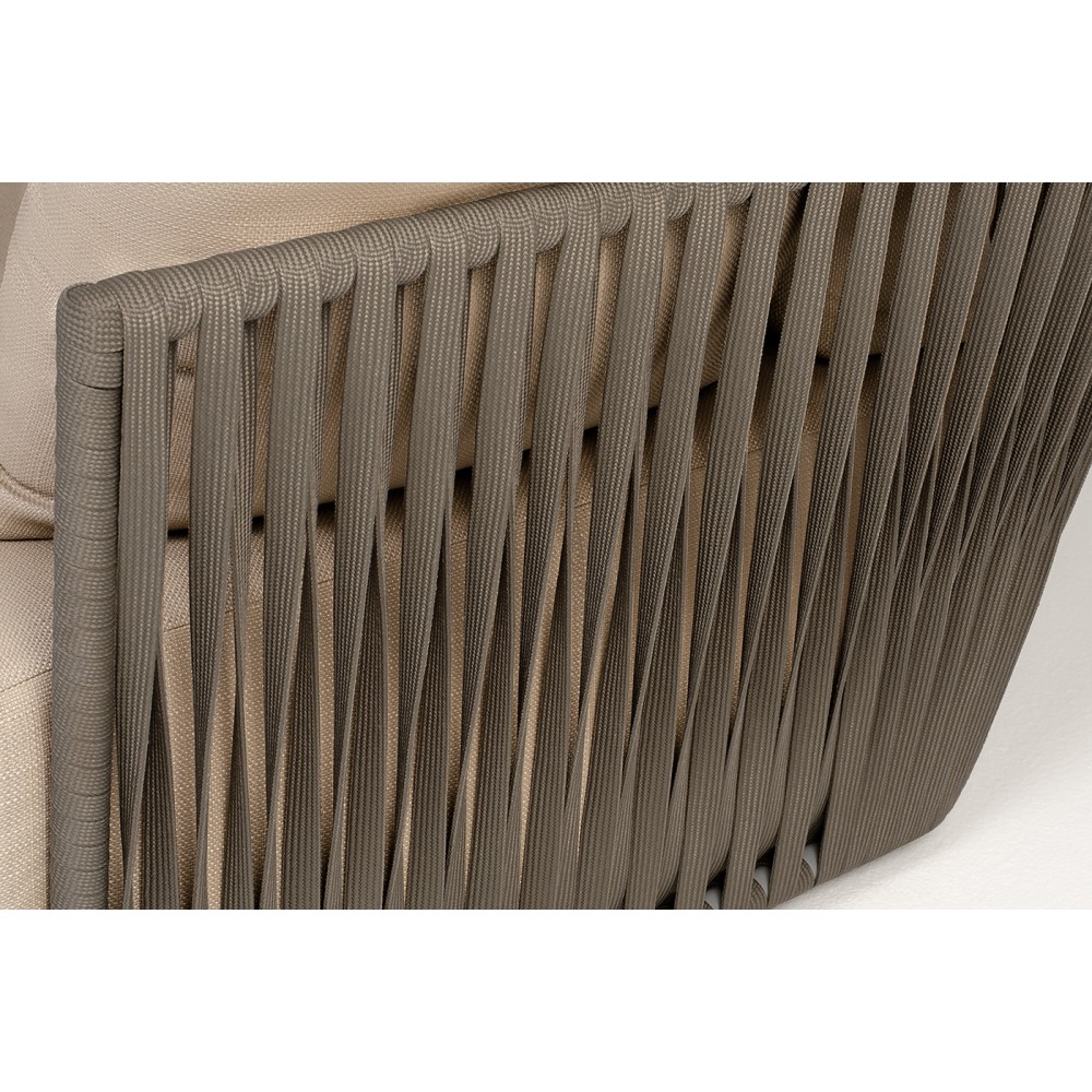 Диван имеет алюминиевый каркас, окрашенный порошковой краской в светло-серый (RAL7035) цвет. Боковины каркаса вручную оплетены роупом - эластичными синтетическими лентами, изготовленными из высокопрочных полиэфирных волокон. Цвет оплетки - серо-коричневый.