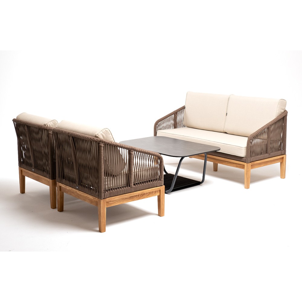 Боковины каркаса и спинка вручную оплетены роупом коричневого цвета. Это эластичные синтетические ленты, изготовленные из высокопрочных полиэфирных волокон. Основание дивана - натуральный дуб.
