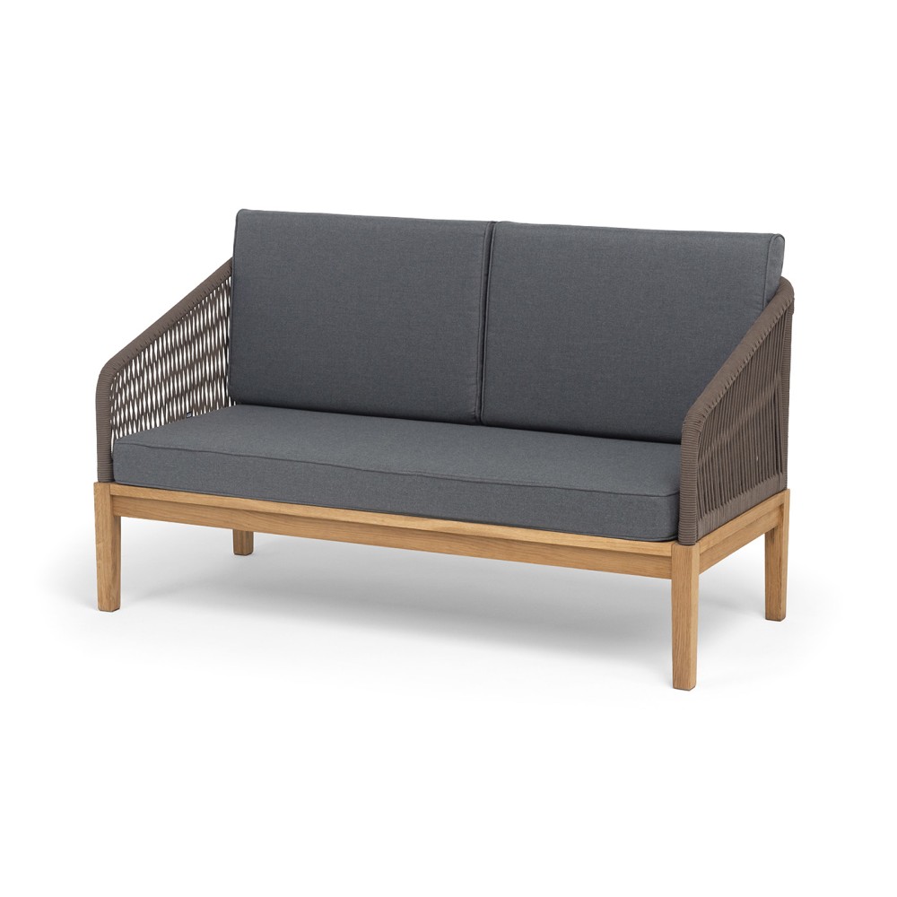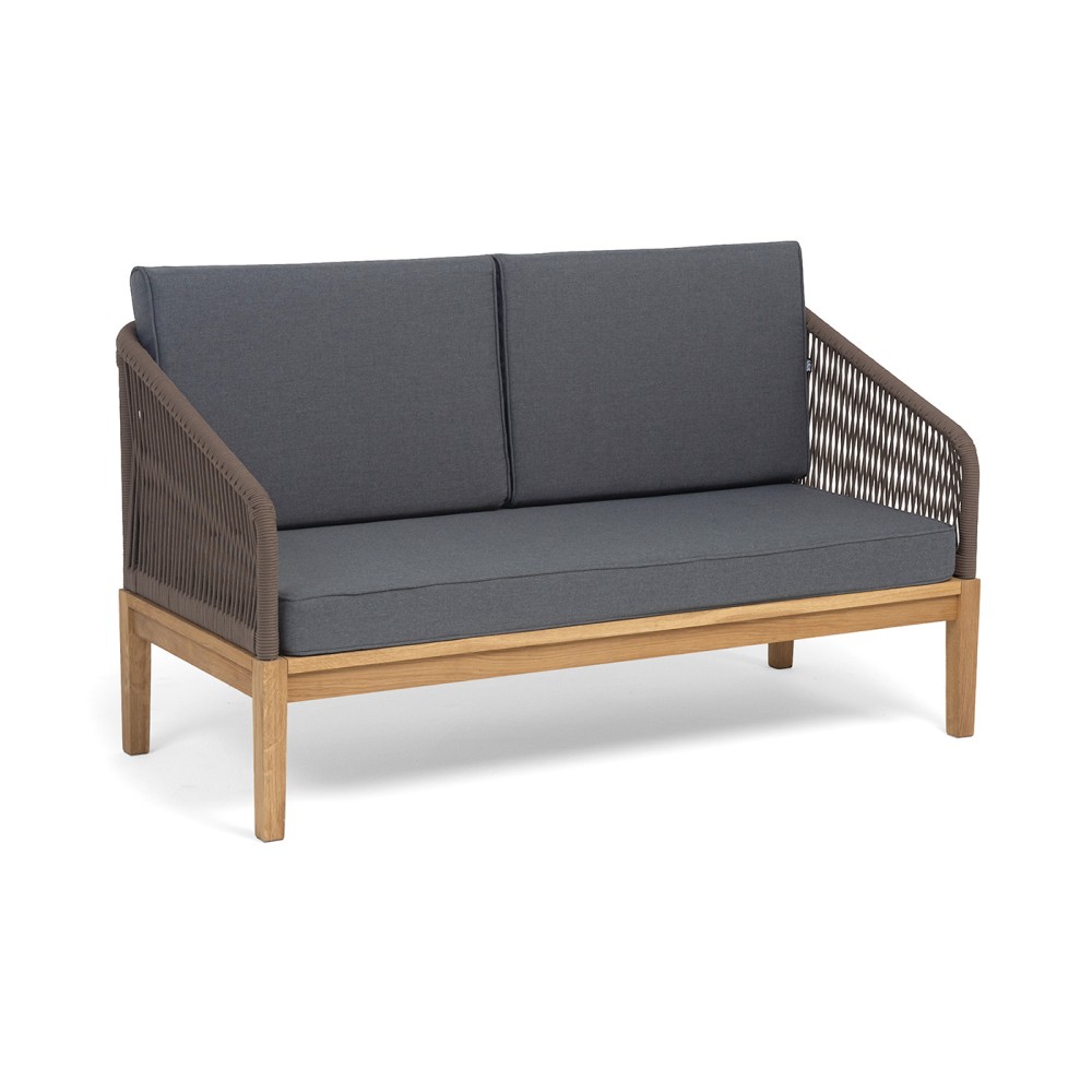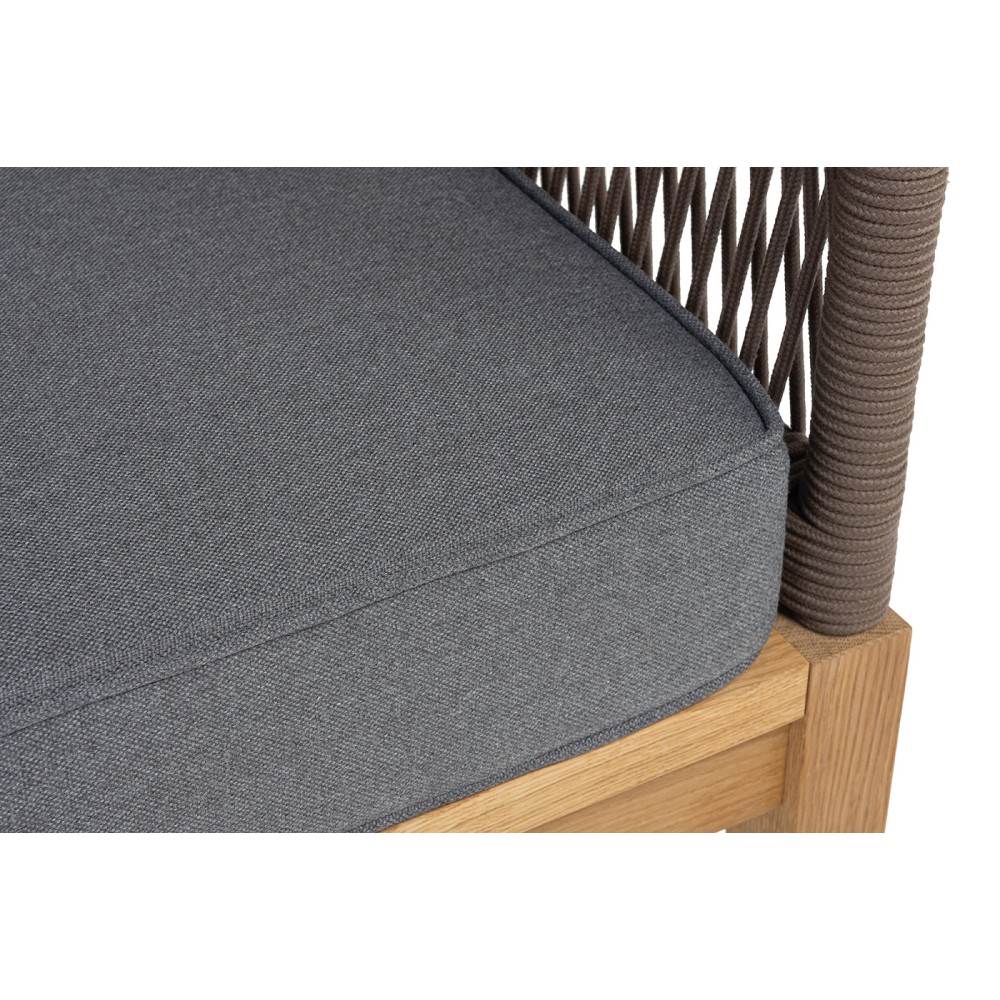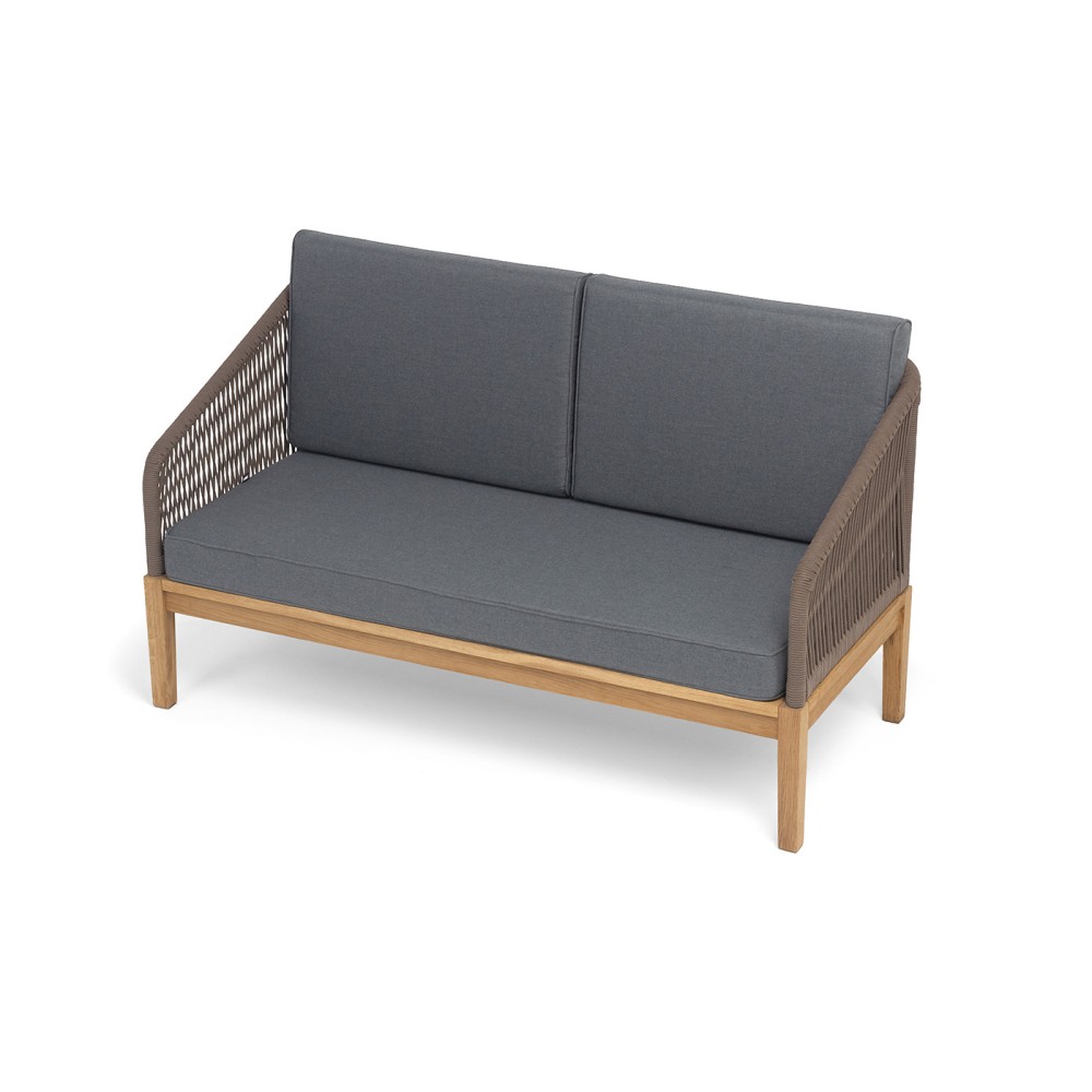 Боковины каркаса и спинка вручную оплетены роупом коричневого цвета. Это эластичные синтетические ленты, изготовленные из высокопрочных полиэфирных волокон. Основание дивана - натуральный дуб.