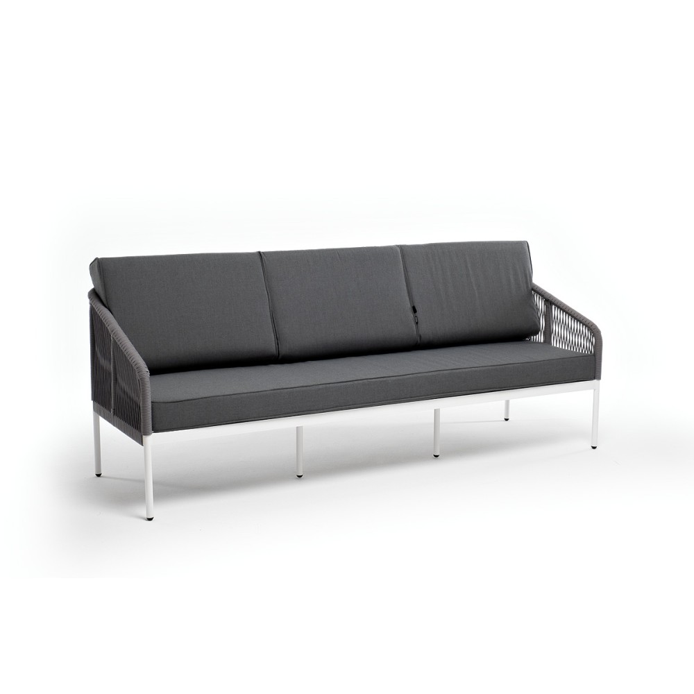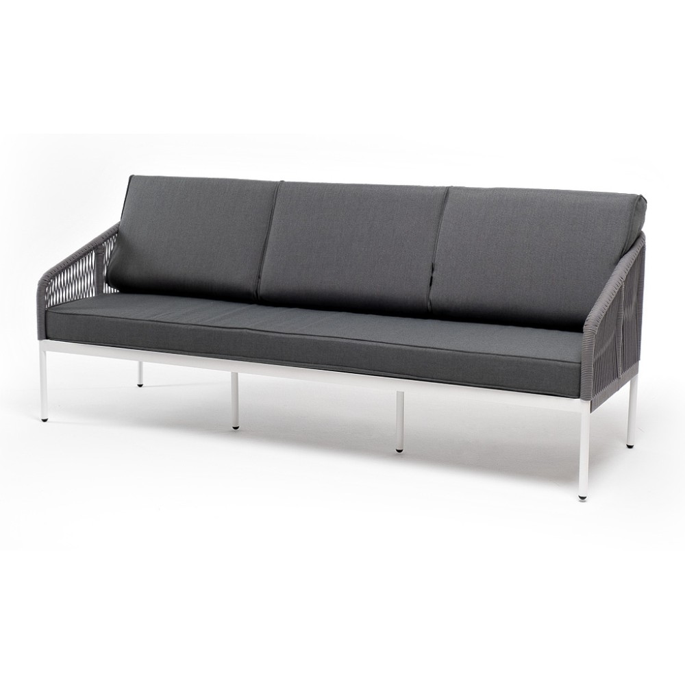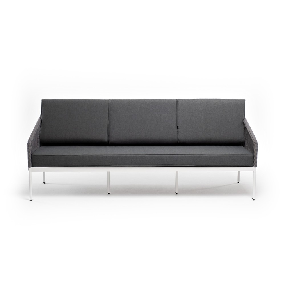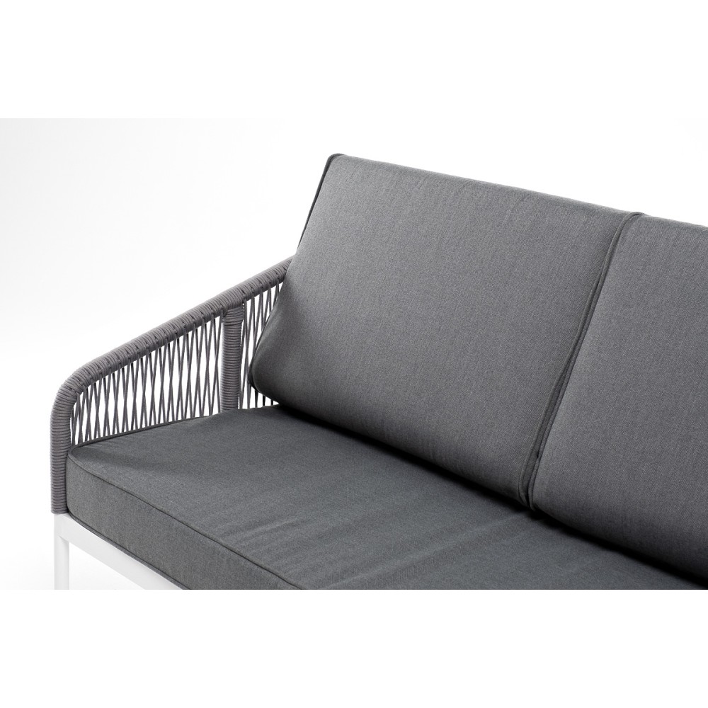 Диван имеет алюминиевый каркас, окрашенный порошковой краской в белый цвет. Боковины каркаса и спинка вручную оплетены роупом - эластичными синтетическими лентами, изготовленными из высокопрочных полиэфирных волокон. Цвет оплетки - светло-серый.