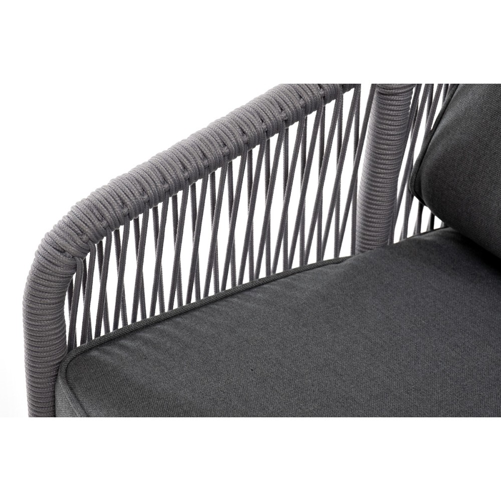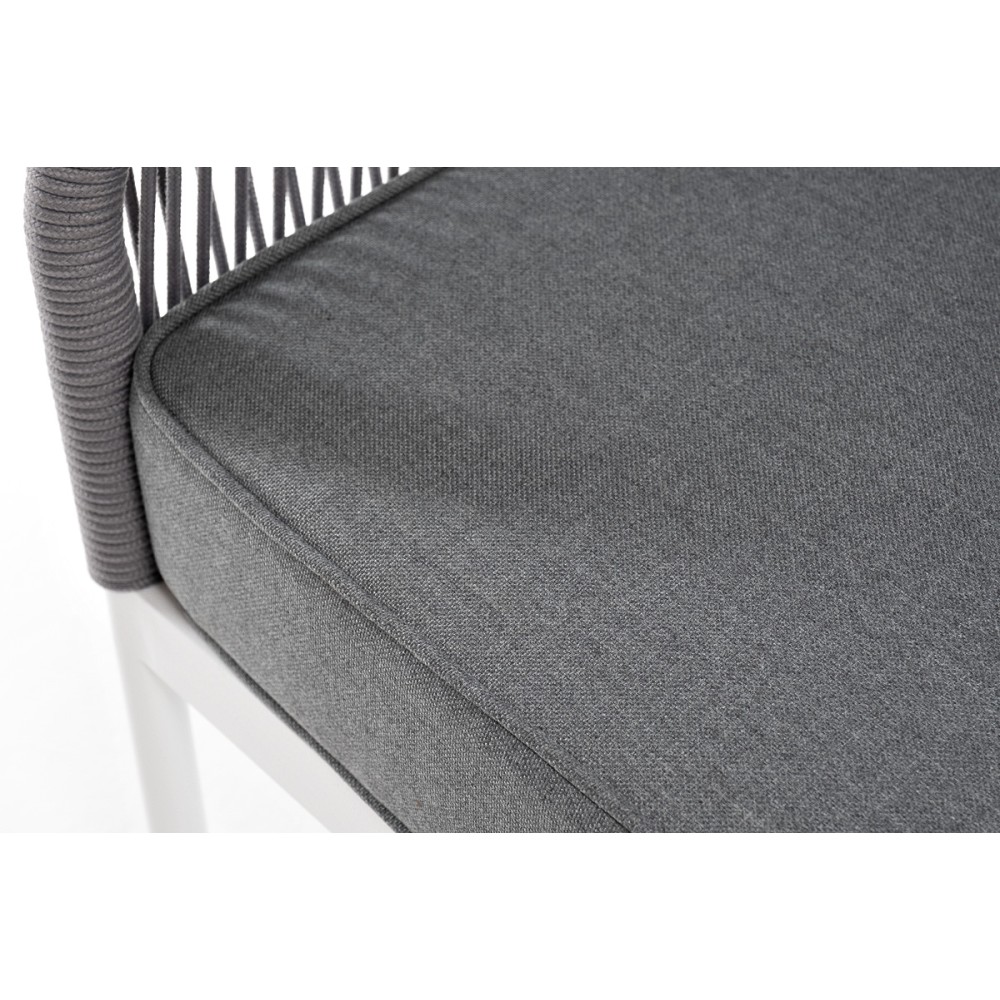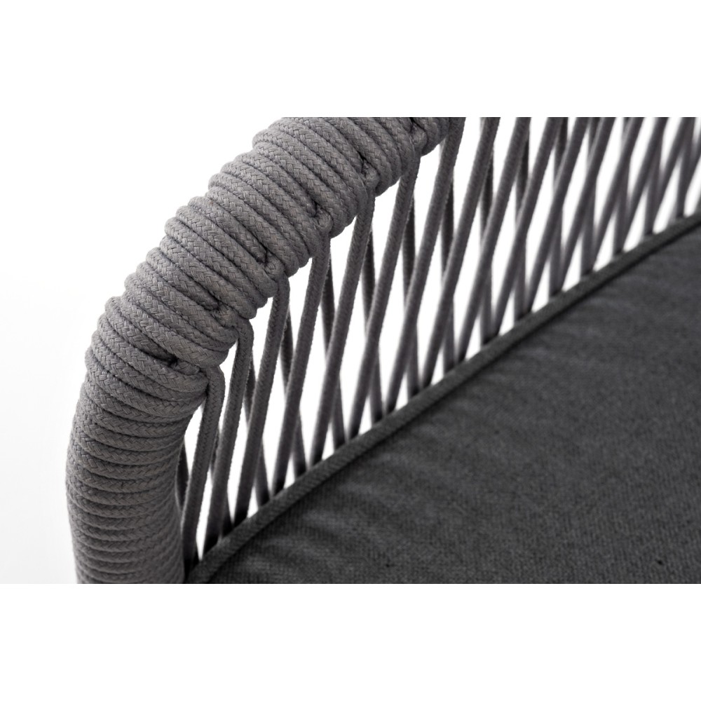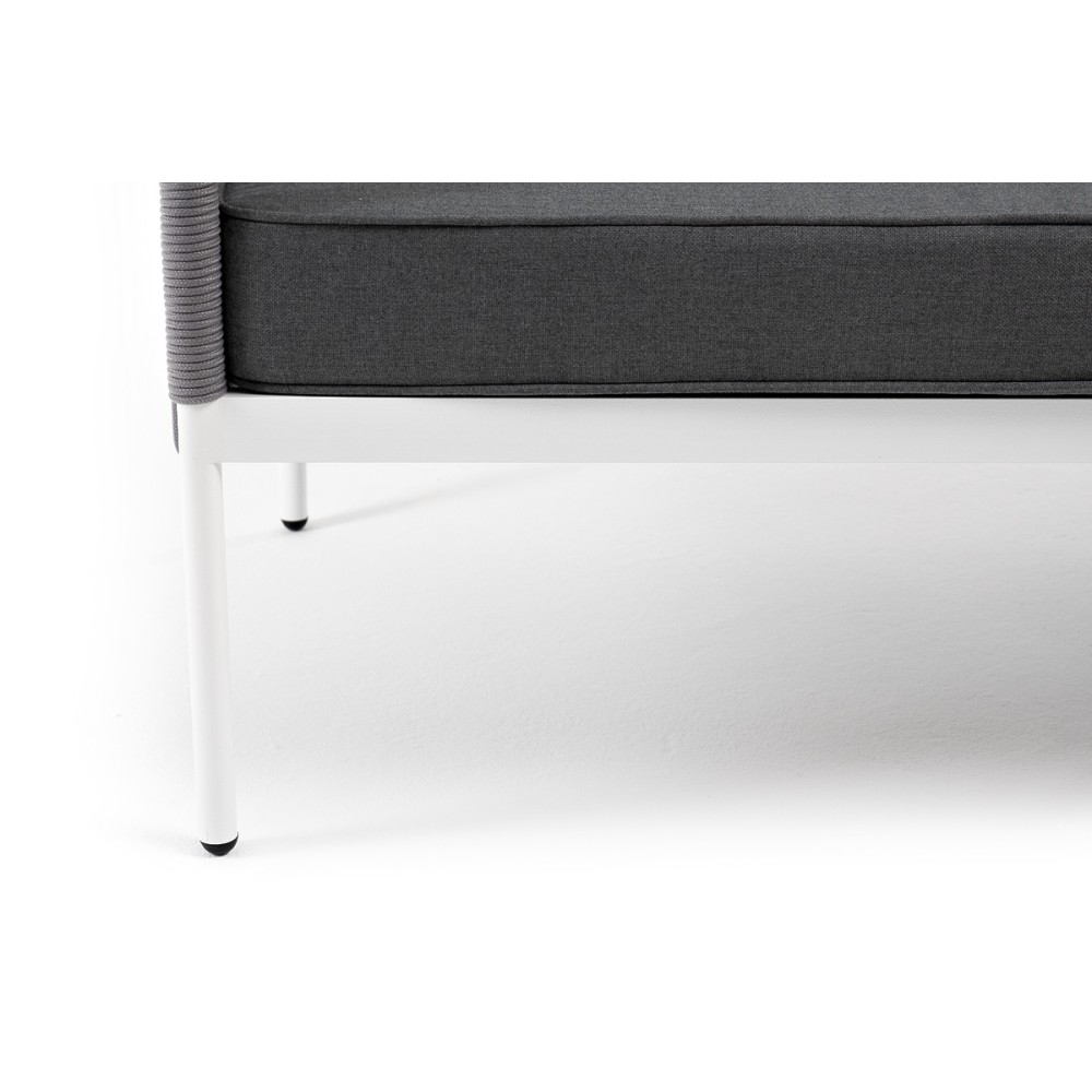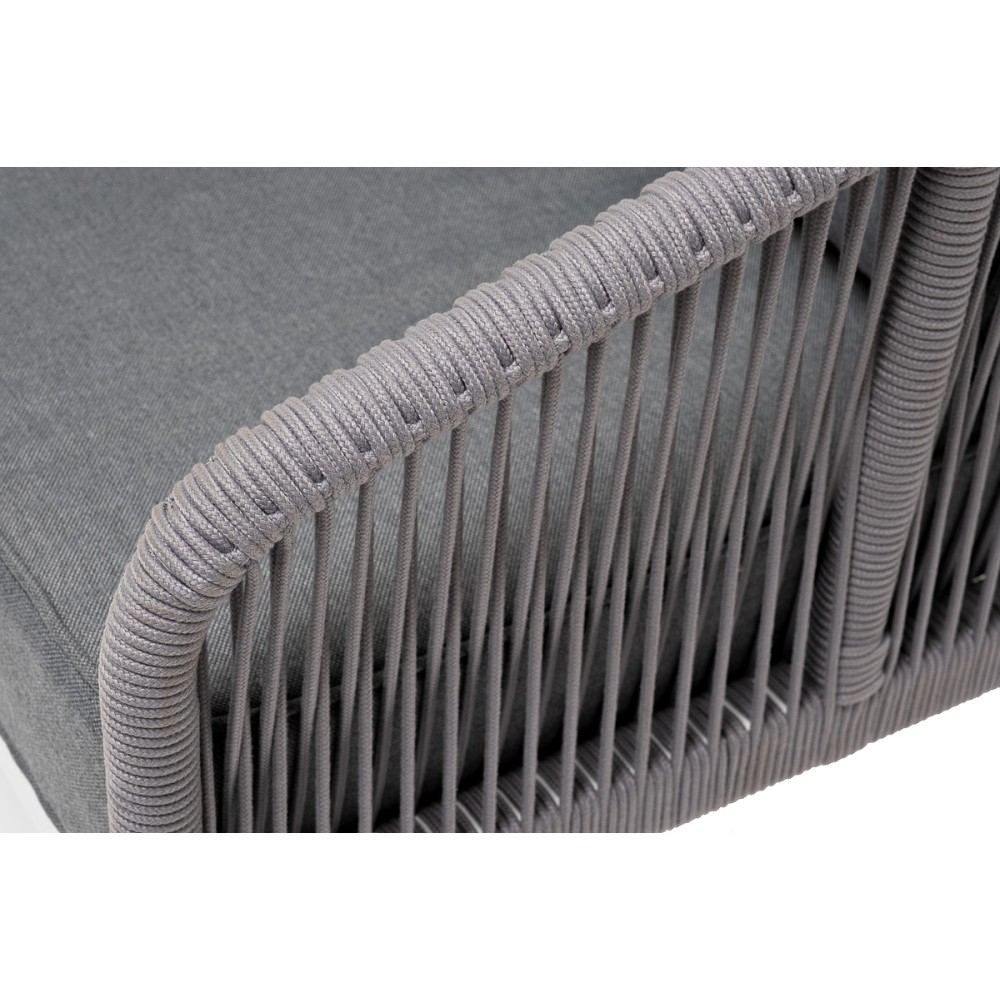 Диван имеет алюминиевый каркас, окрашенный порошковой краской в белый цвет. Боковины каркаса и спинка вручную оплетены роупом - эластичными синтетическими лентами, изготовленными из высокопрочных полиэфирных волокон. Цвет оплетки - светло-серый.