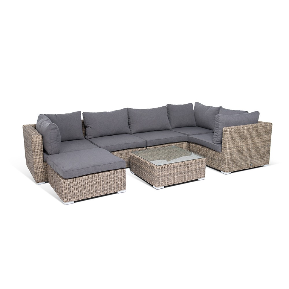 Прямой модуль «Лунго», выполненный из круглого искусственного ротанга натурального соломенного оттенка, позволяет использовать не только как самостоятельный элемент, но и быть частью лаунж-зоны, в которую данная модель превосходно интегрируется.