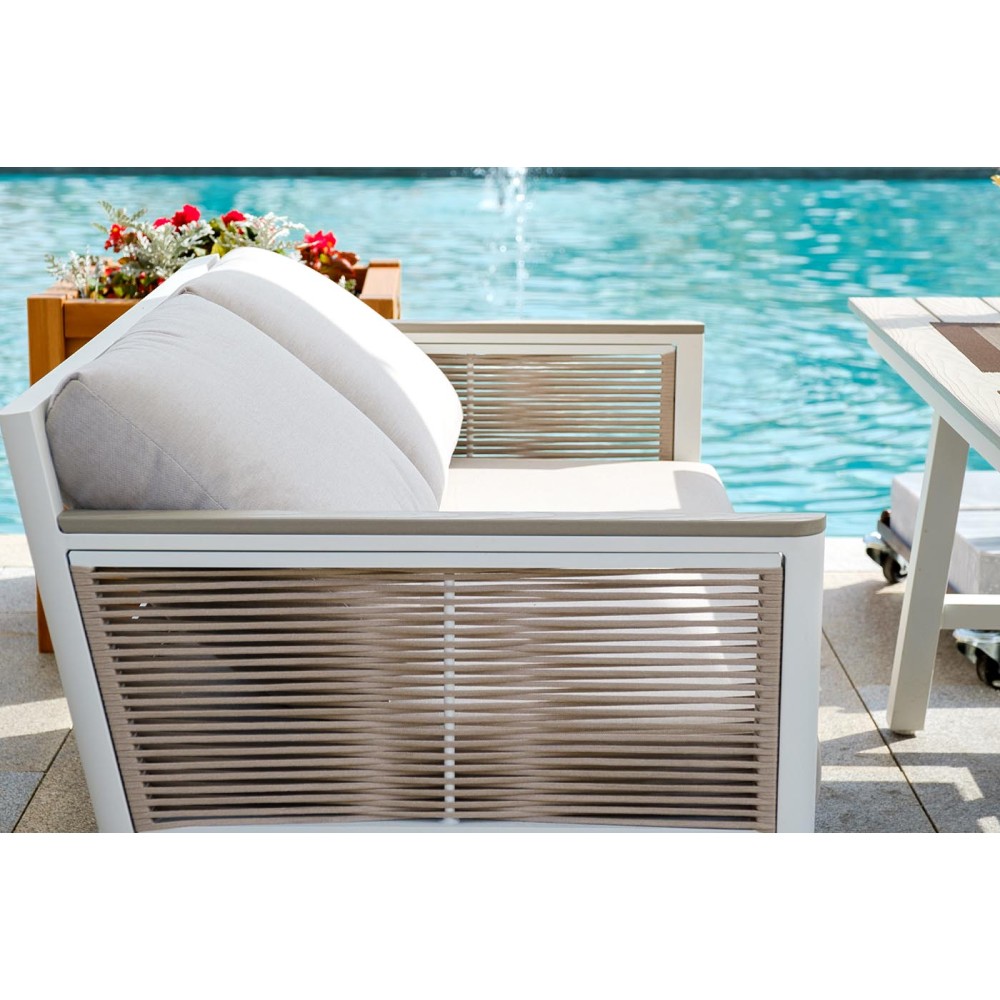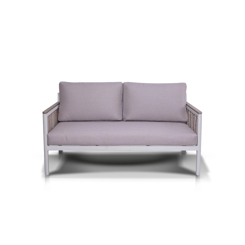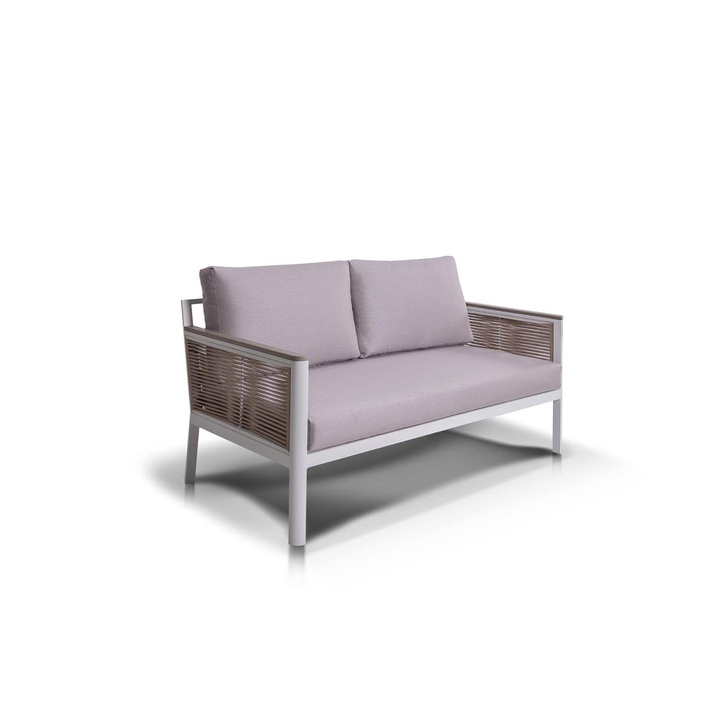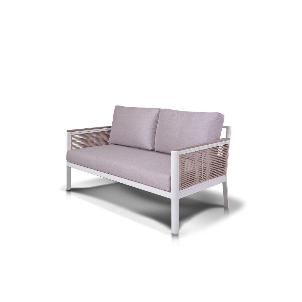 Каркас выполнен из высококачественного алюминия и окрашен порошковой краской в белый цвет. Боковые стороны подлокотников вручную оплетены эластичными синтетическими лентами серо-коричневого оттенка, состоящие из высокопрочных полиэфирных волокон.