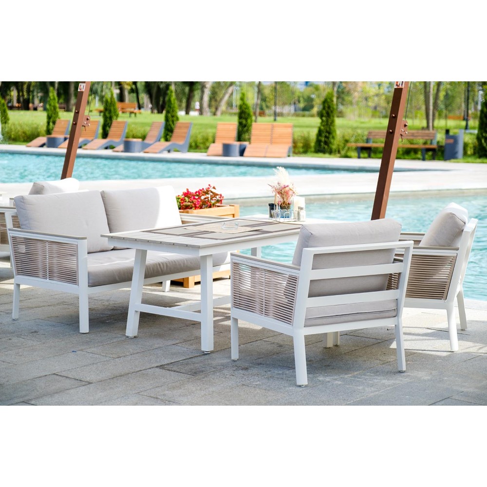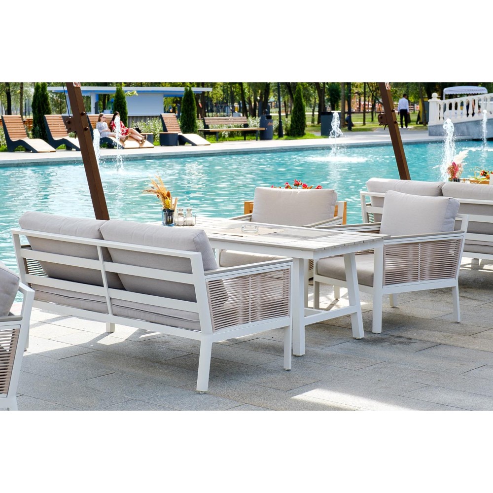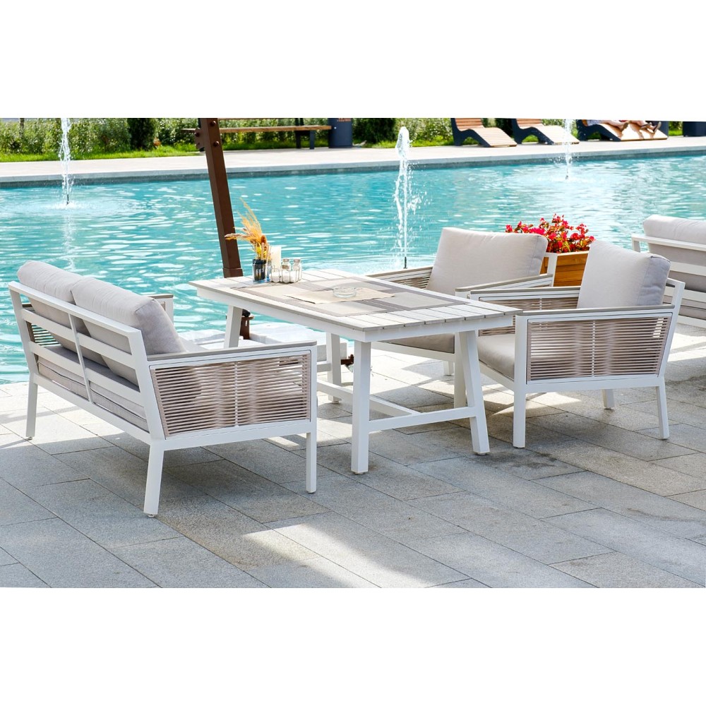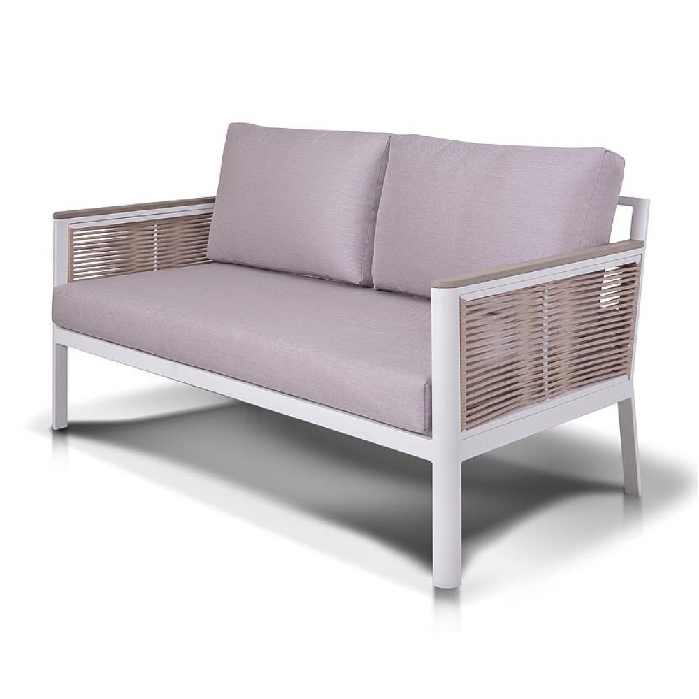 Каркас выполнен из высококачественного алюминия и окрашен порошковой краской в белый цвет. Боковые стороны подлокотников вручную оплетены эластичными синтетическими лентами серо-коричневого оттенка, состоящие из высокопрочных полиэфирных волокон.