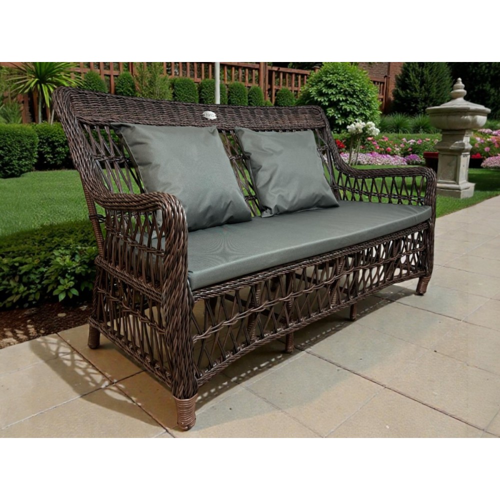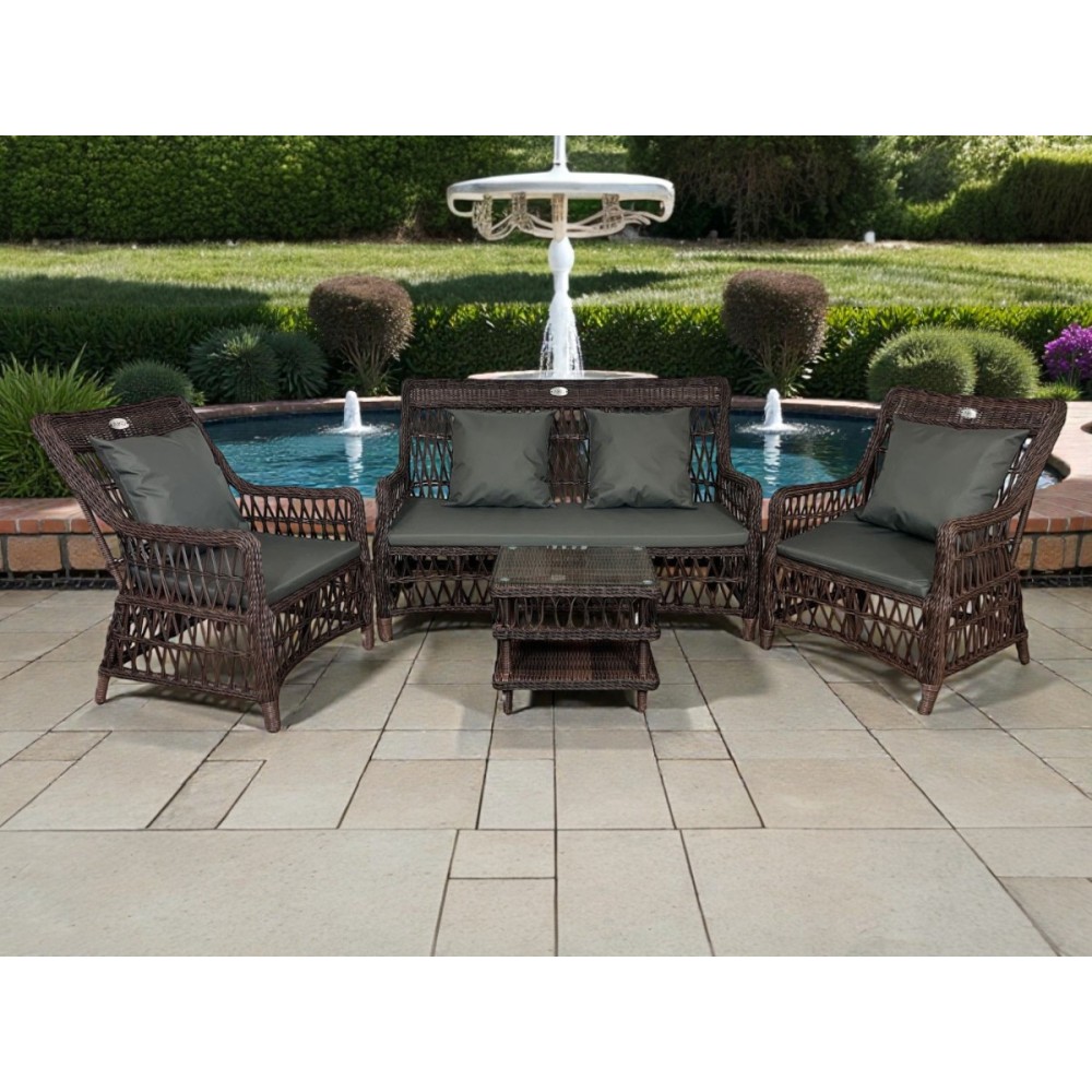 LEGEND кофейный — это стильный комплект мебели премиум-класса для организации уютной зоны отдыха на террасе, веранде или в саду. Уникальное плетение «полусфера» создаёт объёмную текстуру и неповторимый визуальный эффект. В комплекте всё необходимое для комфортного отдыха: кофейный стол (50×40×42 см), удобная 2-местная софа (140×77×94 см) и 2 эргономичных кресла (65×77×94 см). Мягкие подушки уже включены в стоимость.