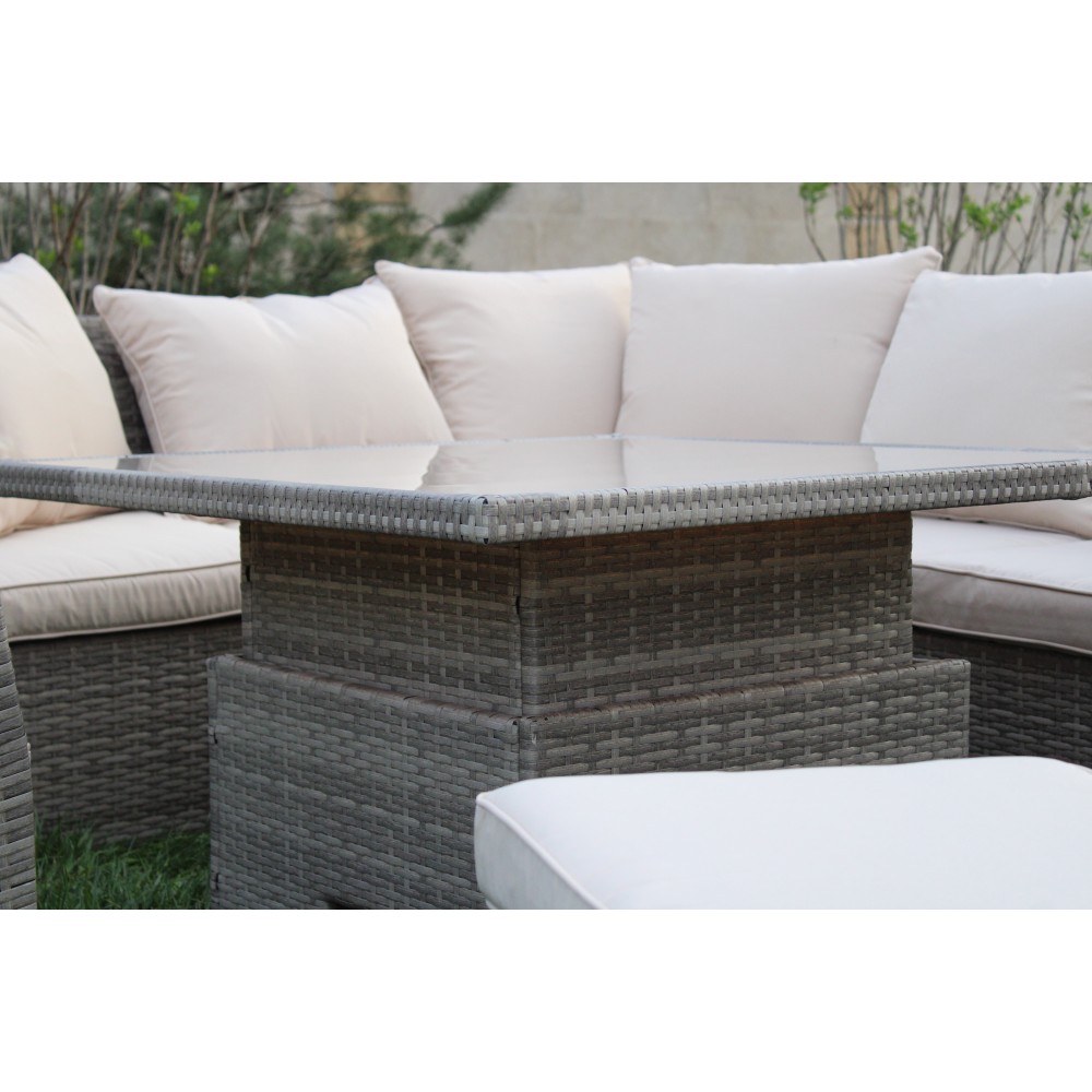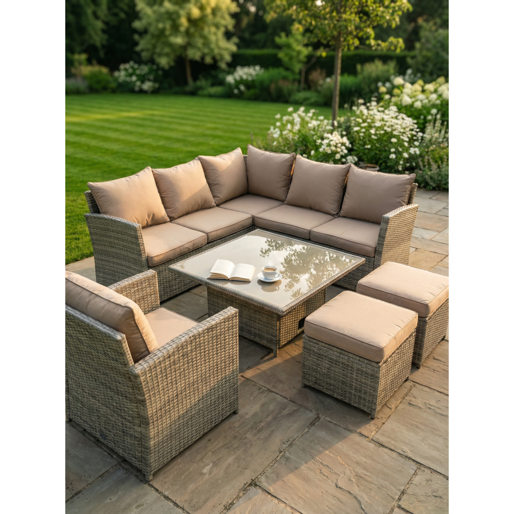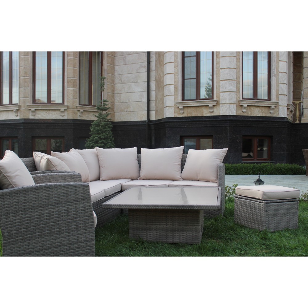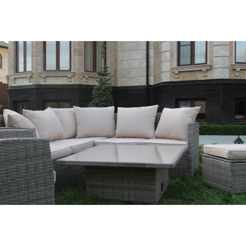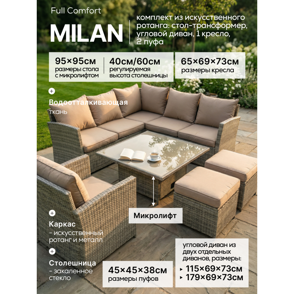 MILAN — премиальный комплект садовой мебели с уникальным квадратным столом-трансформером, который превращается из компактного журнального в полноценный обеденный стол за считанные секунды. В состав входят: большой угловой диван, отдельное кресло и два пуфа. Идеальное решение для террасы, веранды, зоны у бассейна или загородного участка. Рассчитан на комфортное размещение до 8 человек.