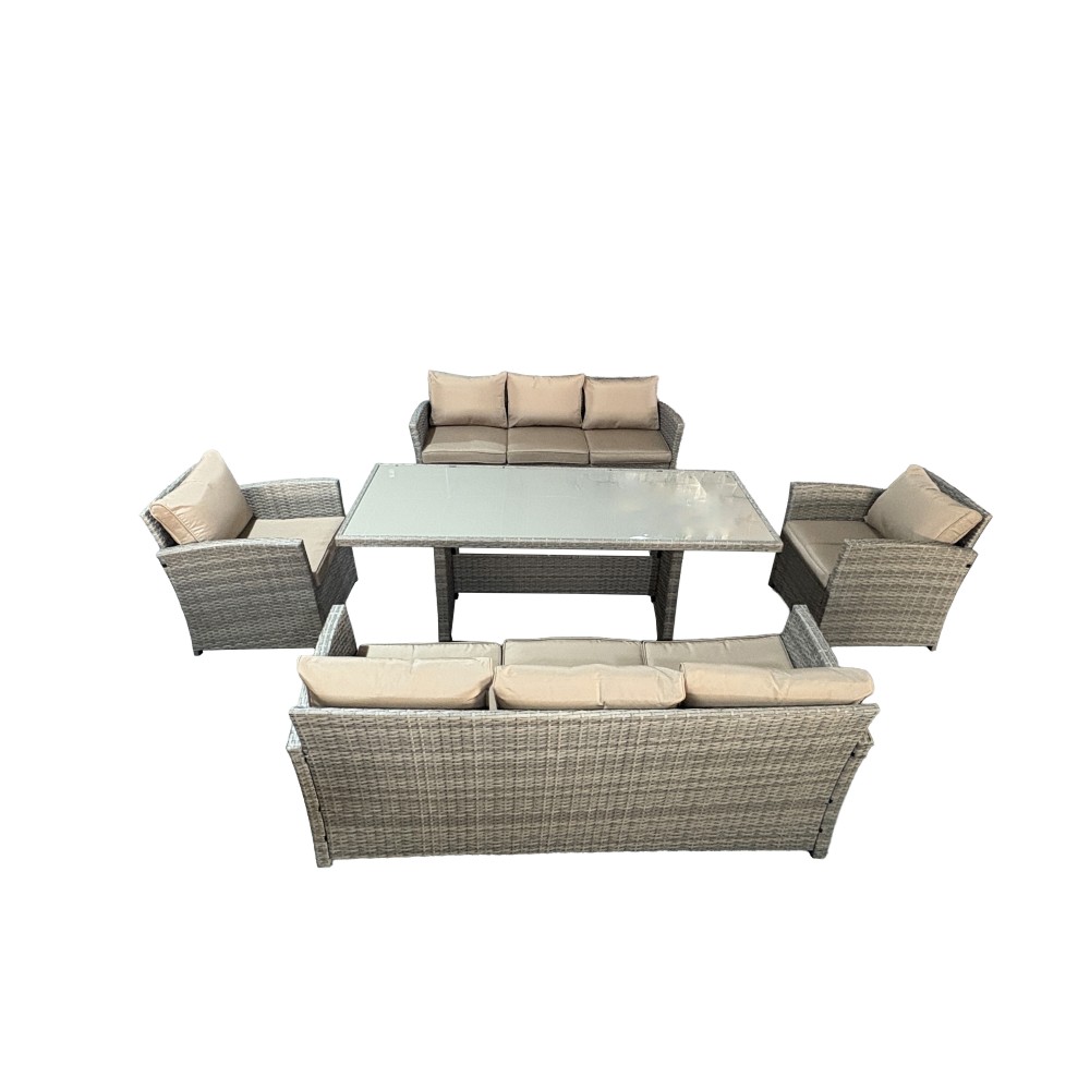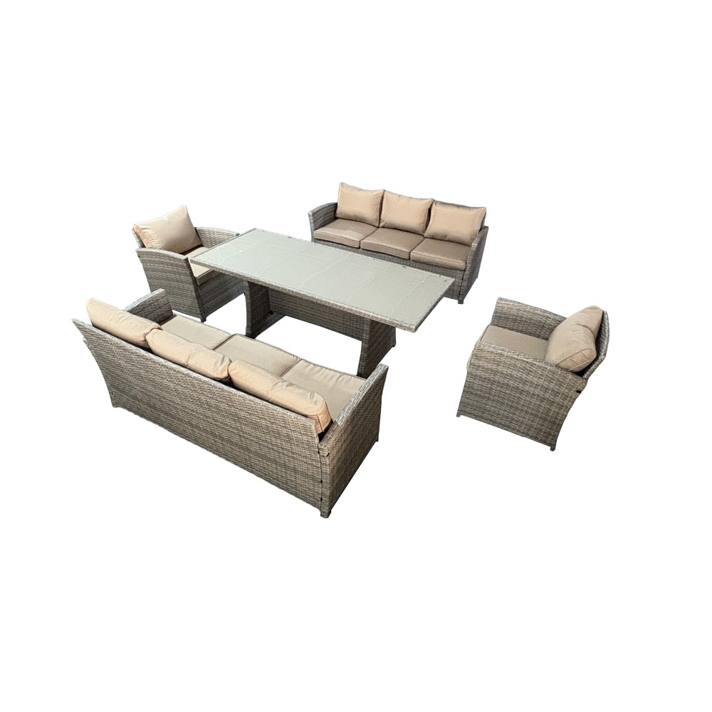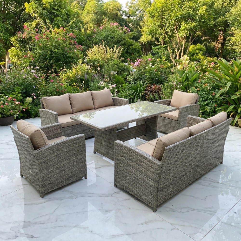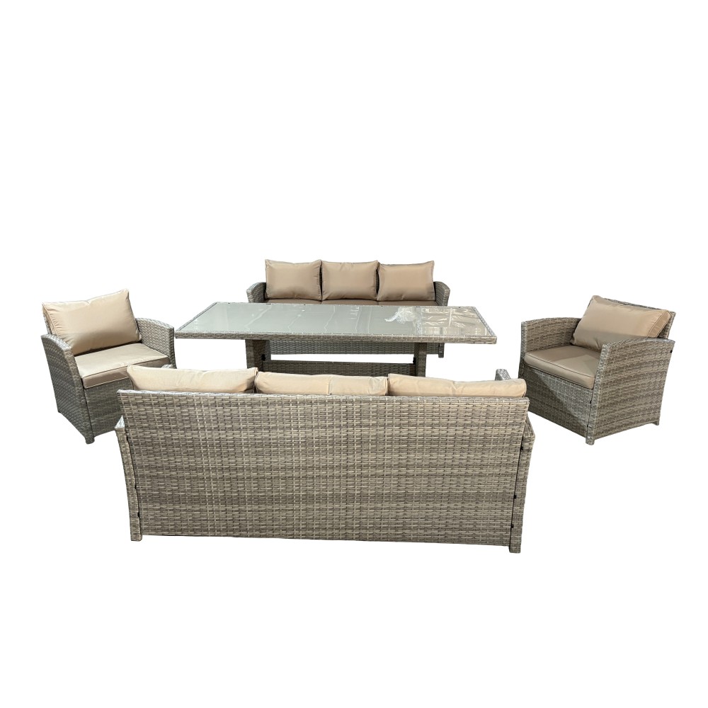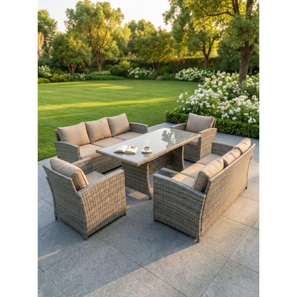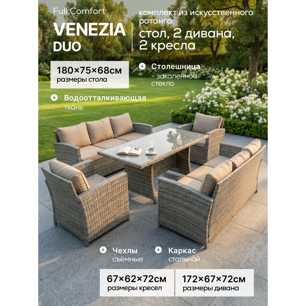 VENEZIA-DUO в бежевом цвете — расширенная версия популярного комплекта, созданная для масштабных семейных обедов и приёма гостей. В составе: увеличенный обеденный стол 180 см, два просторных трёхместных дивана и два кресла — всего 6 предметов для комфортного размещения до 9 человек. Светлый бежевый оттенок добавляет воздуха, визуально расширяет пространство и идеально подходит для средиземноморского стиля, прованса и светлых загородных интерьеров.
