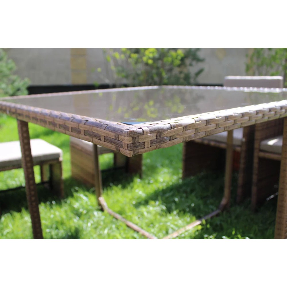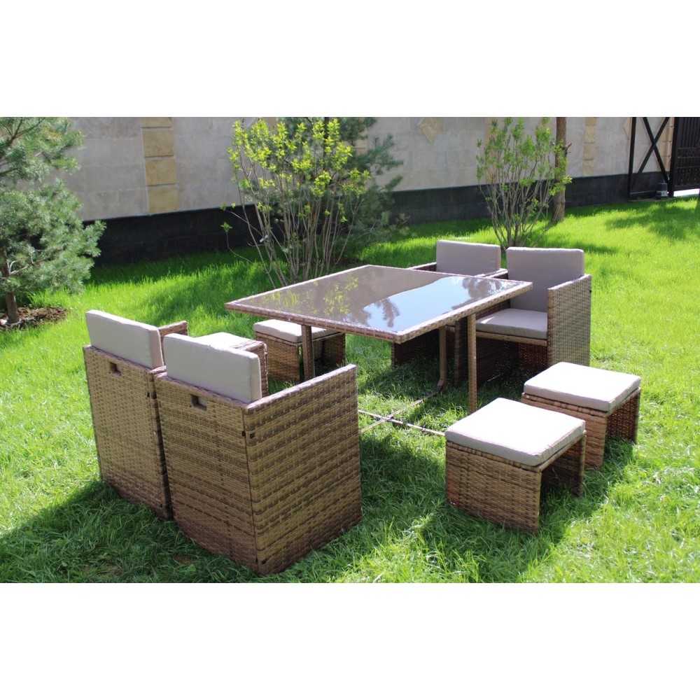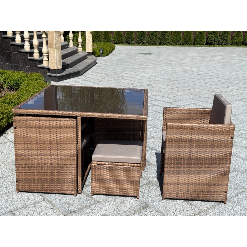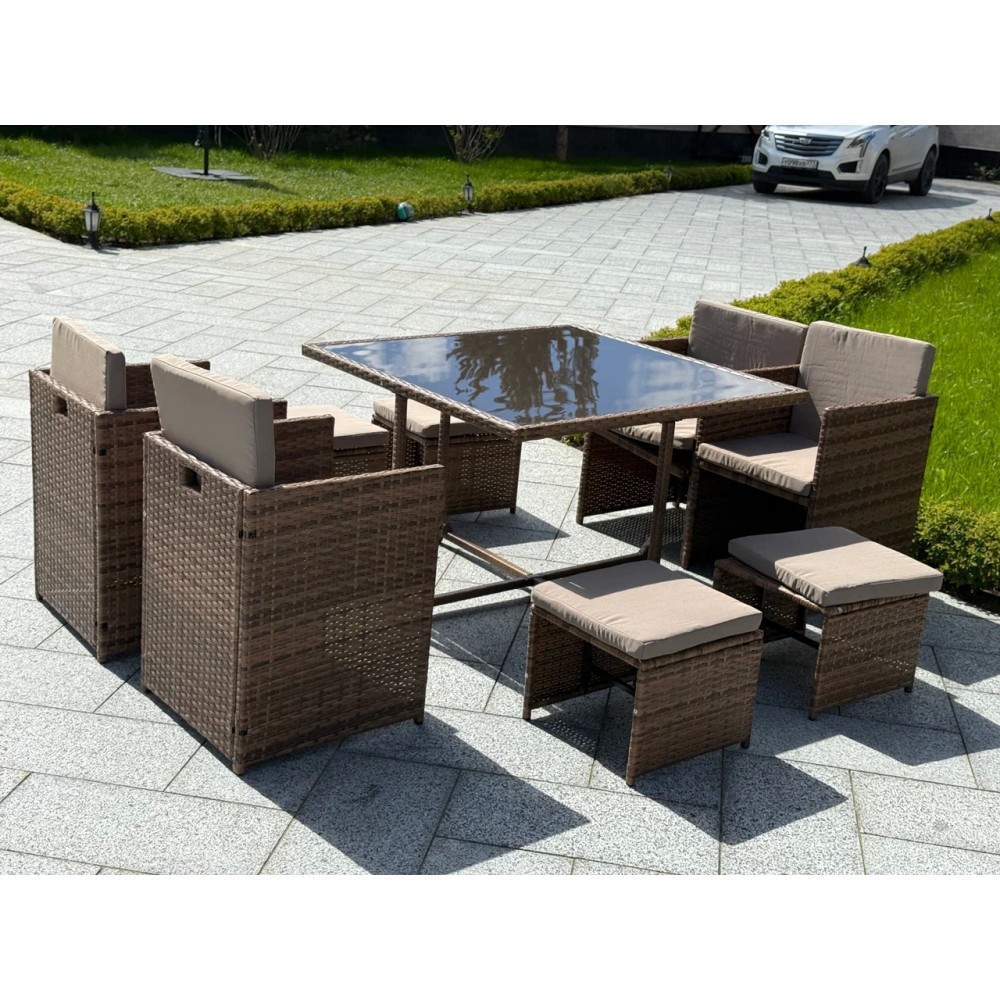 COMO в коричневом цвете — практичный комплект садовой мебели-трансформер, который легко адаптируется под любые задачи. В составе: квадратный стол со стеклянной столешницей, 4 комфортных кресла и 4 пуфа — всего 9 предметов для размещения до 8 человек. Тёплый коричневый оттенок гармонично сочетается с природным ландшафтом, практичен в эксплуатации и идеально подходит для классического стиля, кантри и прованса.
