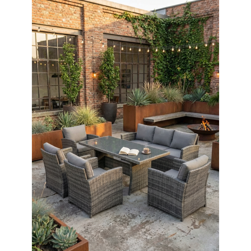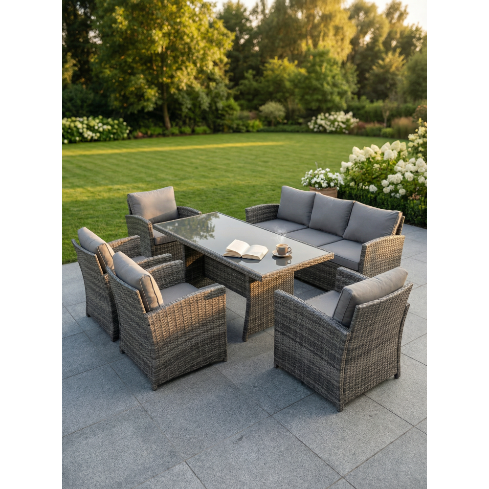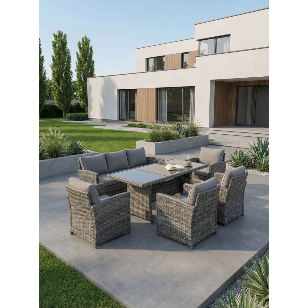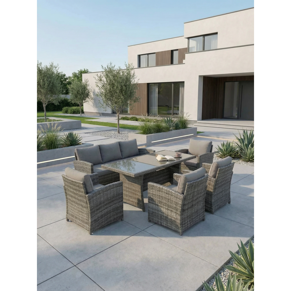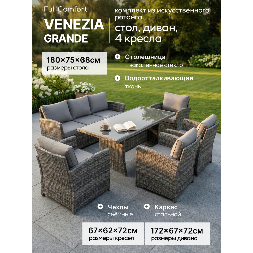 VENEZIA-GRANDE в сером цвете — расширенная версия популярного комплекта, созданная для больших семей и масштабных приёмов гостей на открытом воздухе. В составе: увеличенный обеденный стол 180 см, просторный трёхместный диван и четыре комфортабельных кресла — всего 6 предметов для размещения до 7 человек. Благородный серый оттенок универсален: скрывает пыль, сочетается с любым ландшафтом и подходит к современным архитектурным стилям.