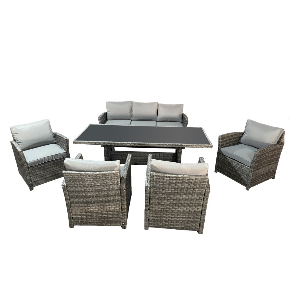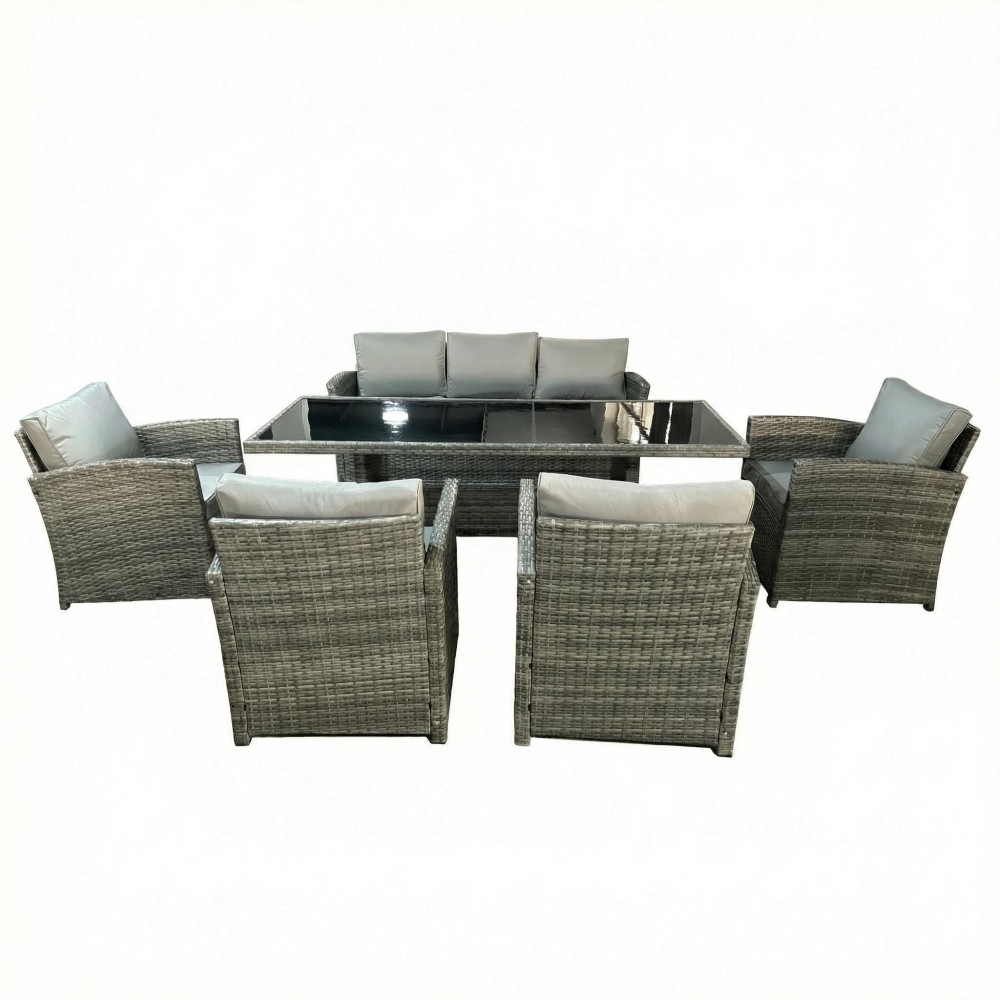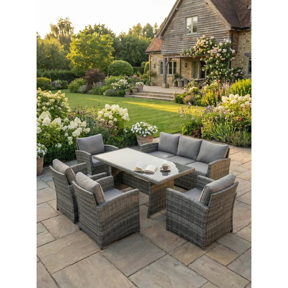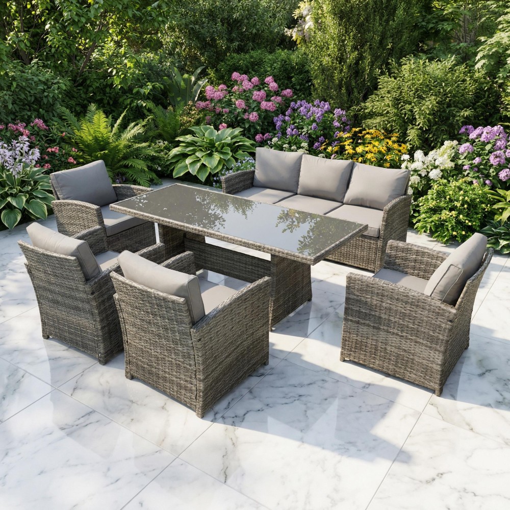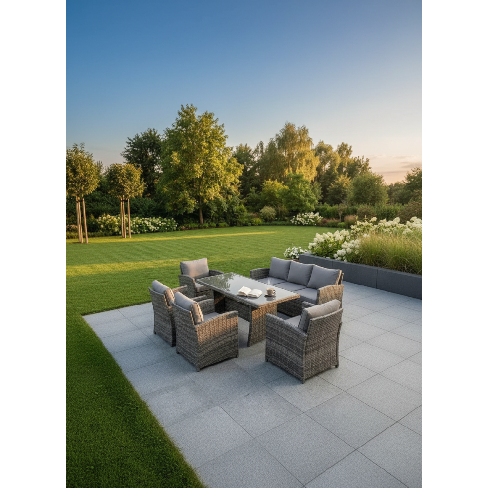 VENEZIA-GRANDE в сером цвете — расширенная версия популярного комплекта, созданная для больших семей и масштабных приёмов гостей на открытом воздухе. В составе: увеличенный обеденный стол 180 см, просторный трёхместный диван и четыре комфортабельных кресла — всего 6 предметов для размещения до 7 человек. Благородный серый оттенок универсален: скрывает пыль, сочетается с любым ландшафтом и подходит к современным архитектурным стилям.