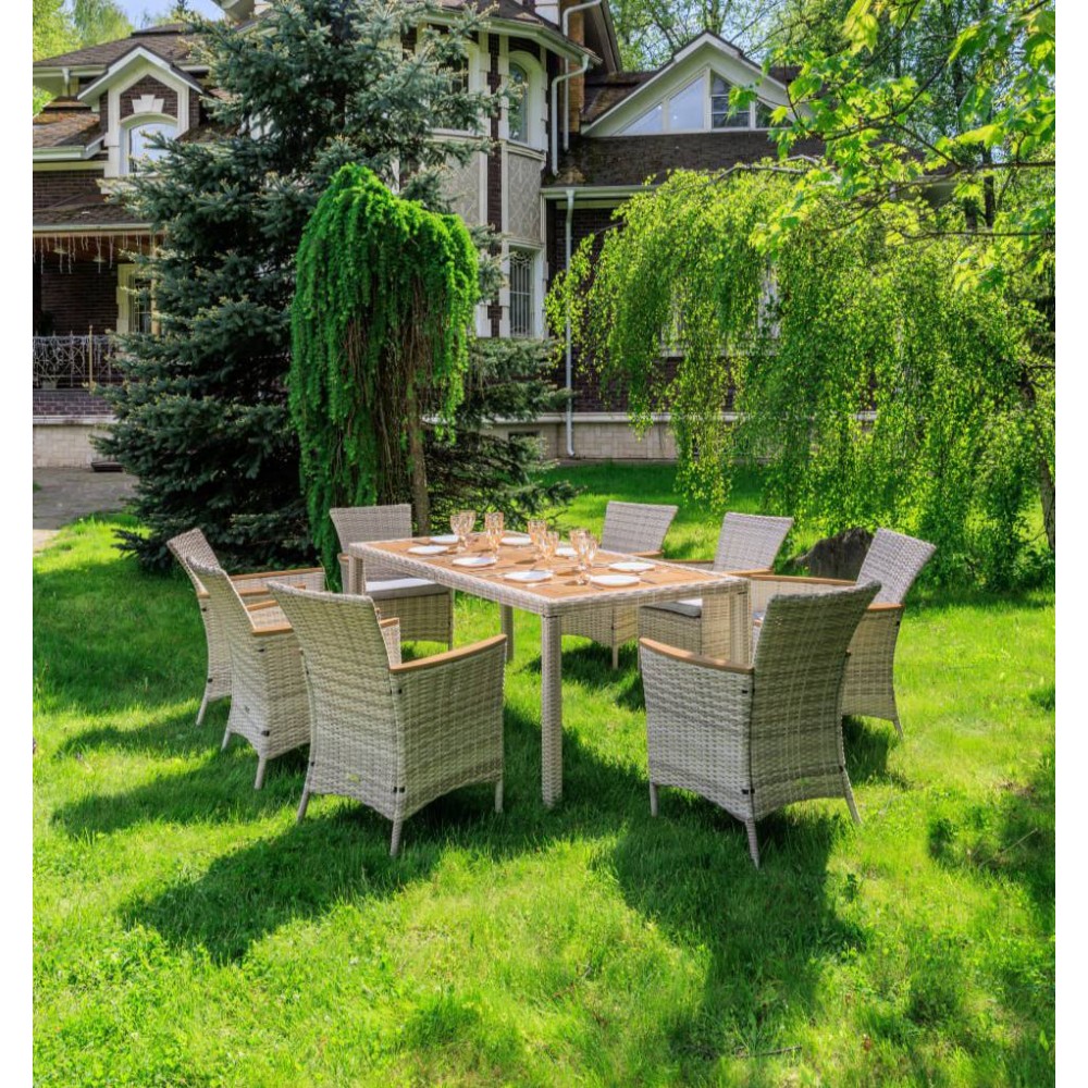 Включает в себя восемь кресел из искусственного ротанга на стальном каркасе и прочный стол.