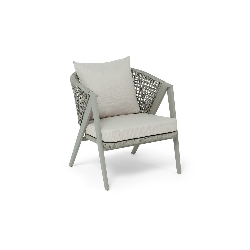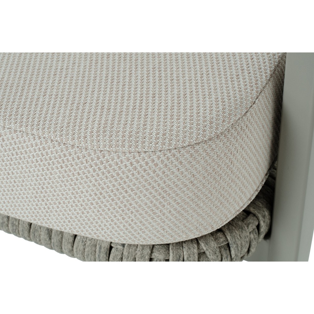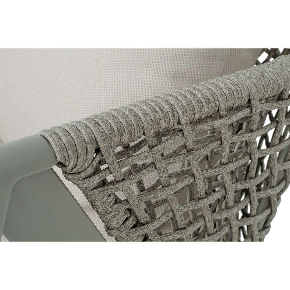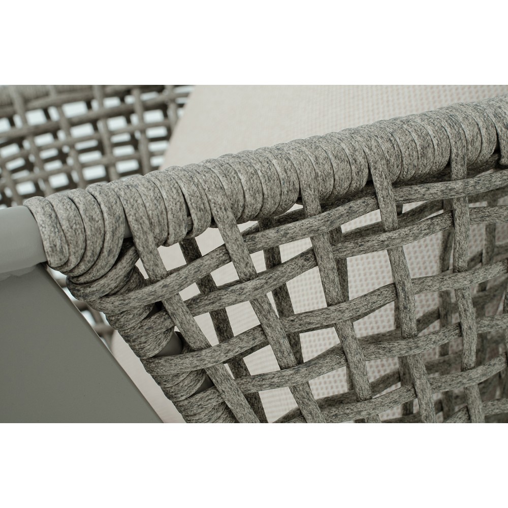 Диван и кресла изготовлены из алюминиевого каркаса, оплетенного вручную эластичными синтетическими лентами из высокопрочных полиэфирных волокон. Роуп является гипоаллергенным, прочным, износостойким и устойчивым к ультрафиолету. Цвет каркаса и оплетки – серый. На ножках стула идут черные пластиковые наконечники (заглушки).