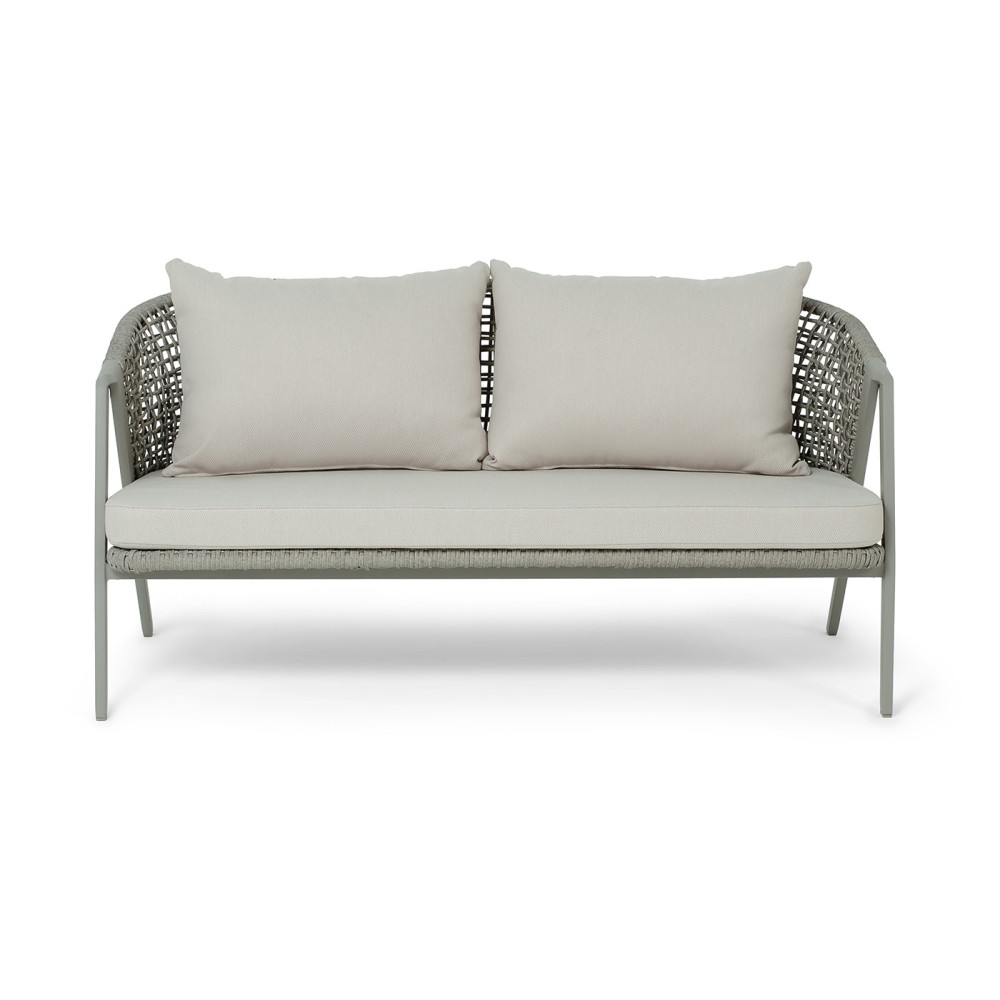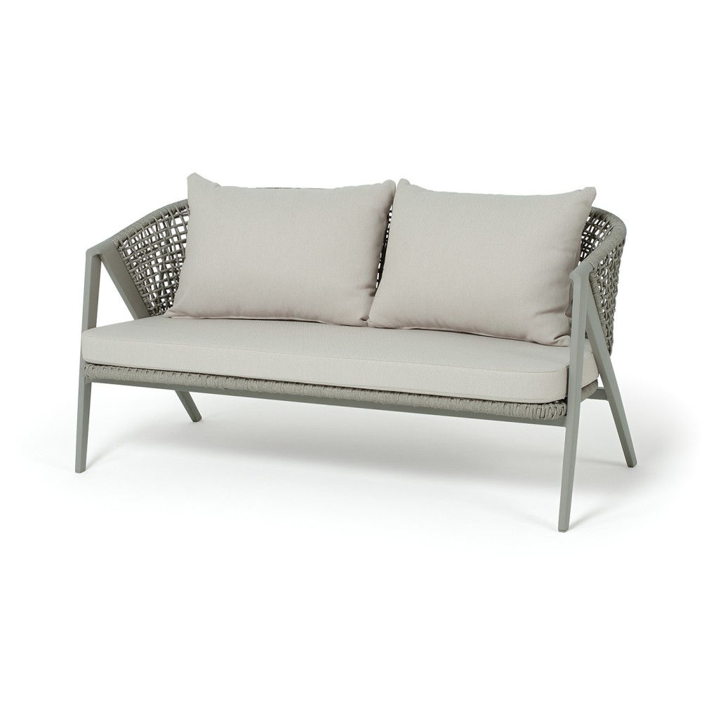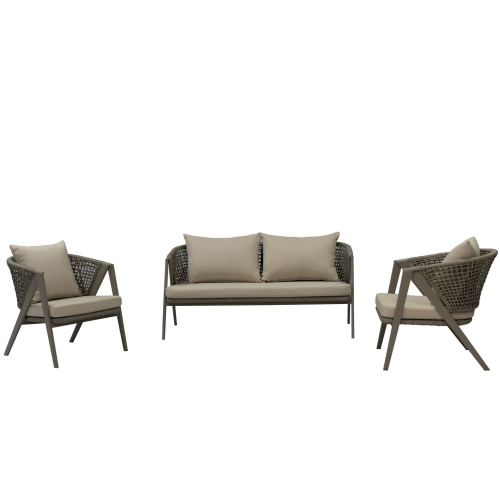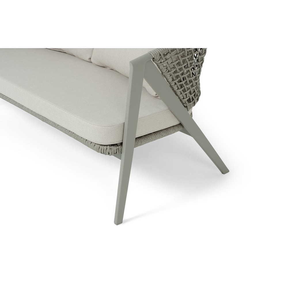 Диван и кресла изготовлены из алюминиевого каркаса, оплетенного вручную эластичными синтетическими лентами из высокопрочных полиэфирных волокон. Роуп является гипоаллергенным, прочным, износостойким и устойчивым к ультрафиолету. Цвет каркаса и оплетки – серый. На ножках стула идут черные пластиковые наконечники (заглушки).