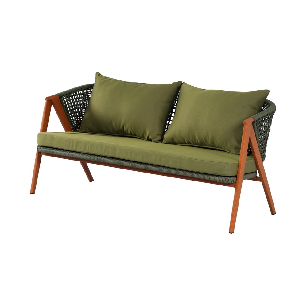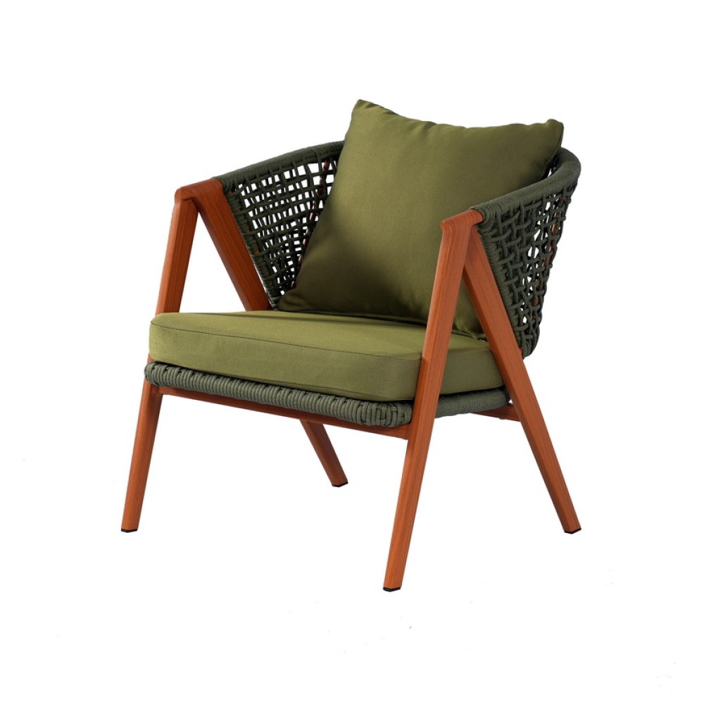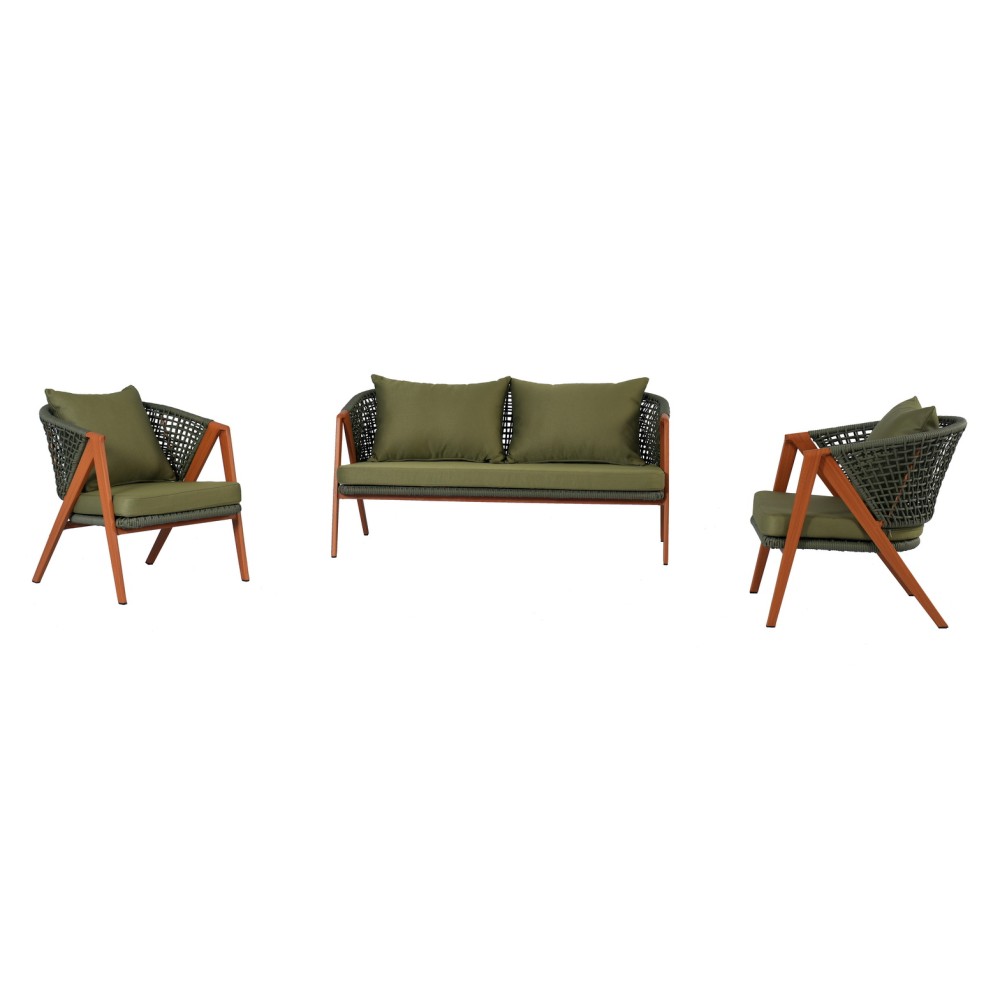 Диван и кресла изготовлены из алюминиевого каркаса, оплетенного вручную эластичными синтетическими лентами из высокопрочных полиэфирных волокон. Роуп является гипоаллергенным, прочным, износостойким и устойчивым к ультрафиолету. Цвет каркаса – «под дерево», оплетки - зеленый. На ножках стула идут черные пластиковые наконечники (заглушки).