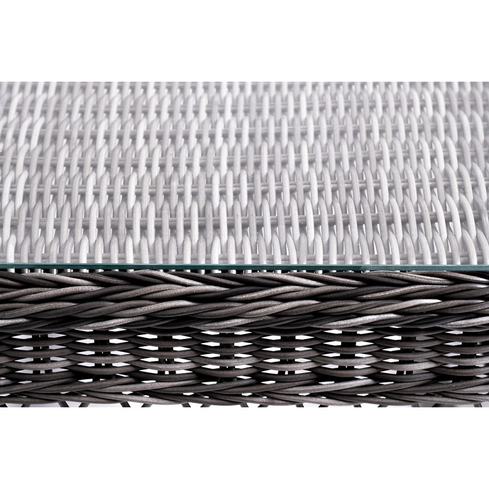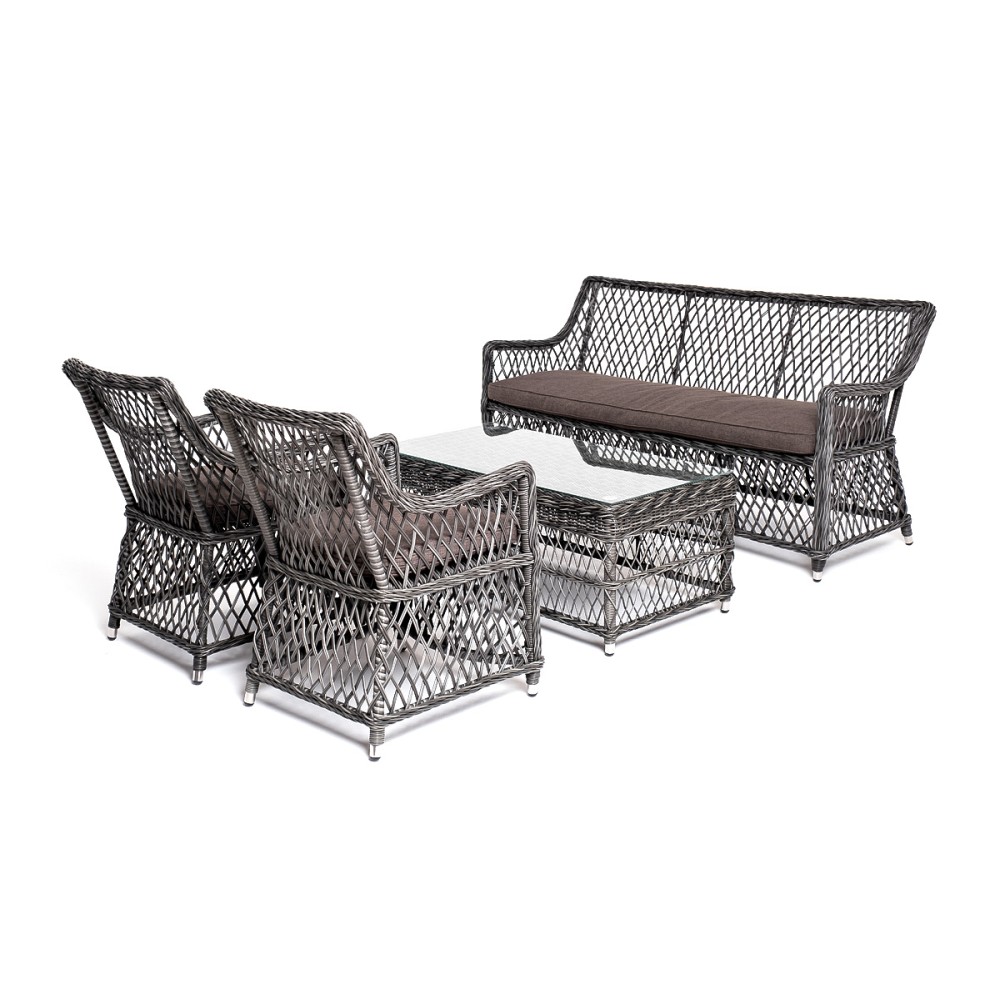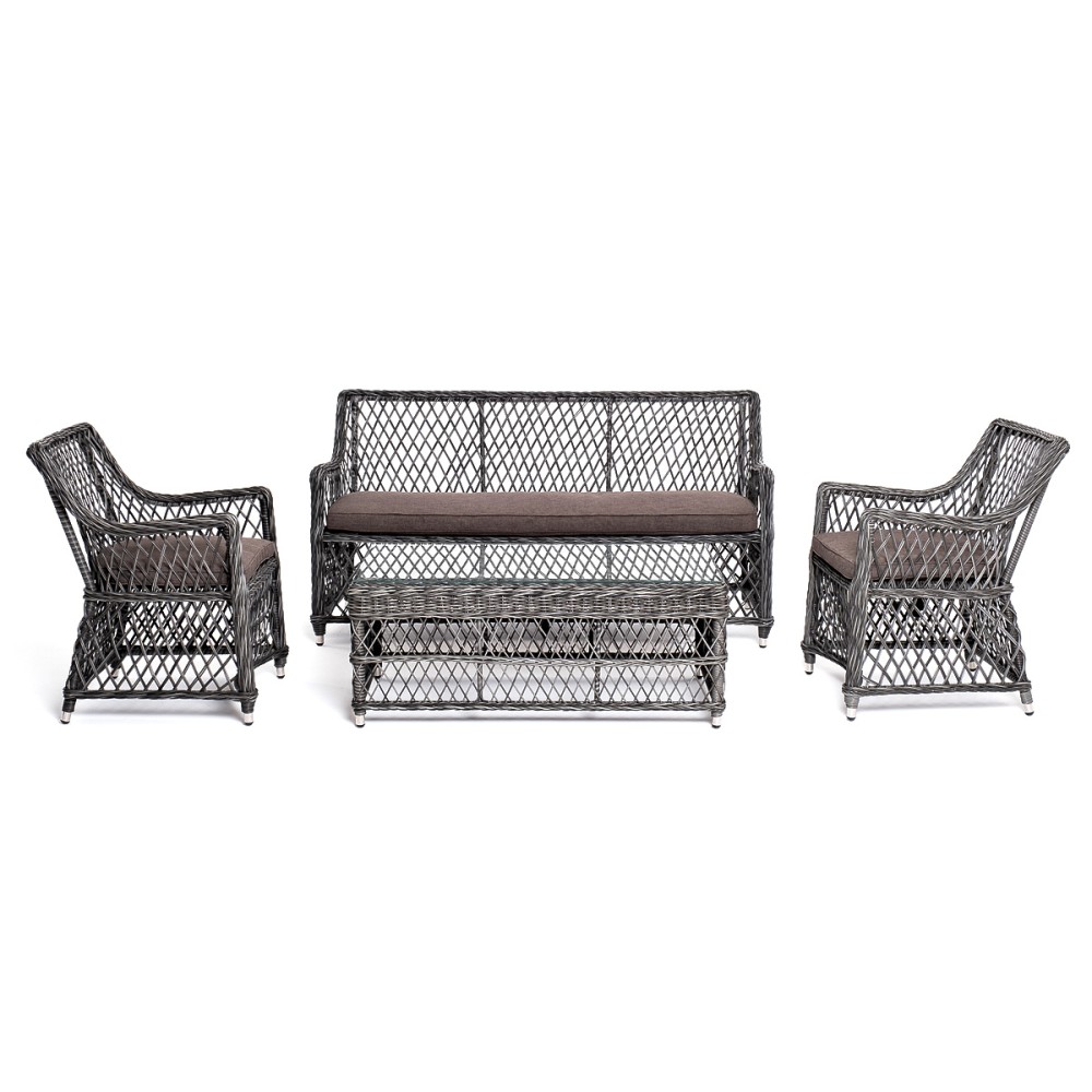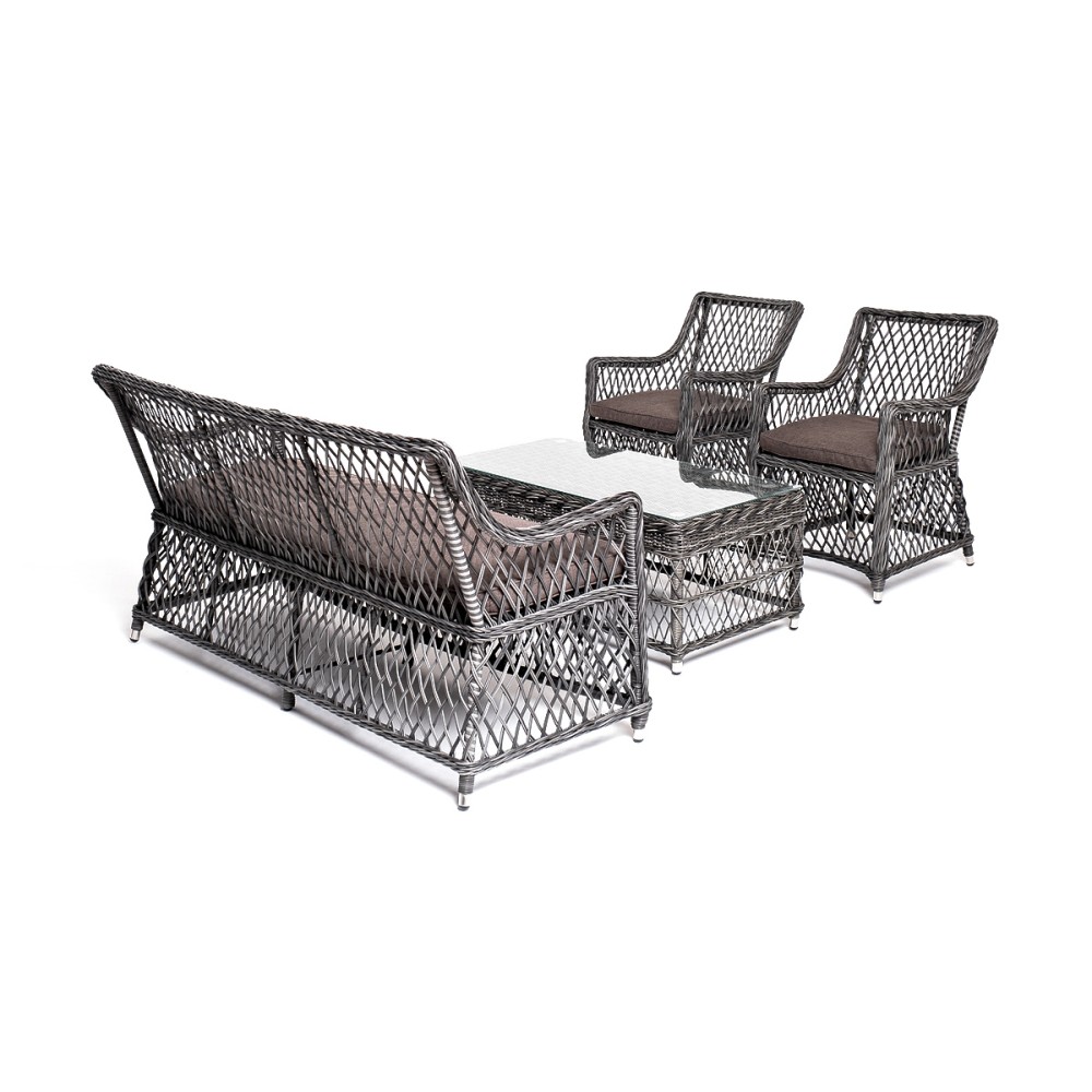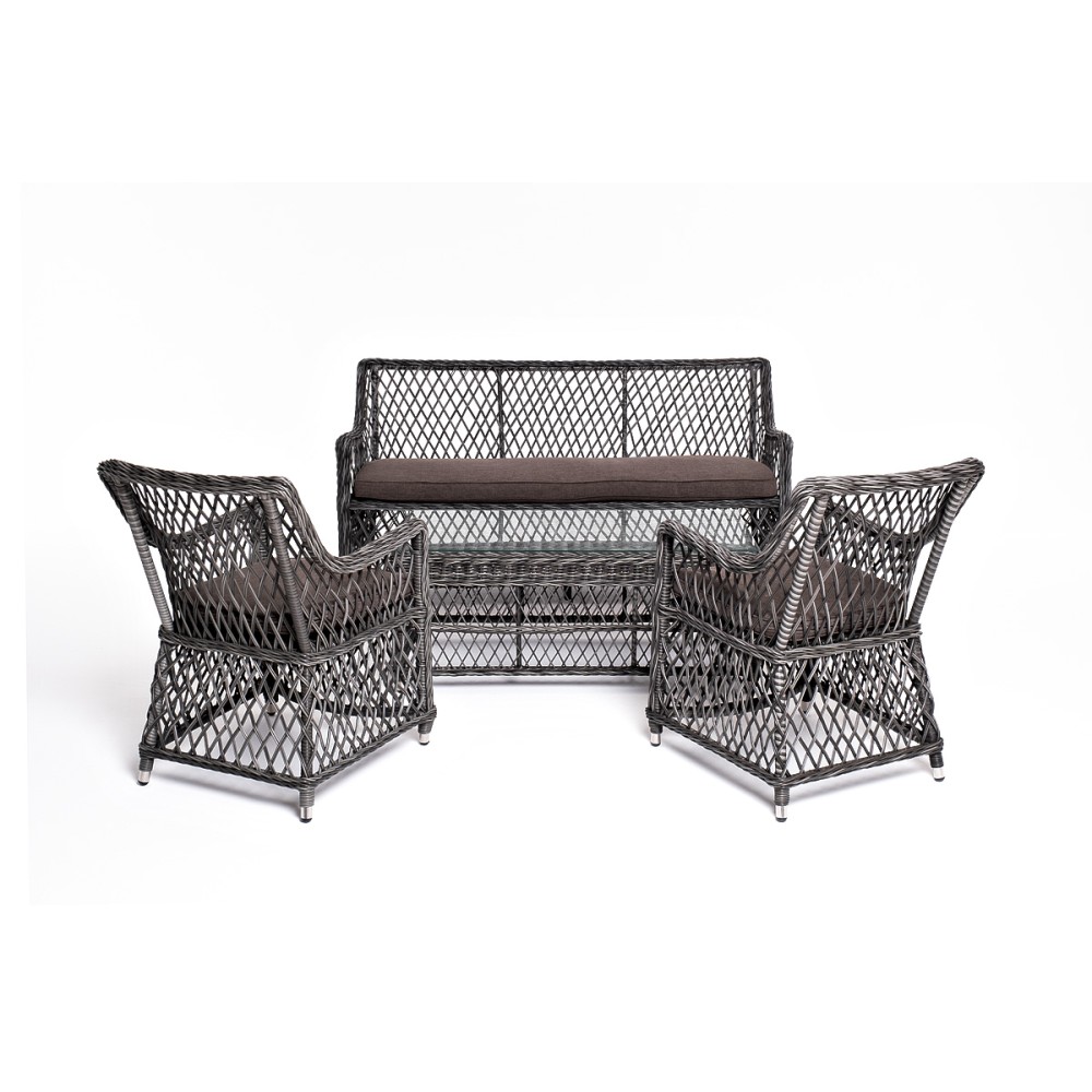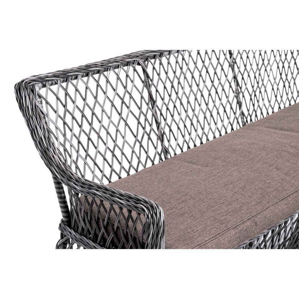 Оплетка выполнена вручную искусственным ротангом в цвете графит, диван и кресло укомплектованы подушками из 100% полиэстера, которые пропитаны специальным составом, обладающим влагоотталкивающим свойством.
