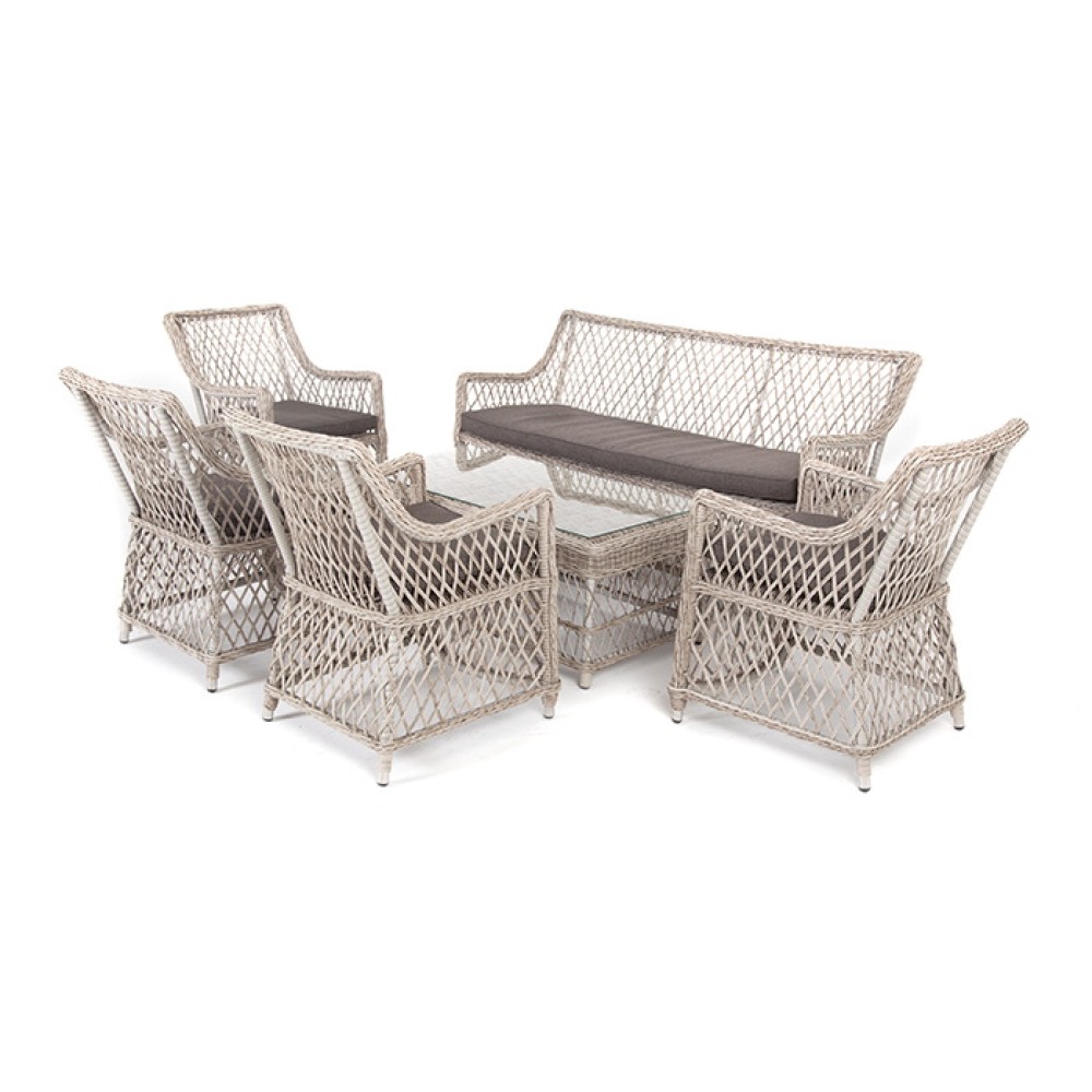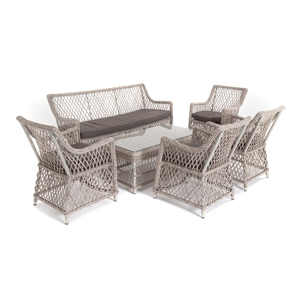 Лаунж-зона «Асти» подходит для размещения 6 персон. За прочность конструкции отвечает каркас из алюминия.