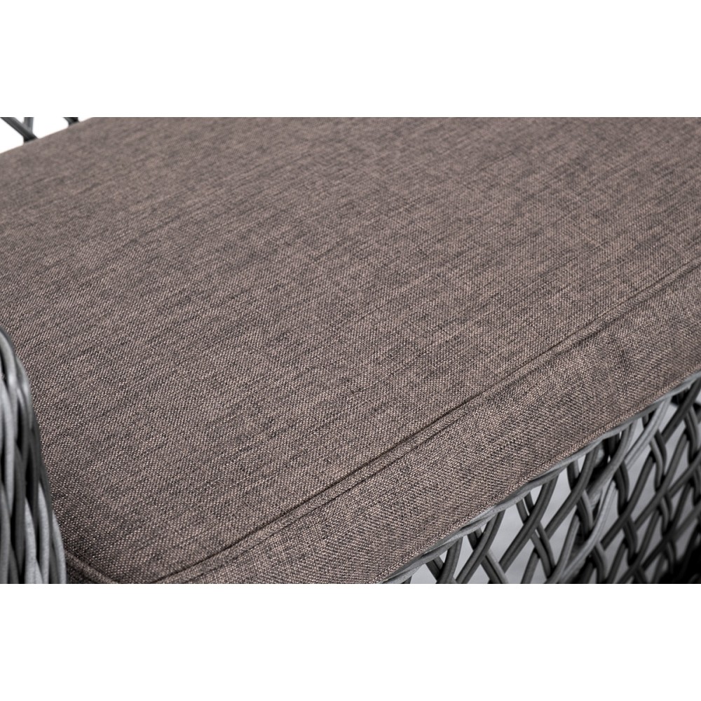 Оплетка выполнена вручную искусственным ротангом в цвете графит, диван и кресло укомплектованы подушками из 100% полиэстера, которые пропитаны специальным составом, обладающим влагоотталкивающим свойством.