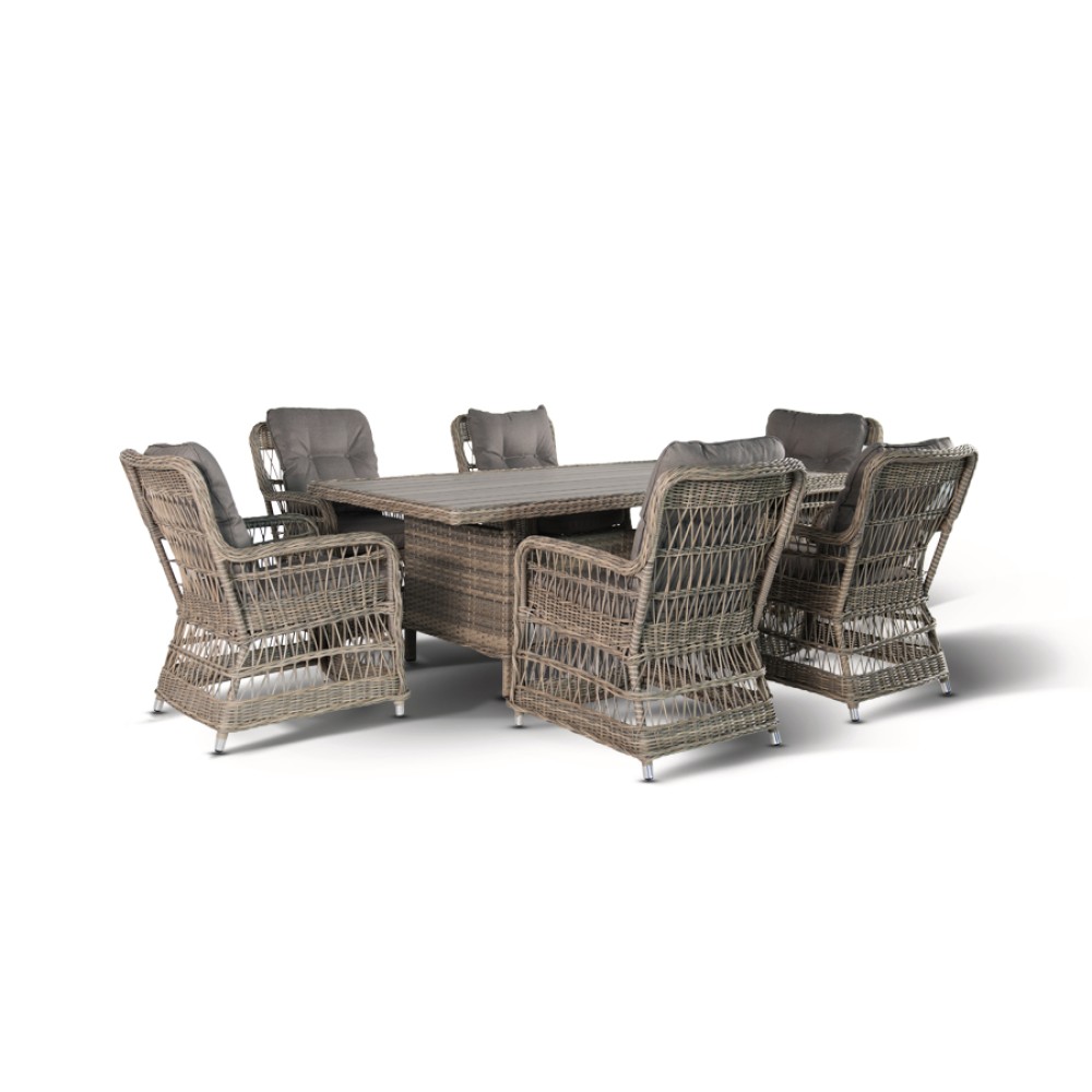 Садовая обеденная группа на 6 персон «Цесена» из ротанга. В комплекте: большой прямоугольный обеденный стол (2000×1000×720 мм) и 6 кресел (780×630×920 мм).