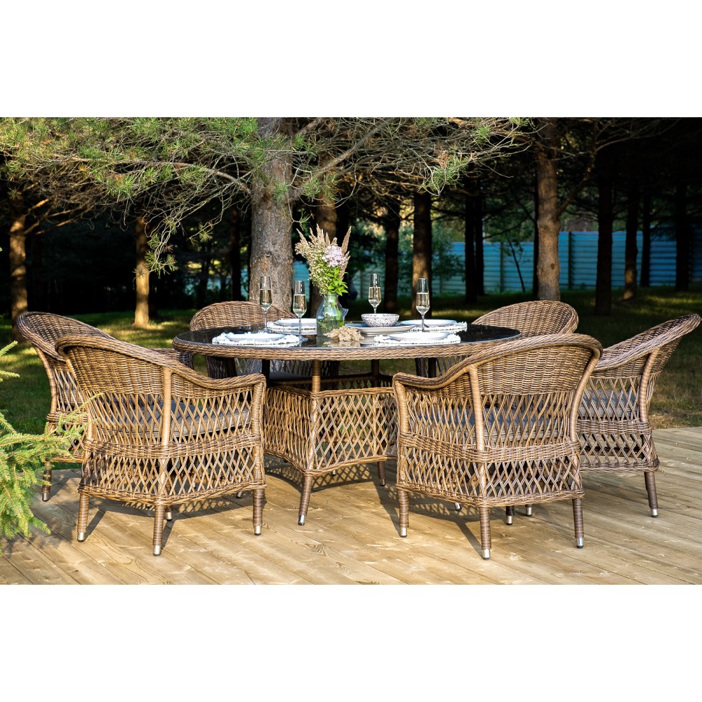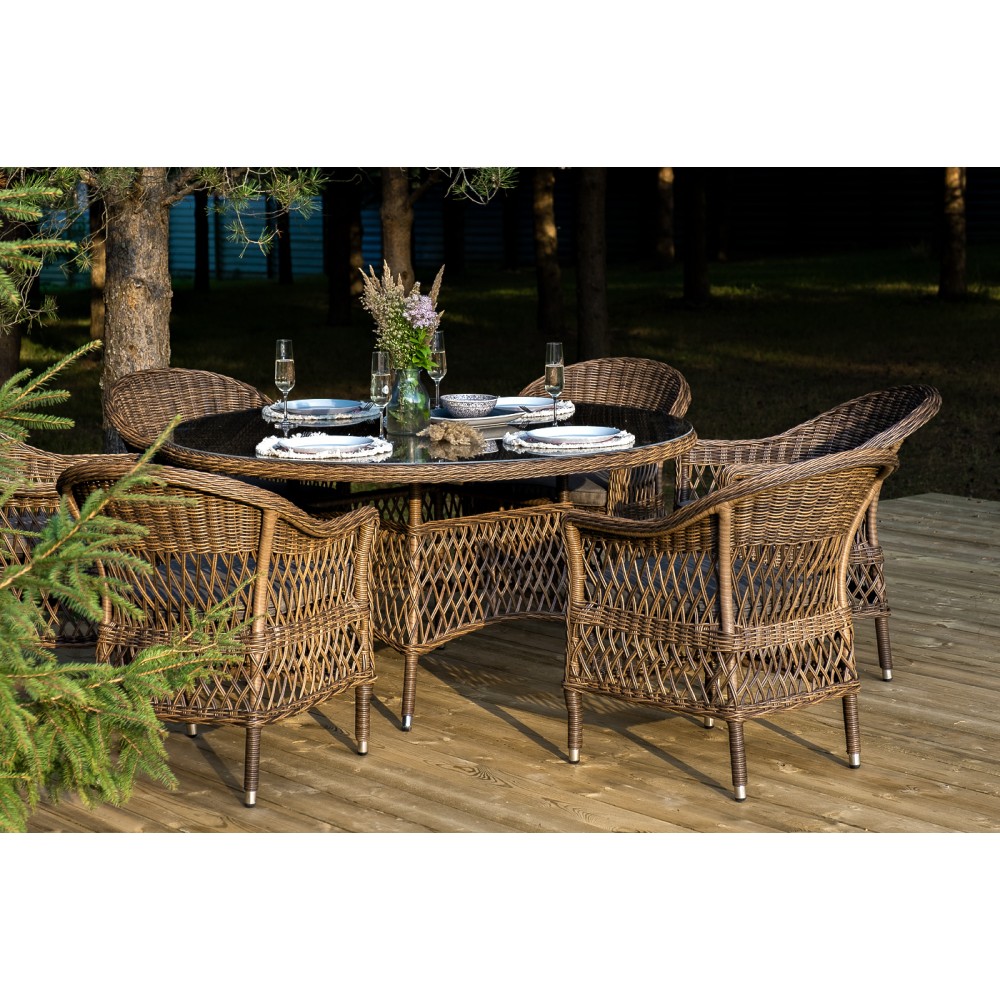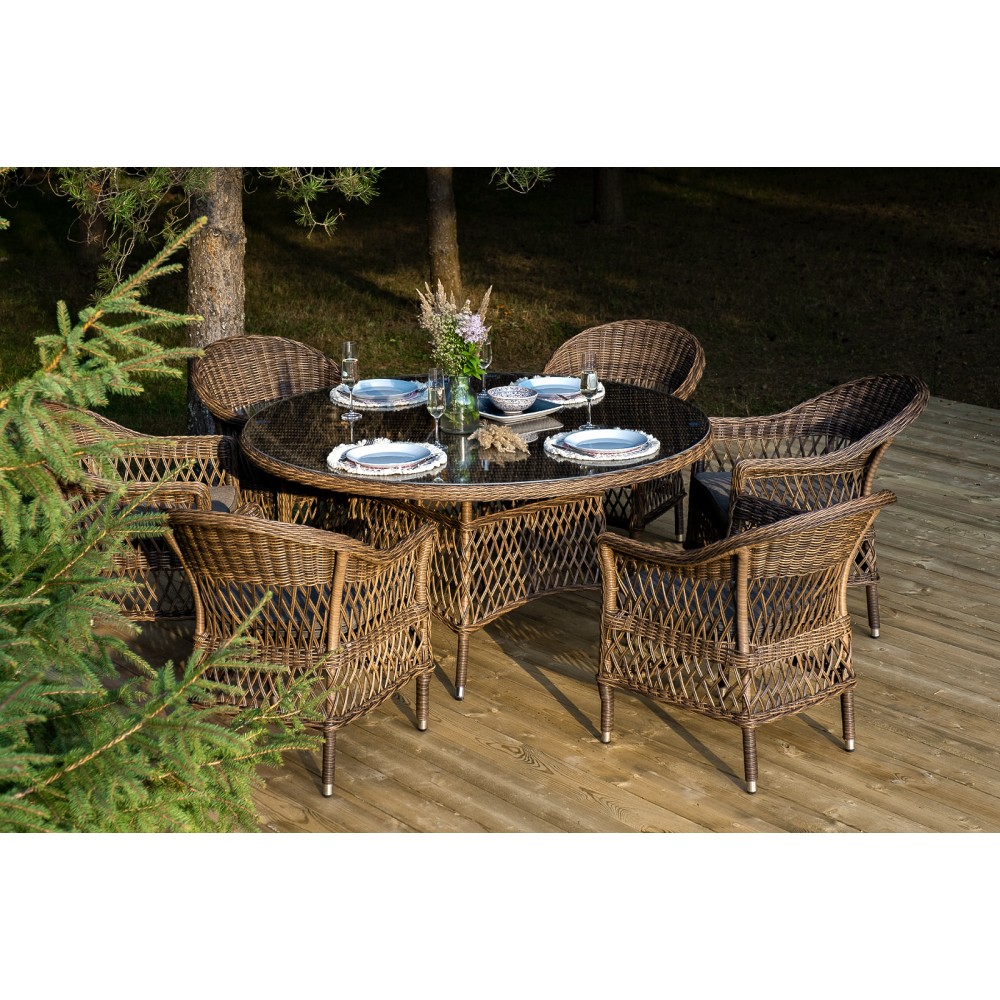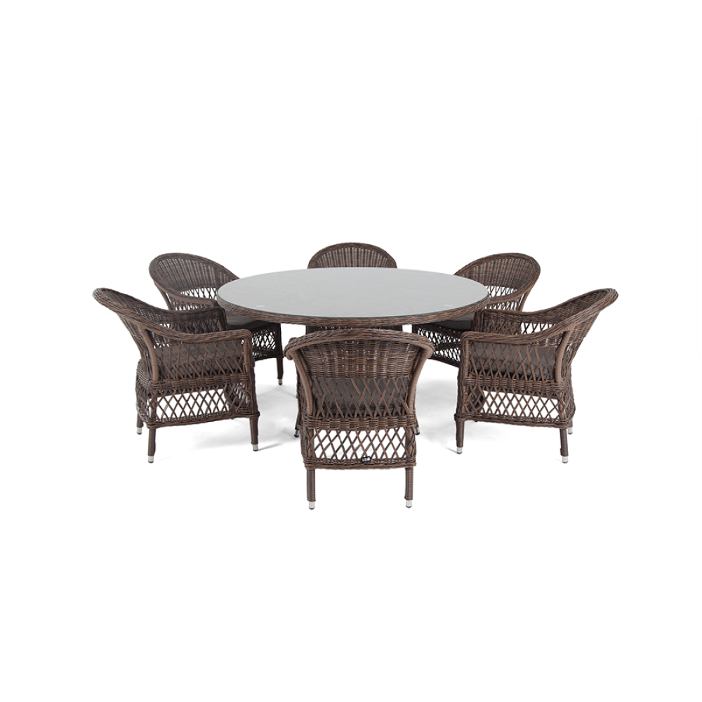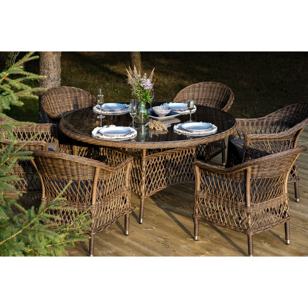 Вся мебель изготовлена из долговечного и легкого алюминия, обтянутого синтетическим ротангом. На столе для удобства эксплуатации предусмотрена столешница из ударопрочного закаленного стекла 5 мм. Стулья укомплектованы подушками на сидениях. "Эспрессо" плетеный круглый стол, диаметр 150 см, цвет коричневый 1шт. 1 500Х1 500Х750, "Сицилия" плетеный стул из искусственного ротанга, цвет коричневый 6шт. 590Х640Х820,