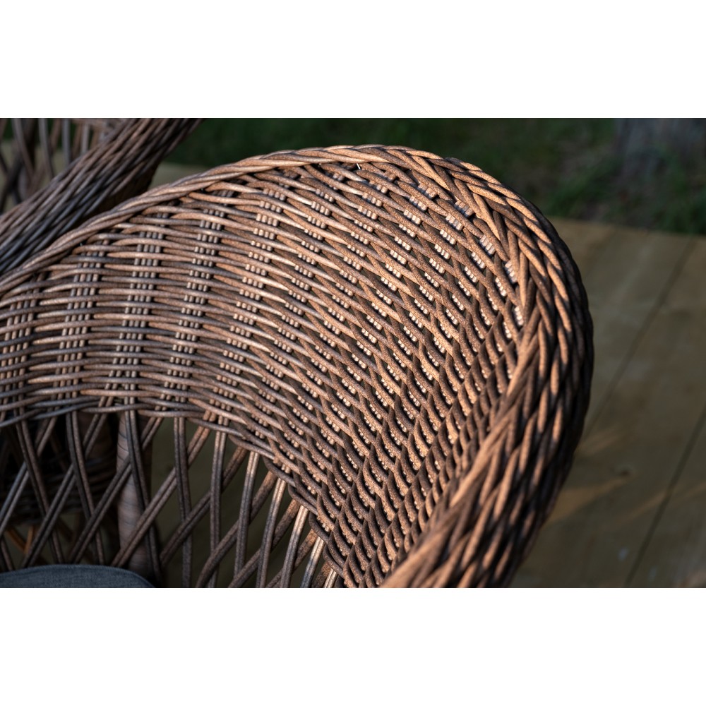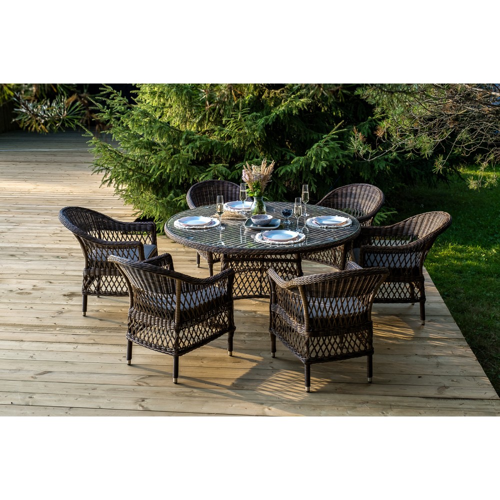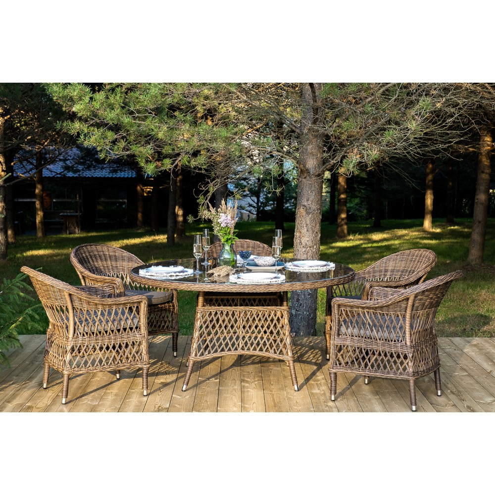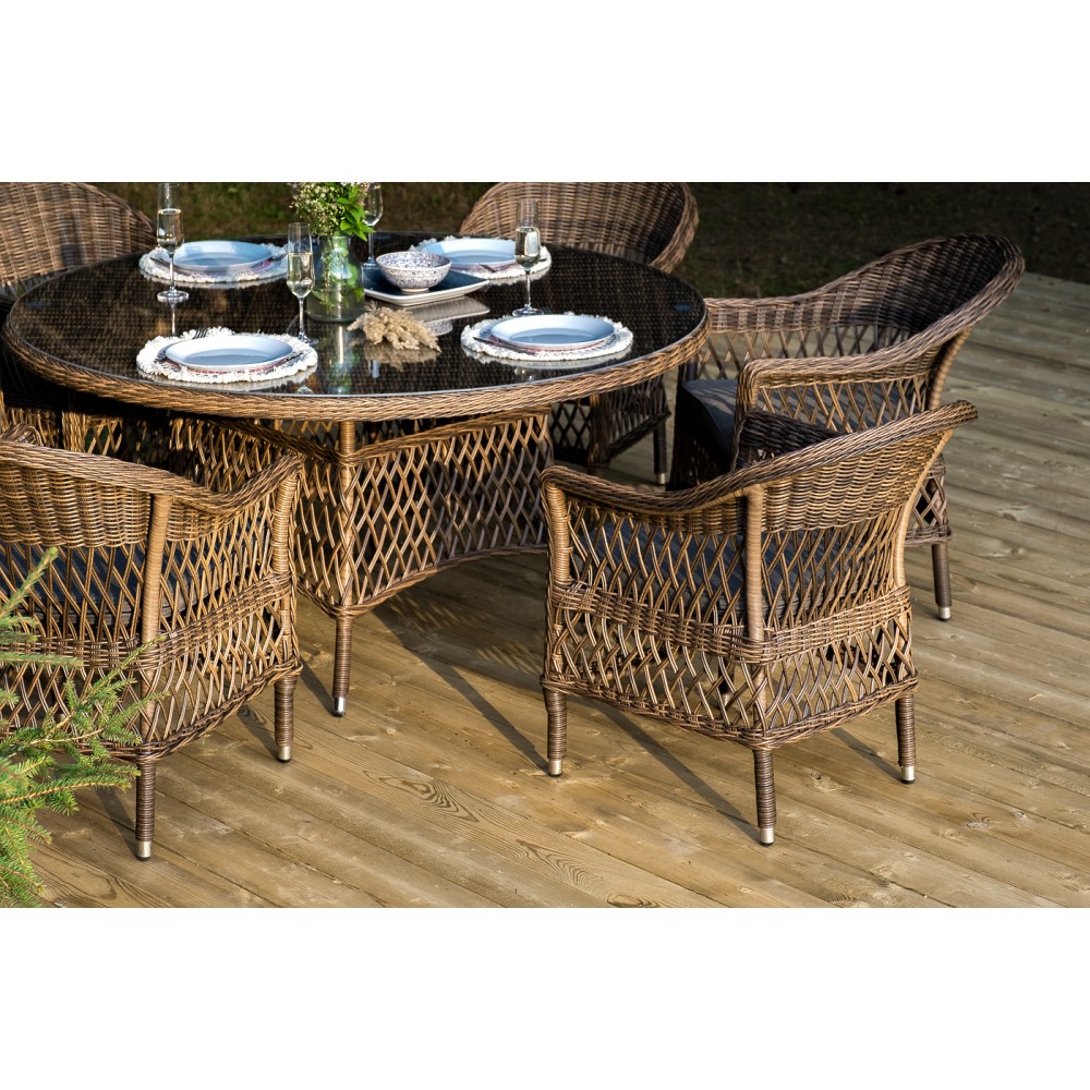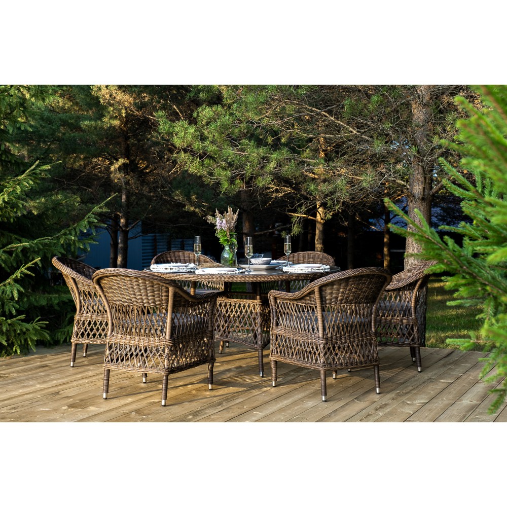 Вся мебель изготовлена из долговечного и легкого алюминия, обтянутого синтетическим ротангом. На столе для удобства эксплуатации предусмотрена столешница из ударопрочного закаленного стекла 5 мм. Стулья укомплектованы подушками на сидениях. "Эспрессо" плетеный круглый стол, диаметр 150 см, цвет коричневый 1шт. 1 500Х1 500Х750, "Сицилия" плетеный стул из искусственного ротанга, цвет коричневый 6шт. 590Х640Х820,