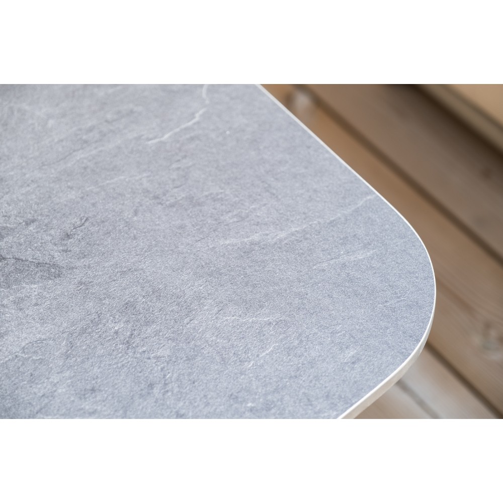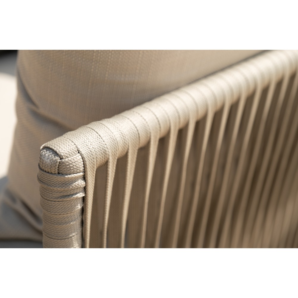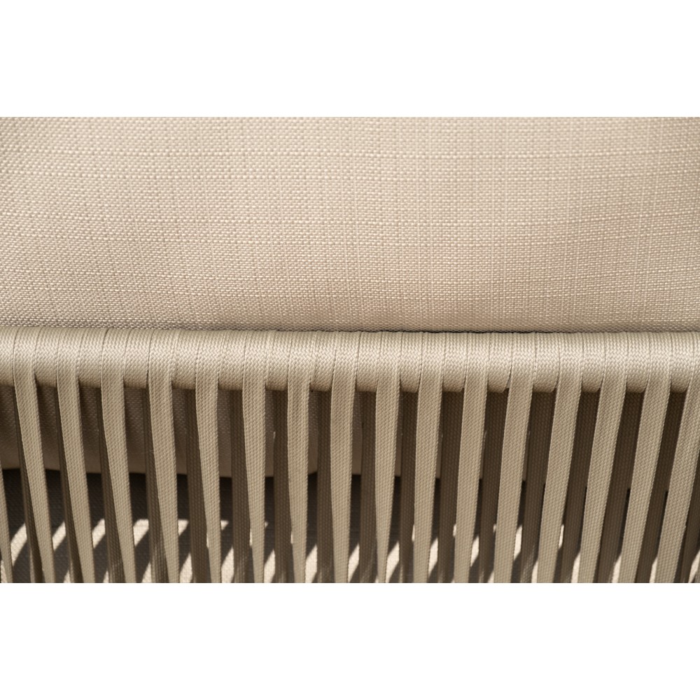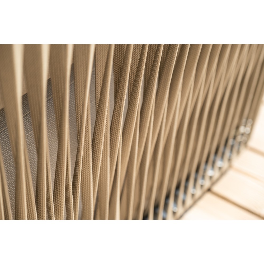 Каркас уличной мебели выполнен из износостойкого алюминия. Его дополняет серо-коричневая ручная оплетка, изготовленная на основе эластичных синтетических лент из полиэфирных волокон высокой прочности (роупа).