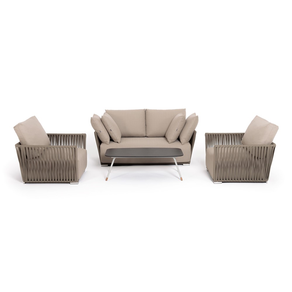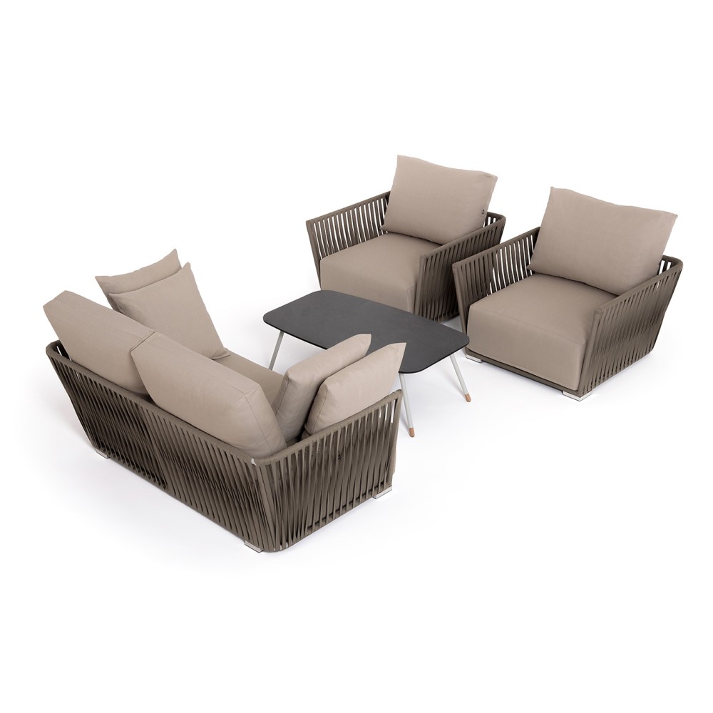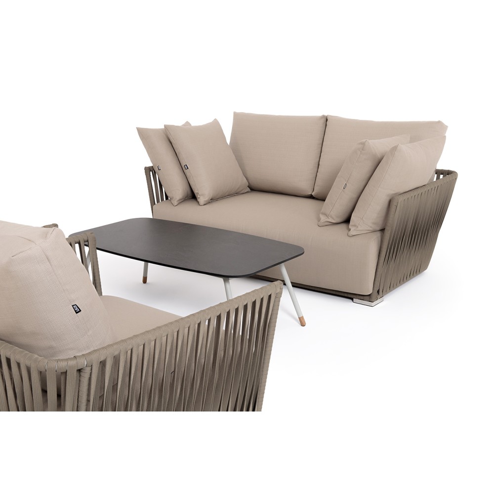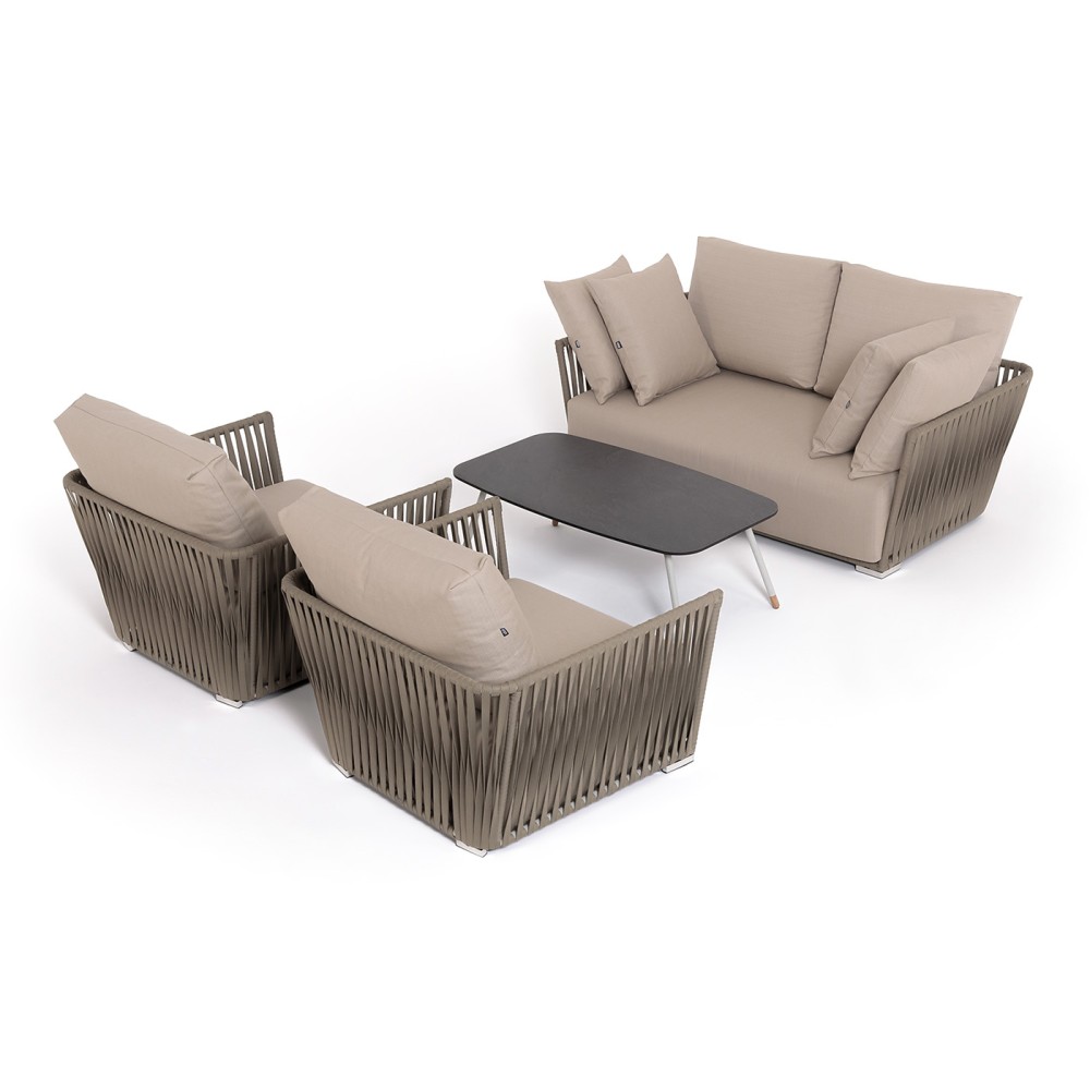 "Верона" журнальный стол из HPL 120х65, H40, каркас светло-серый (RA L7035) муар, цвет столешницы "серый гранит" 1шт. 1 200Х650Х400, "Форли" диван 2-местный плетеный из роупа, каркас алюминий светло-серый (RAL7035) муар, роуп серо-коричневый 23мм, ткань Mossle бежевая 1шт. 1 770Х920Х610, "Форли" кресло плетеное из роупа, каркас алюминий светло-серый (RAL7035) муар, роуп серо-коричневый 23мм, ткань Mossle бежевая 2шт. 1 070Х920Х610,