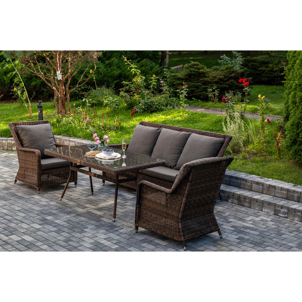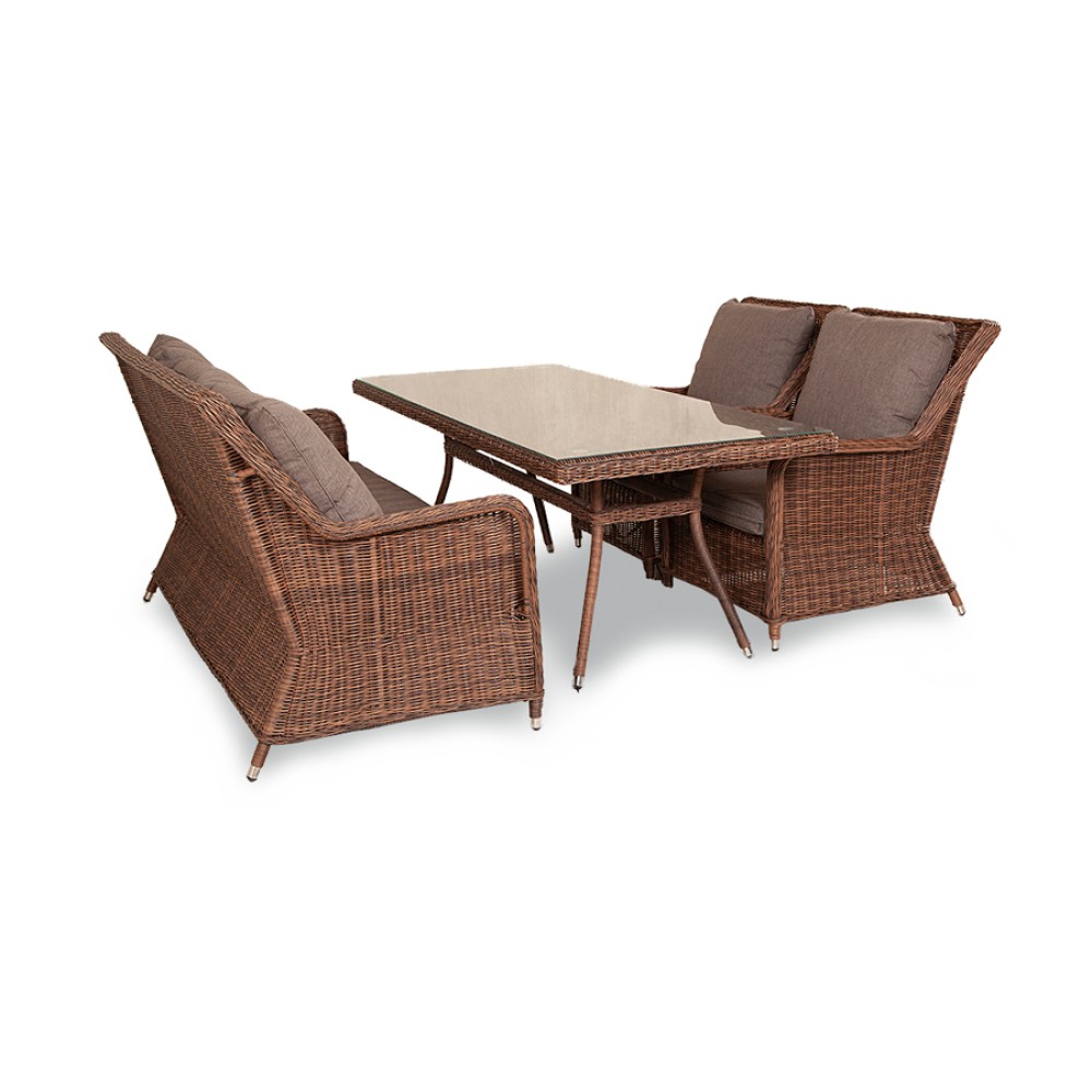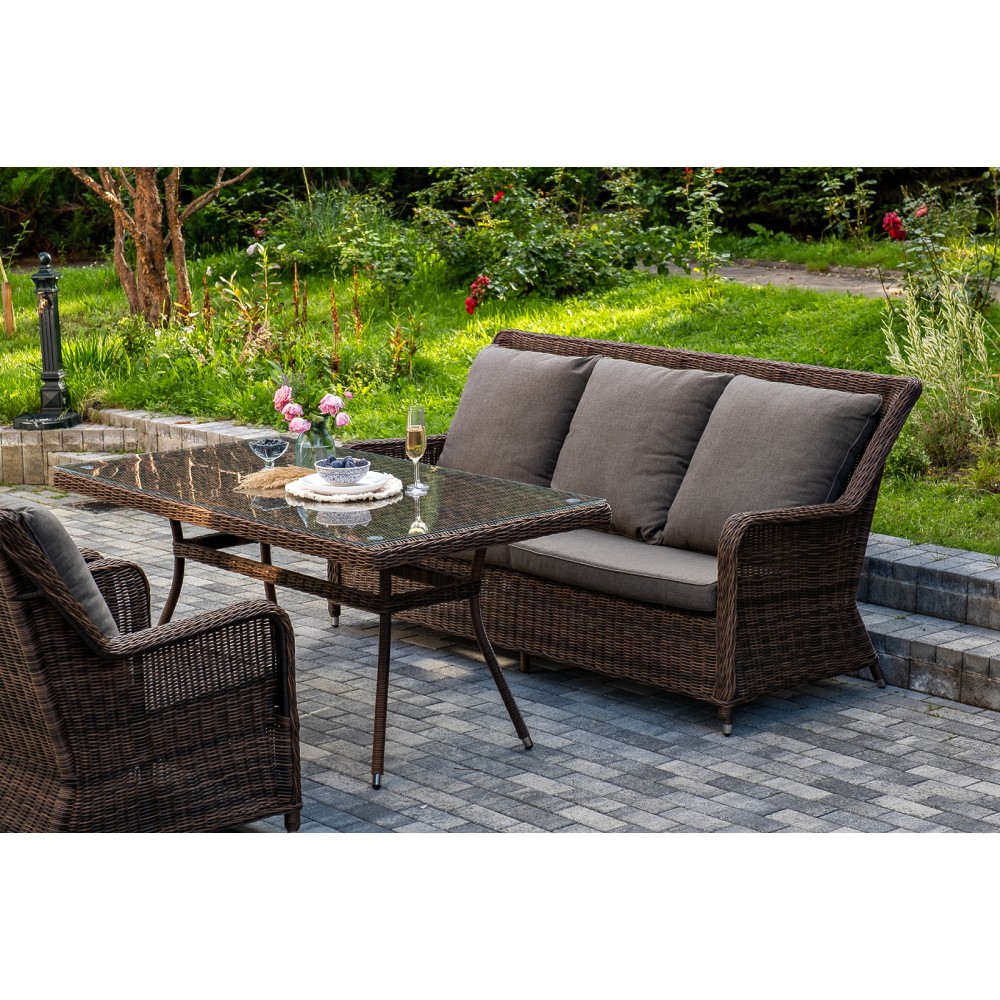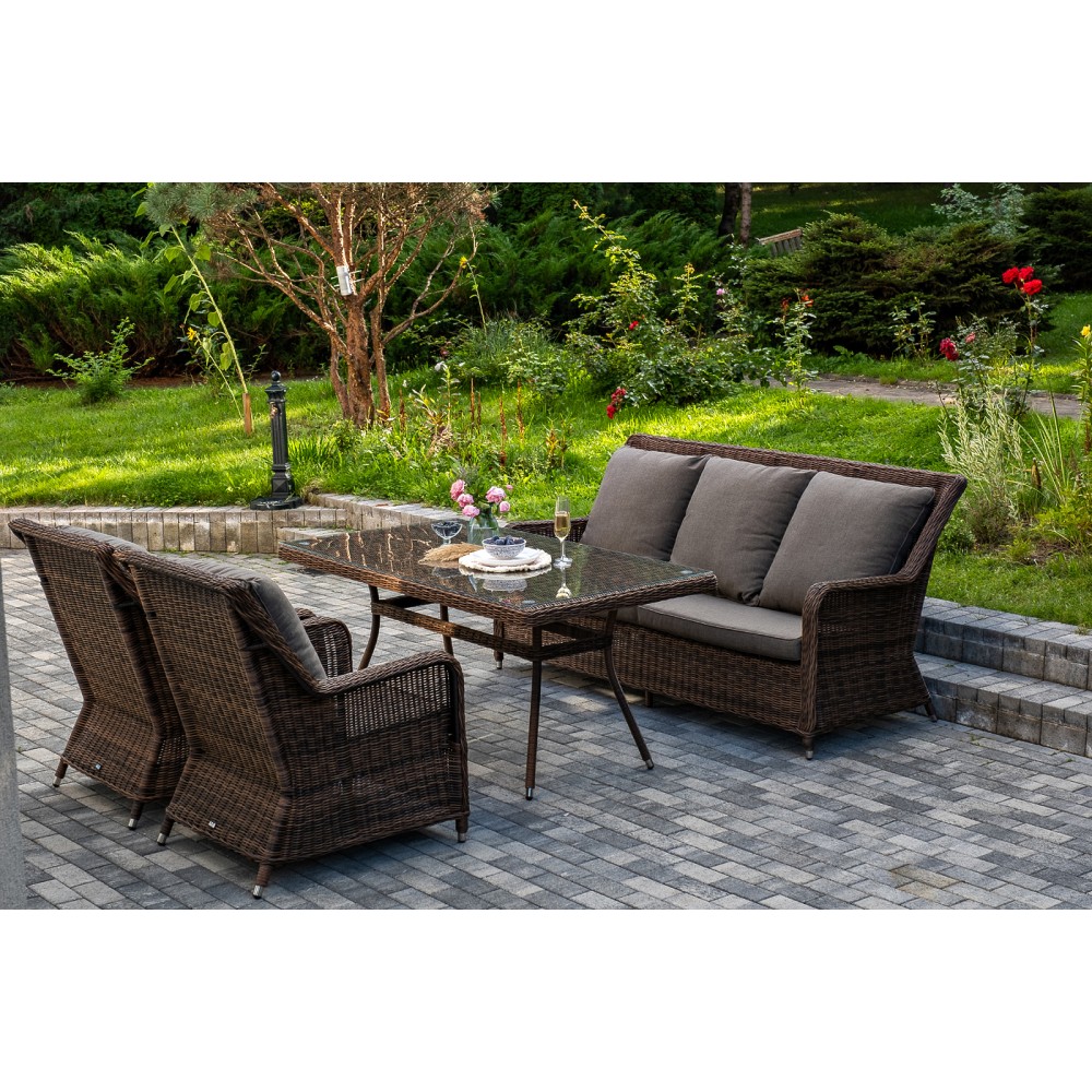 Столешница обеденного стола изготовлена из высокопрочного закаленного стекла, которое по стандартам используется в пищевой промышленности. "Гляссе" диван трехместный из искусственного ротанга, цвет коричневый 1шт. 1 900Х880Х990, "Гляссе" кресло плетеное из искусственого ротанга, цвет коричневый 2шт. 730Х880Х990, "Латте" плетеный стол из искусственного ротанга 160х90см, цвет коричневый 1шт. 1 600Х900Х750,