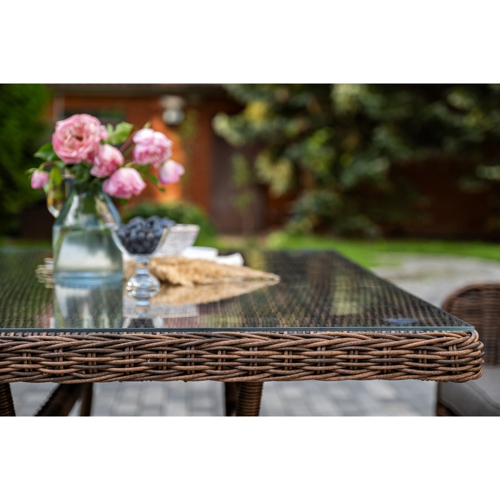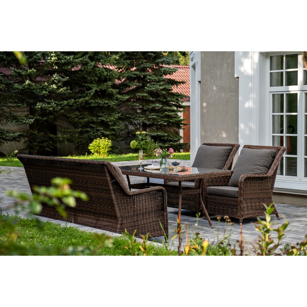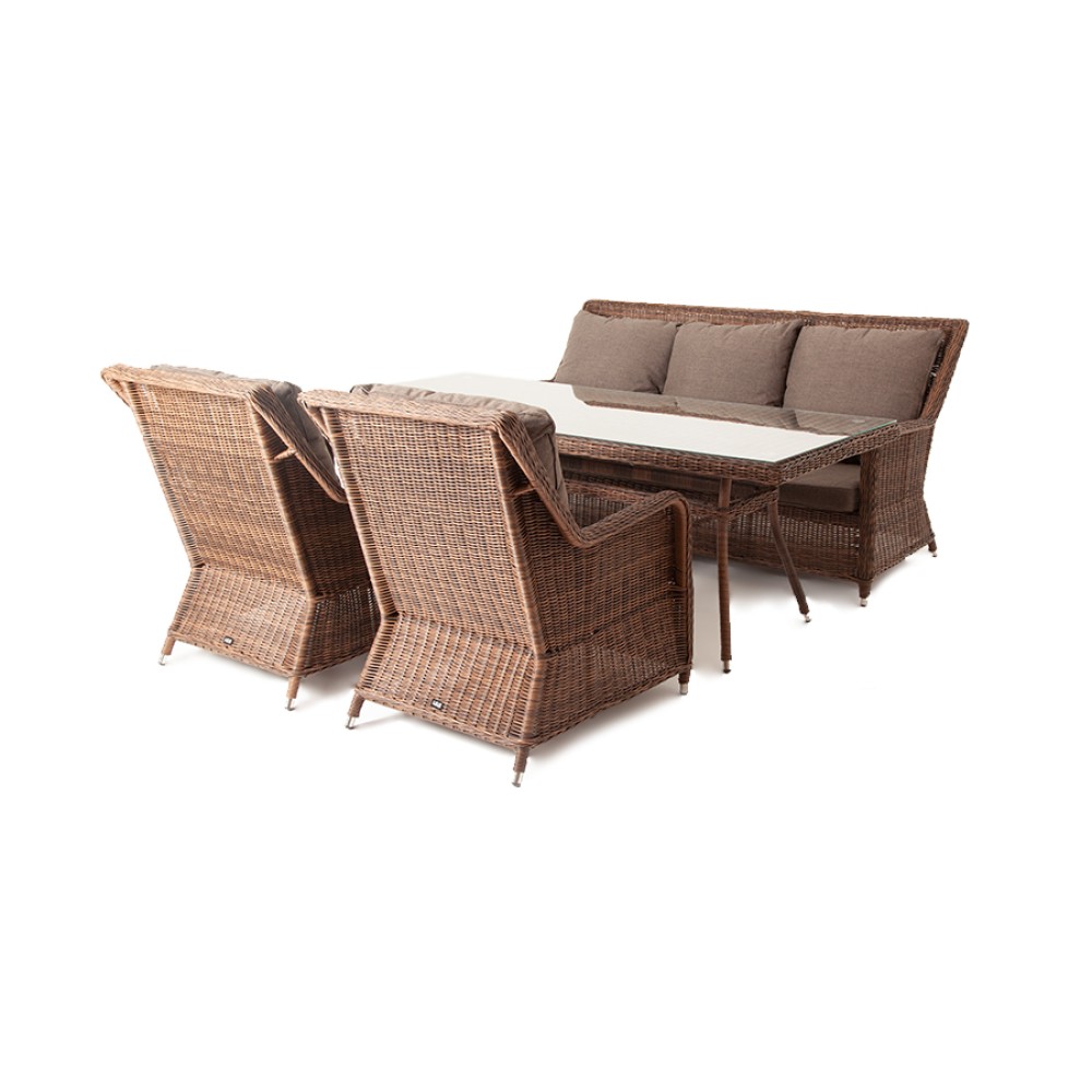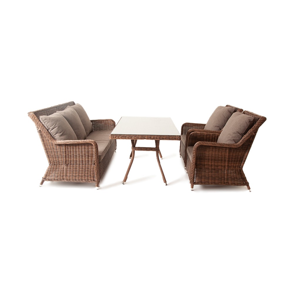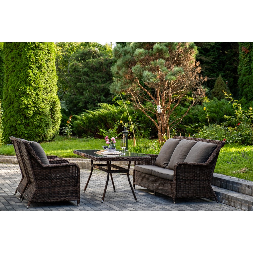 Столешница обеденного стола изготовлена из высокопрочного закаленного стекла, которое по стандартам используется в пищевой промышленности. "Гляссе" диван трехместный из искусственного ротанга, цвет коричневый 1шт. 1 900Х880Х990, "Гляссе" кресло плетеное из искусственого ротанга, цвет коричневый 2шт. 730Х880Х990, "Латте" плетеный стол из искусственного ротанга 160х90см, цвет коричневый 1шт. 1 600Х900Х750,
