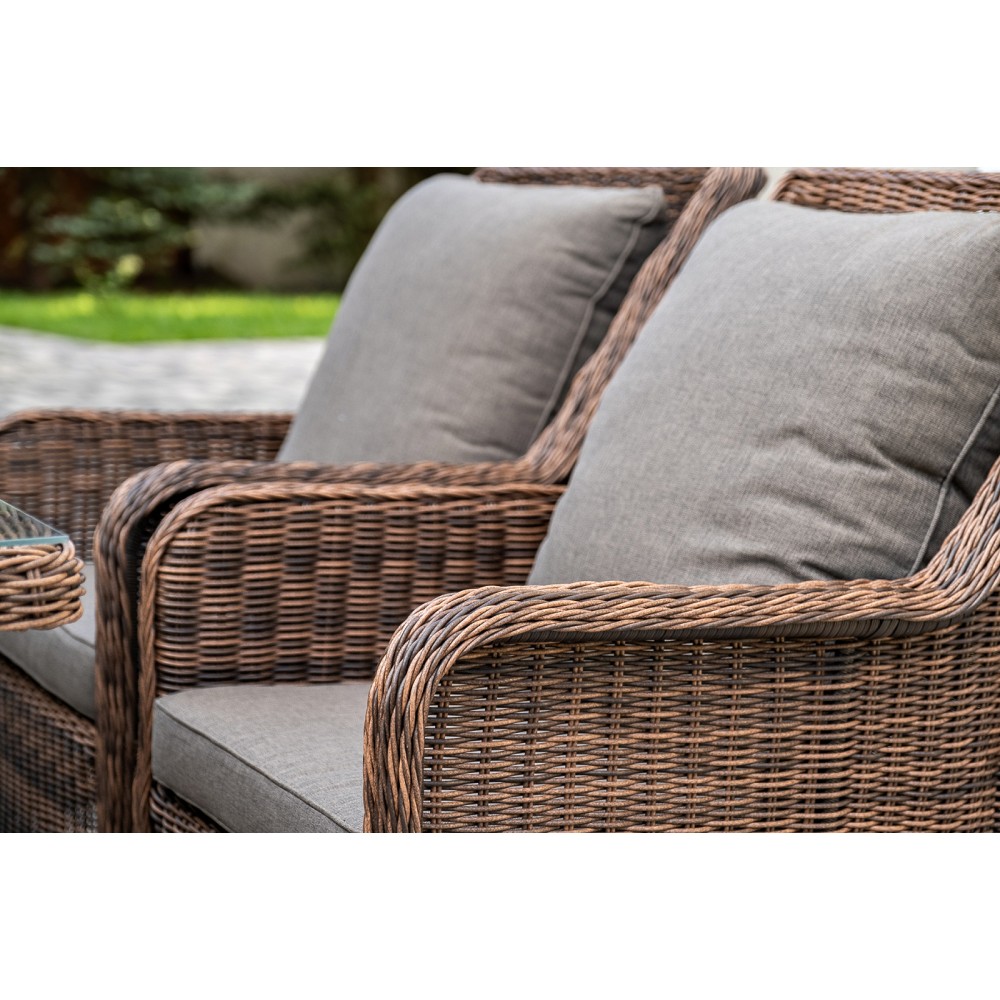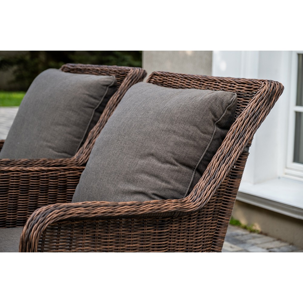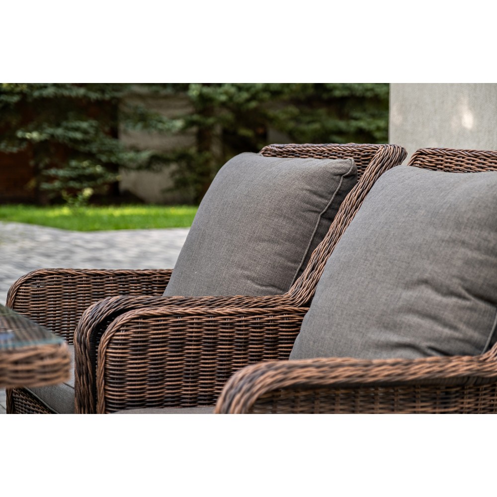 Каркас мебели алюминиевый. Он оформлен с помощью искусственного ротанга круглой формы и был оплетен ручным способом. Цвет плетение - коричневый.