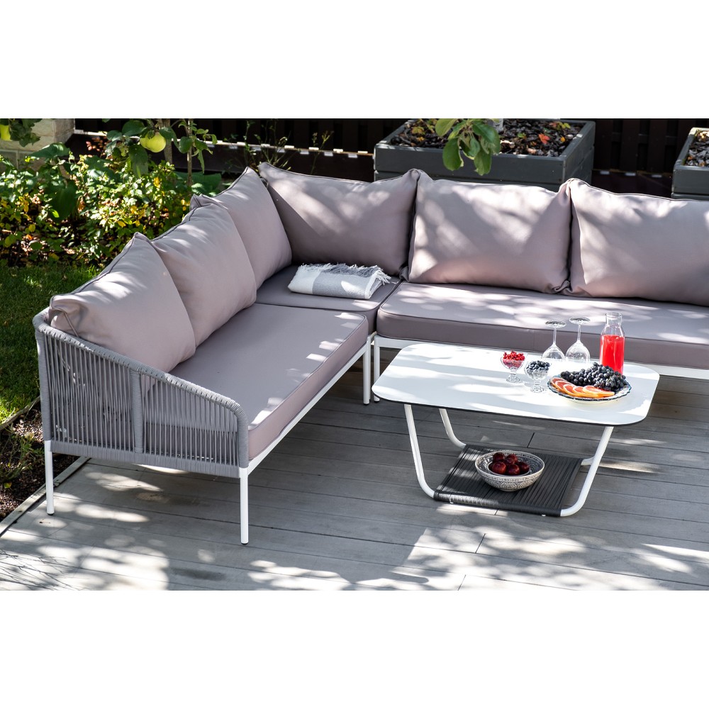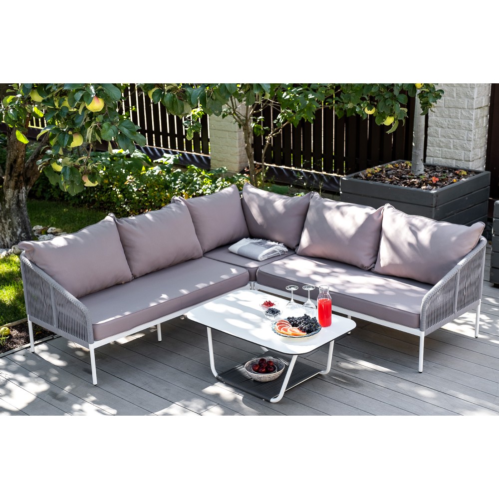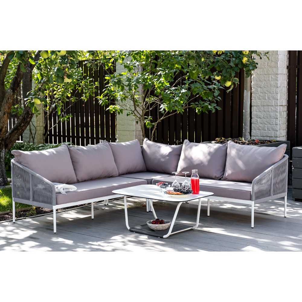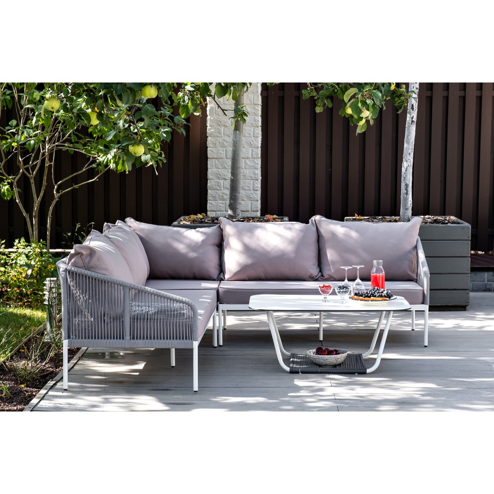 Диван идет в комплекте с мягкими подушками в чехлах "Гранада" журнальный стол 90х60см из HPL, цвет "молочный", каркас белый муар, роуп темно-серый круглый 1шт. 900Х600Х420, "Канны" левый модуль плетеный из роупа, каркас алюминий светло-серый (RAL7035) шагрень, роуп серый круглый, ткань серая 017 1шт. 1 480Х850Х750, "Канны" правый модуль плетеный из роупа, каркас алюминий светло-серый (RAL7035) шагрень, роуп серый круглый, ткань серая 017 1шт. 1 480Х850Х750, "Канны" угловой модуль плетеный из роупа, каркас алюминий светло-серый (RAL7035) шагрень, роуп серый круглый, ткань серая 017 1шт. 850Х850Х750,