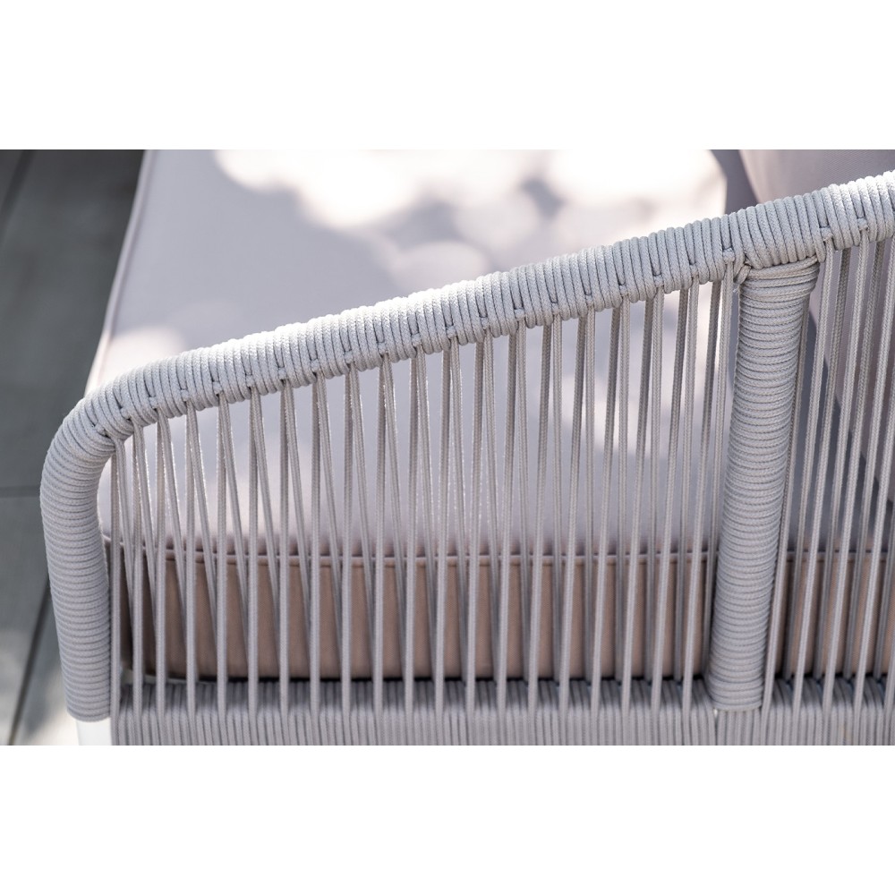 Каркас уличной мебели выполнен из износостойкого алюминия. Его дополняет серая ручная оплетка, изготовленная на основе эластичных синтетических лент из полиэфирных волокон высокой прочности (роупа).